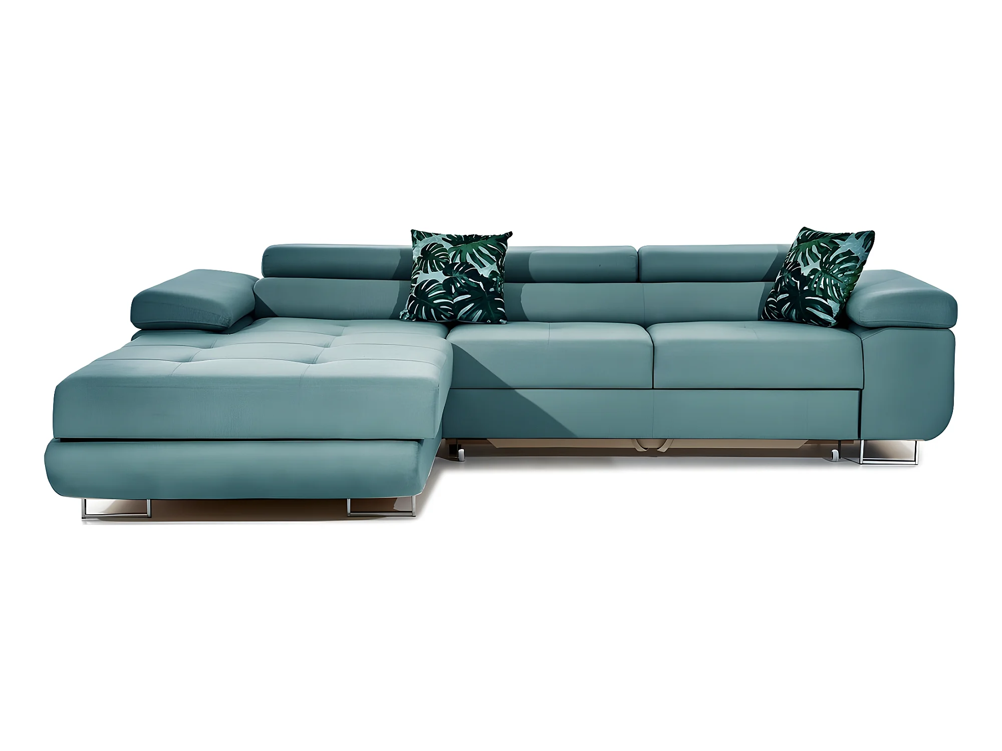 Canapé d'angle convertible ARMEL en tissu luxe 5 places, bleu, avec coffre, angle gauche (vu de face)