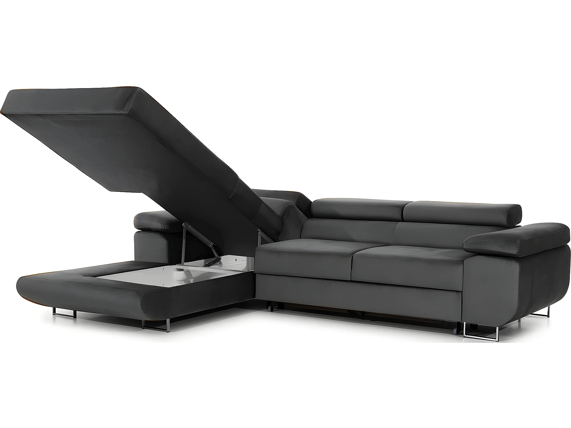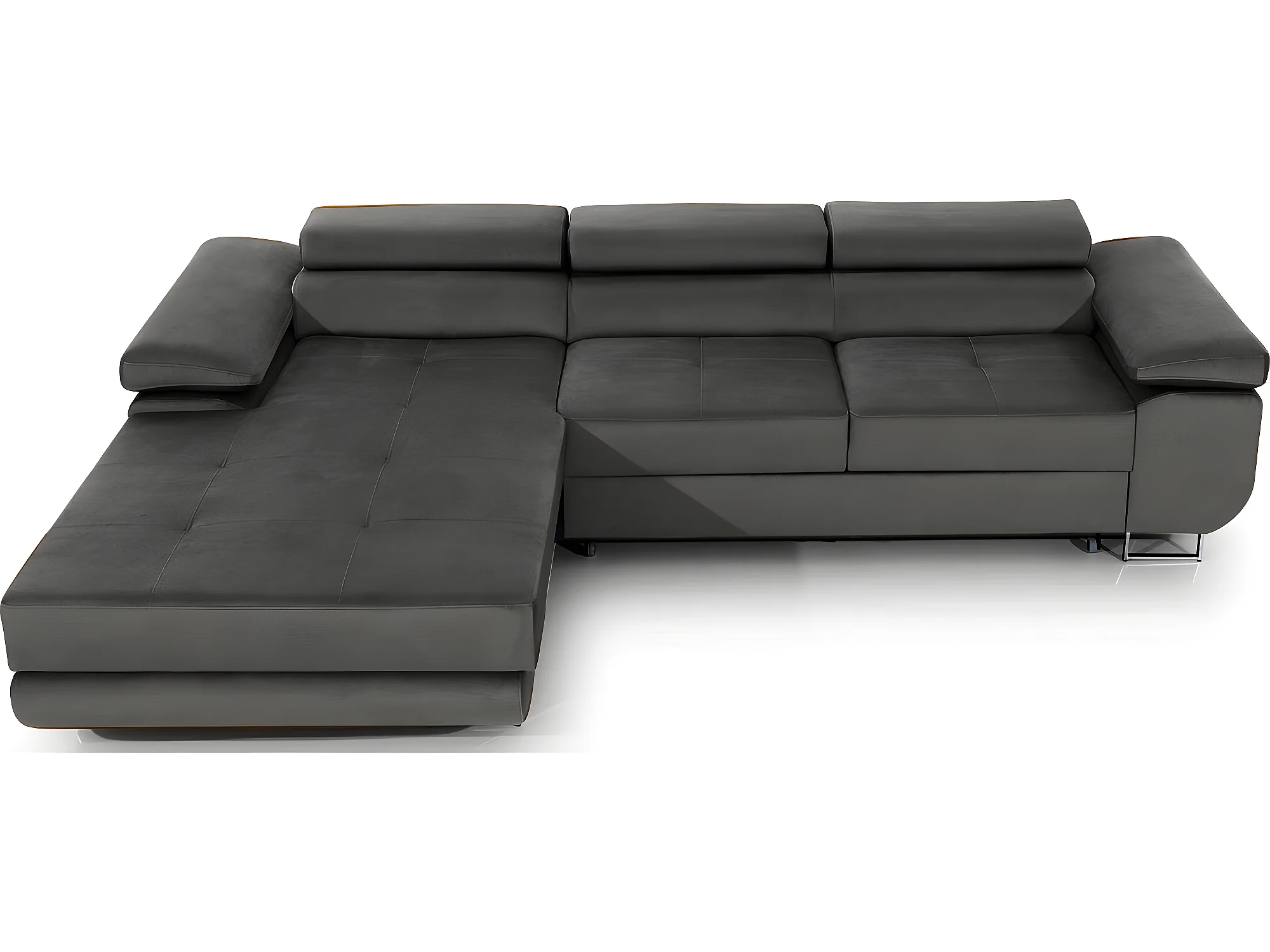 Canapé d'angle convertible ARMEL en tissu velours luxe 5 places, couleur gris anthracite, avec coffre, angle gauche (vu de face)