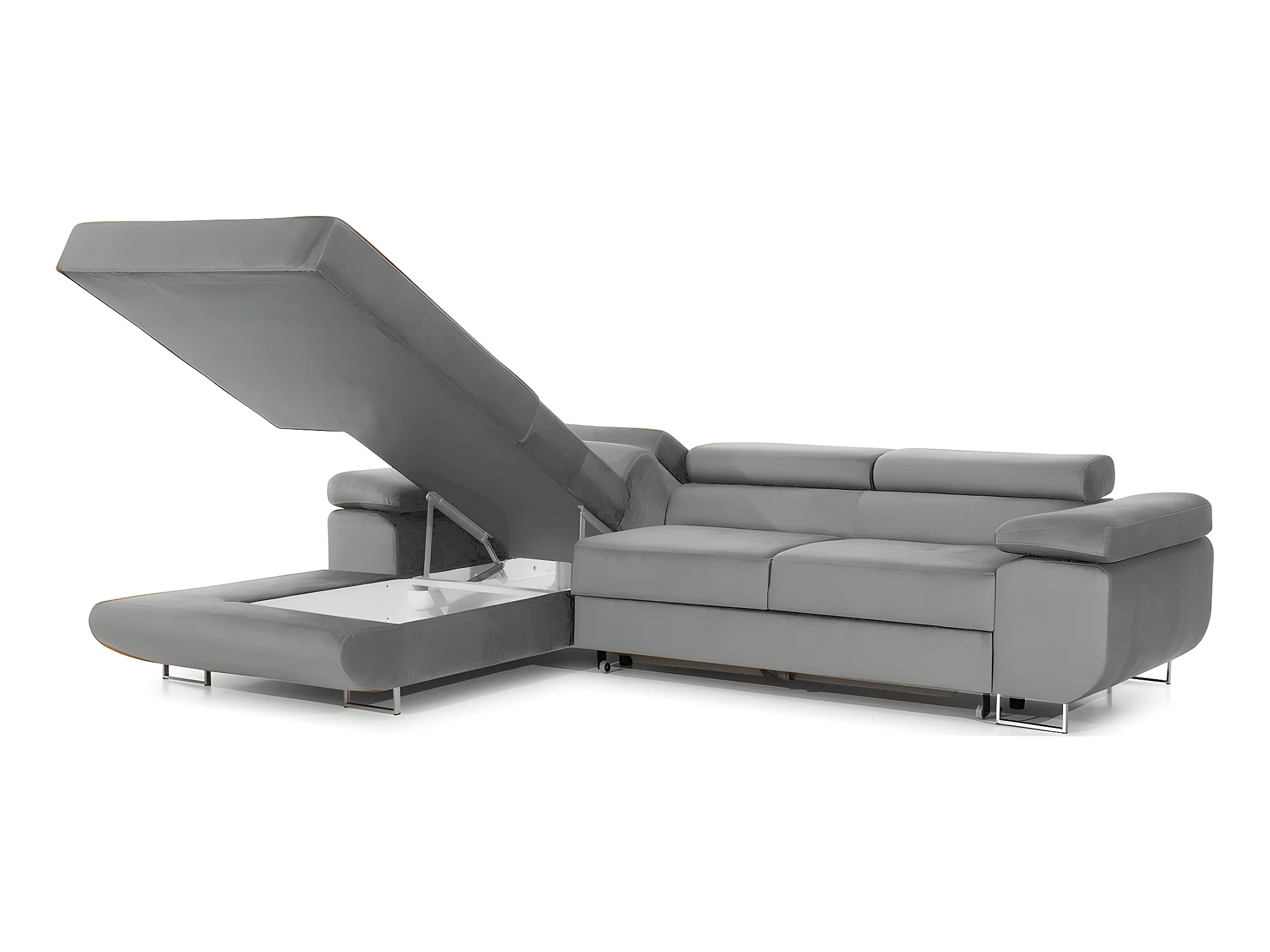 Canapé d'angle convertible ARMEL en tissu velours luxe 5 places, couleur gris, avec coffre, angle gauche (vu de face)