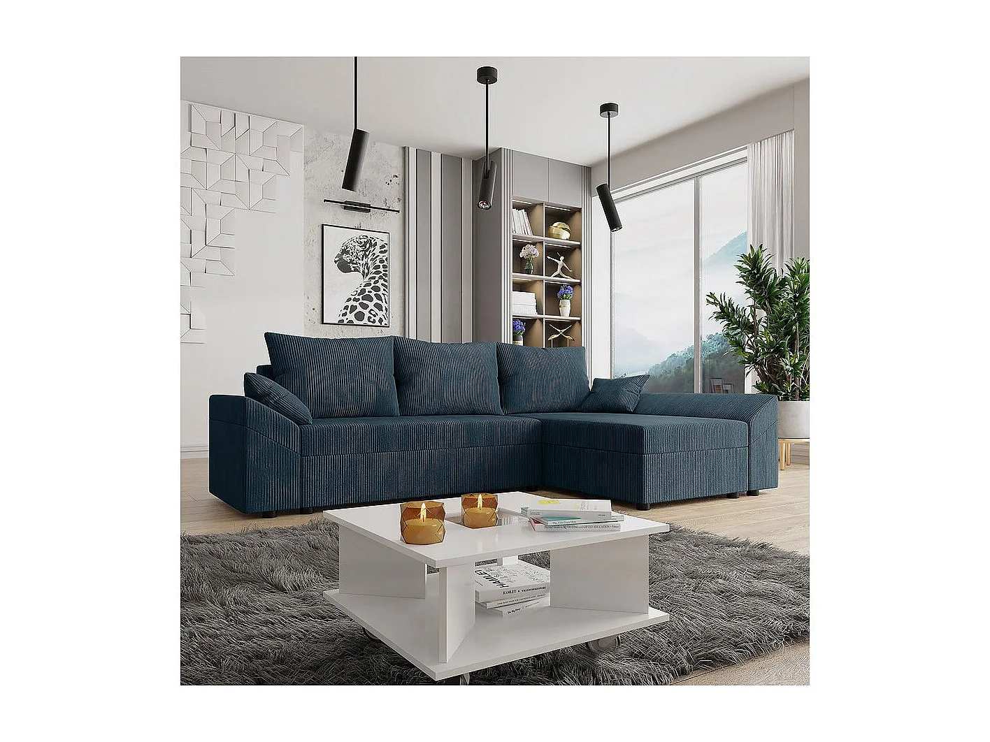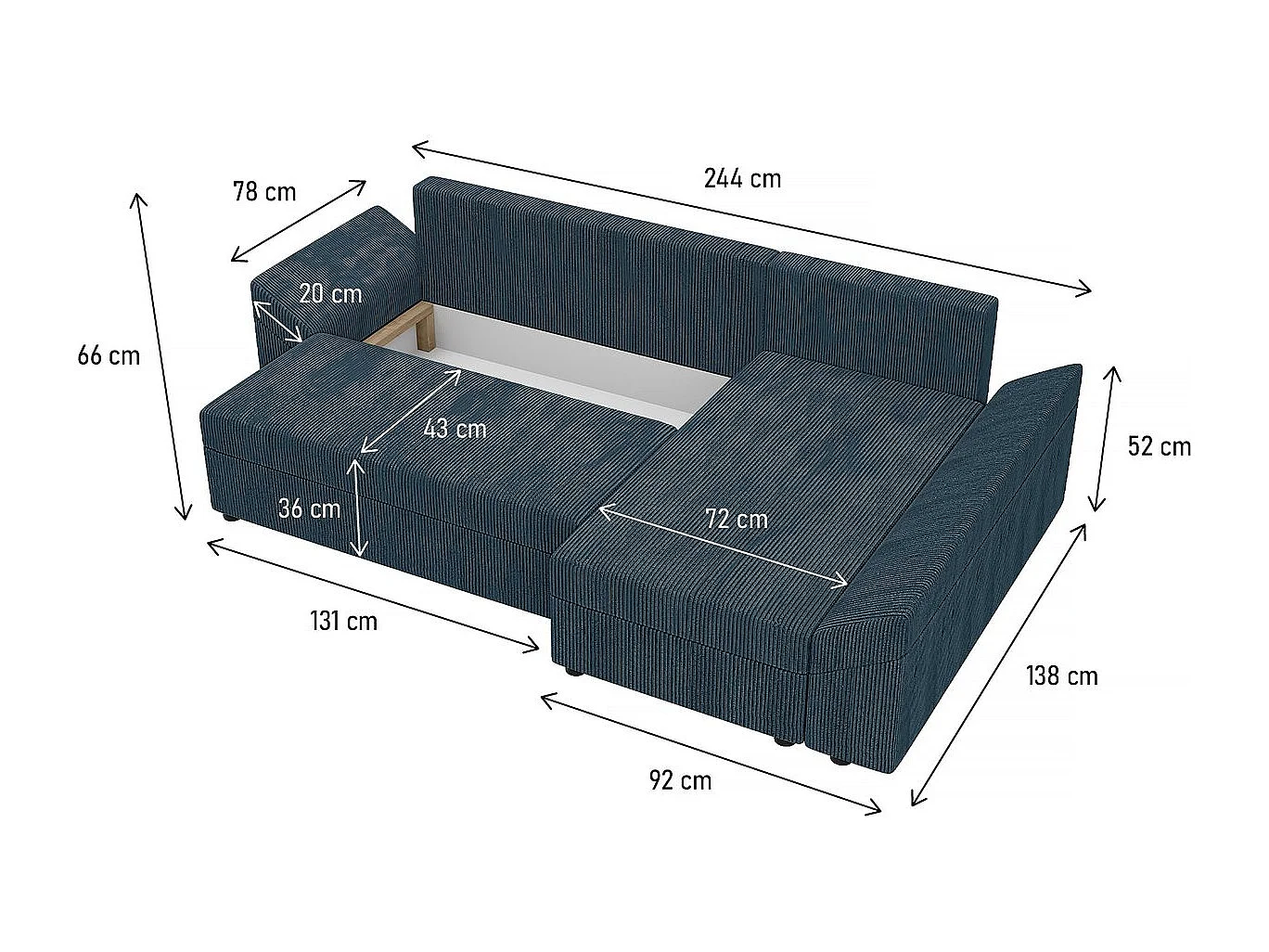 Canapé d'angle convertible avec coffre "Vaugirard" en velours côtelé - 3 places - Bleu