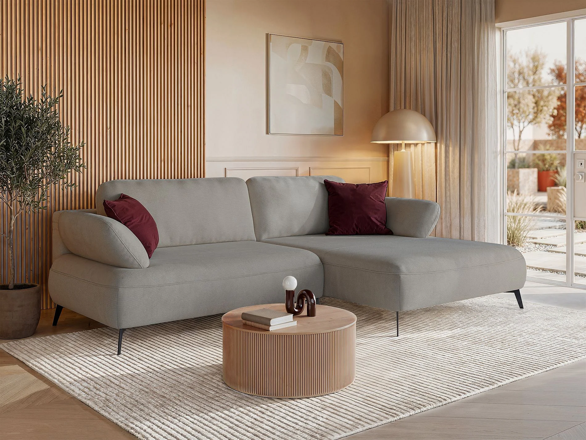 Canapé d’angle convertible – coffre de rangement – chenille hydrofuge – côté droit – gris beige – AVOLLA