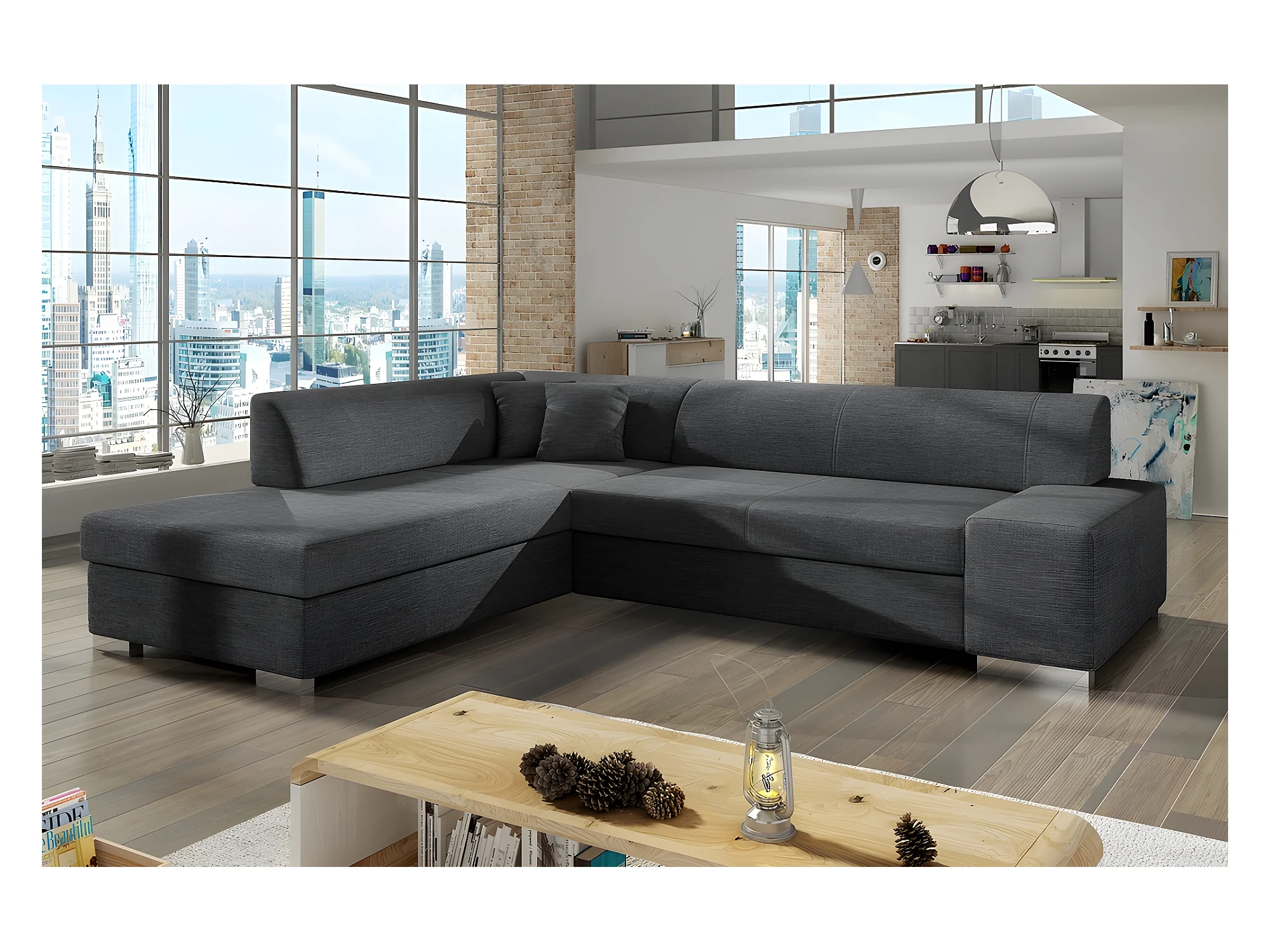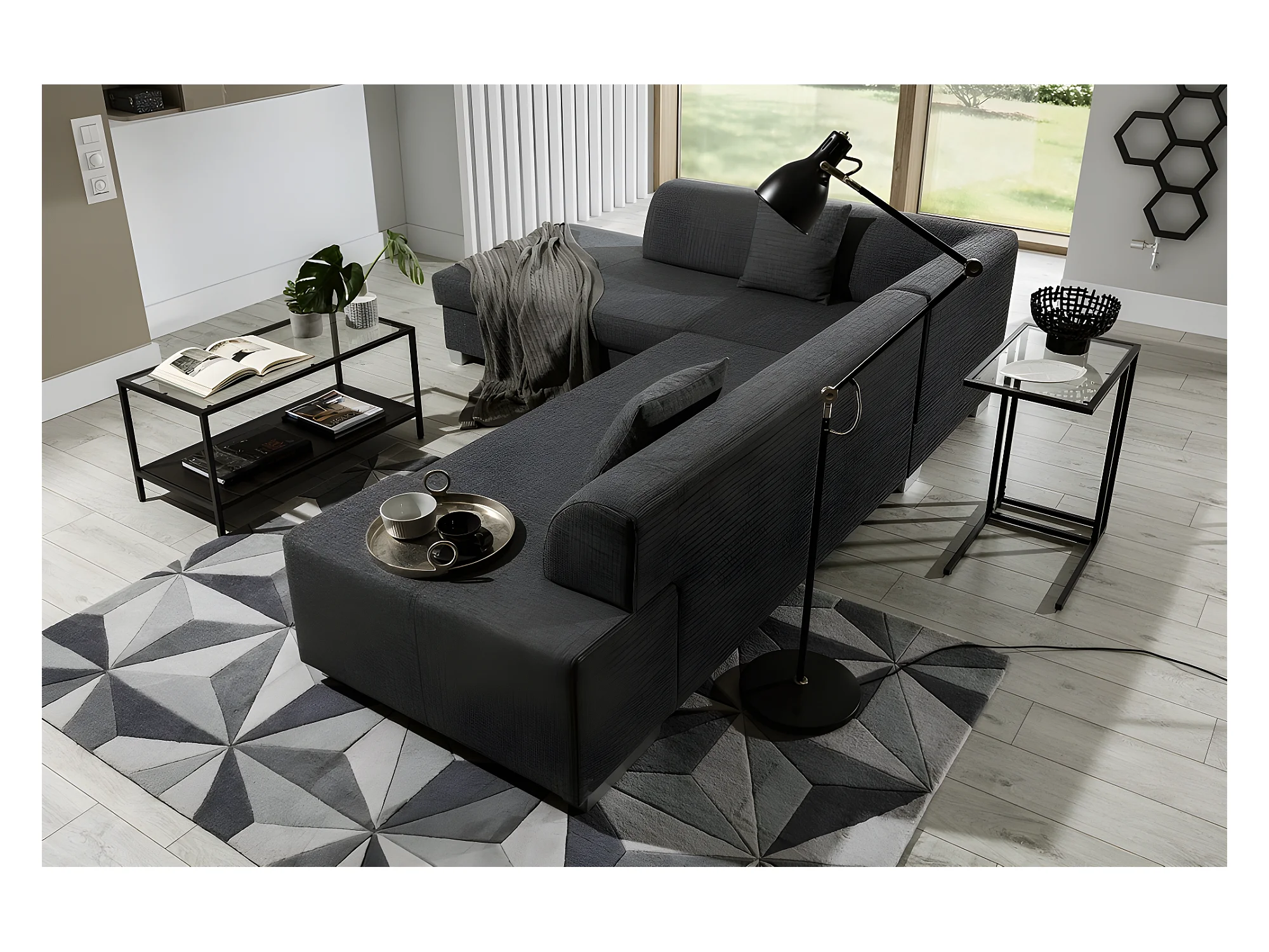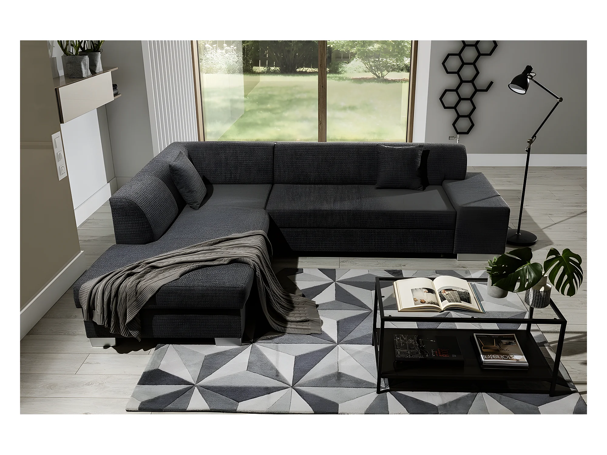 Canapé d'angle convertible en tissu luxe 5 places, coffre - gris foncé, angle gauche (vu de face), PORTOFINO