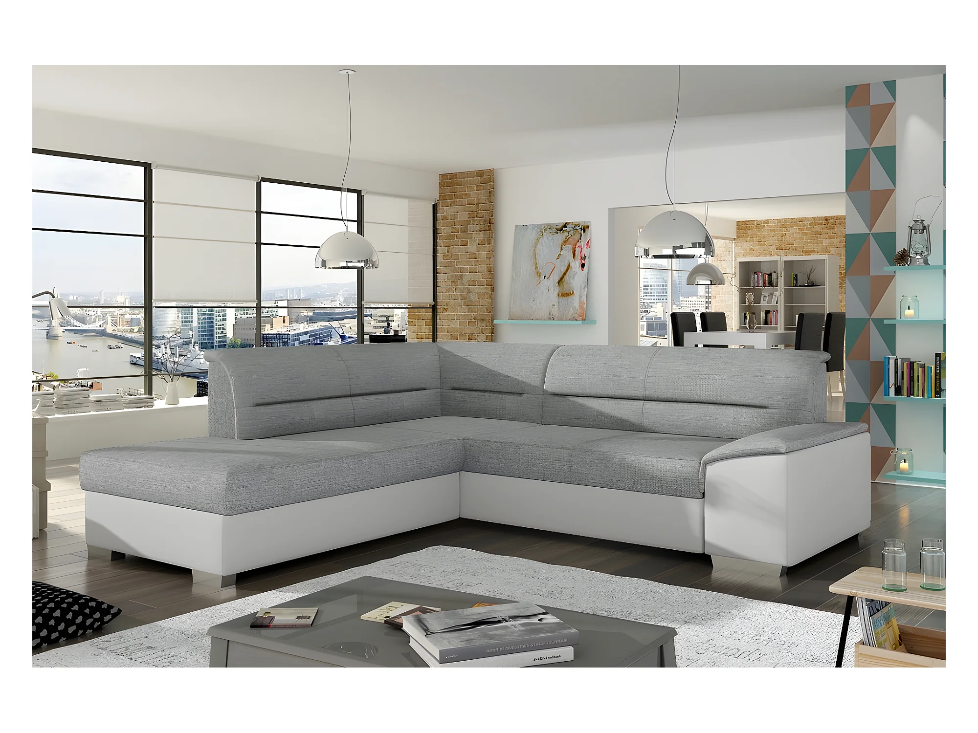 Canapé d'angle convertible en tissu luxe gris et simili cuir blanc cassé, 5 places, avec coffre, angle gauche (vu de face), VERTU MIX