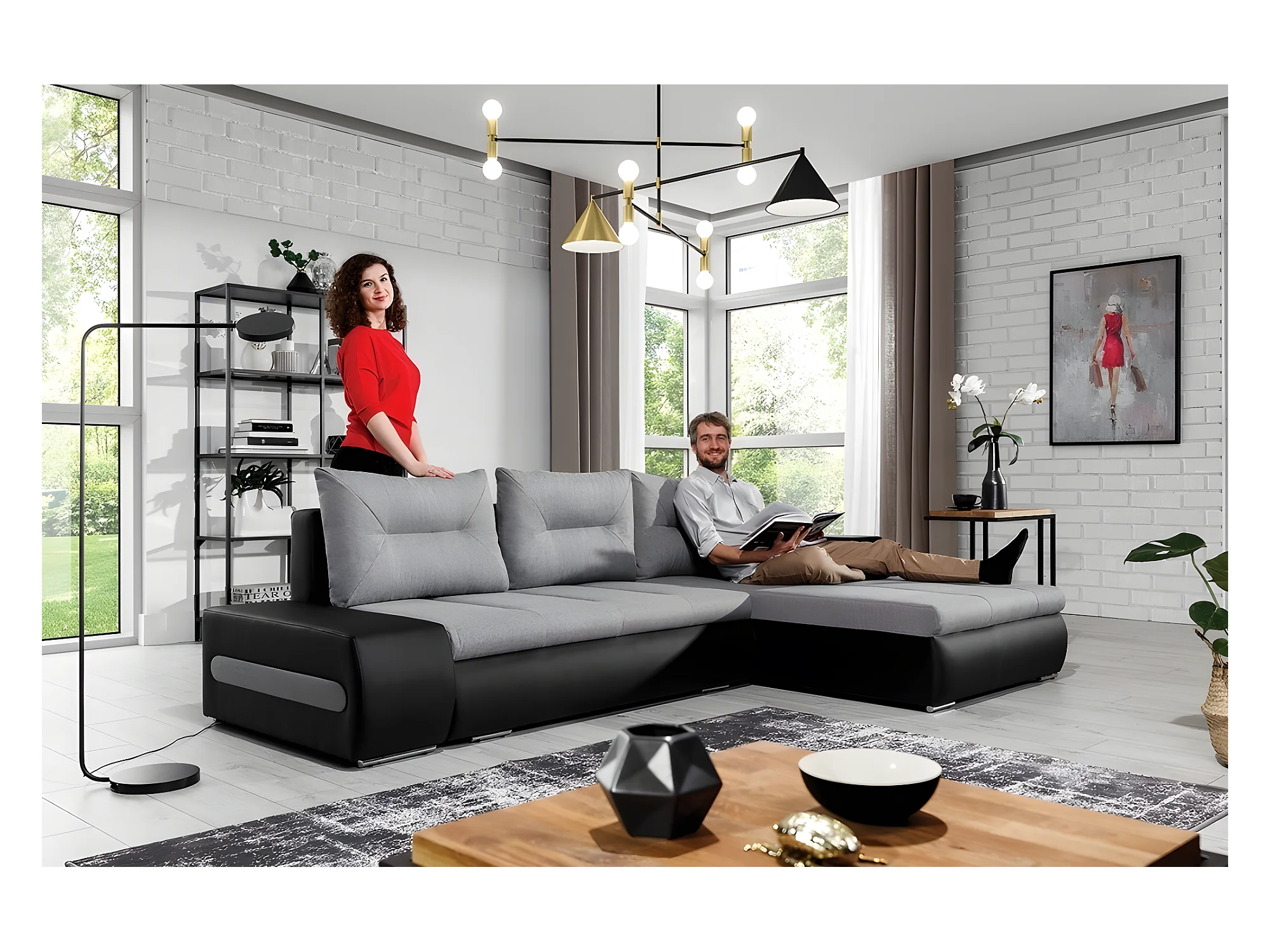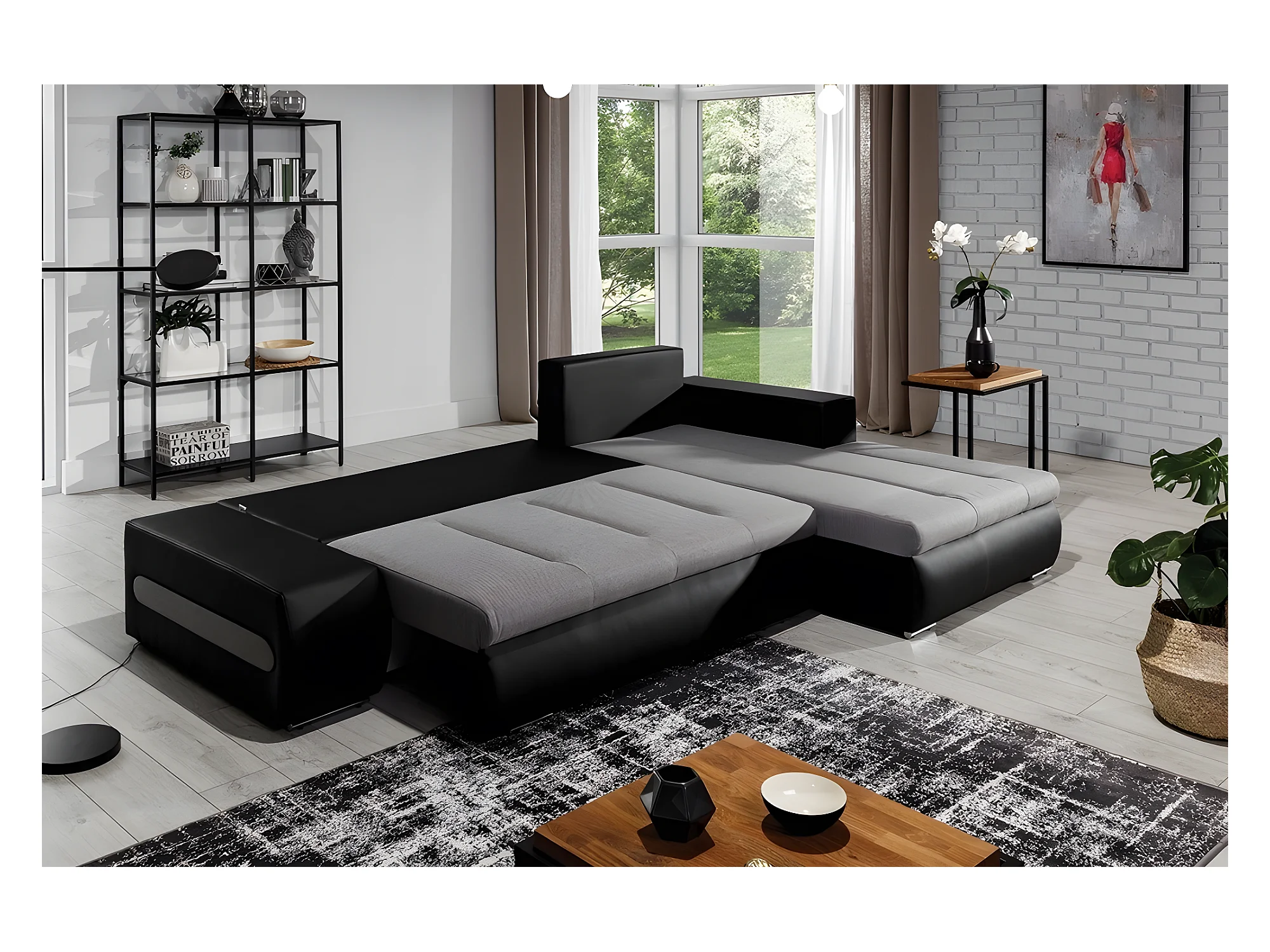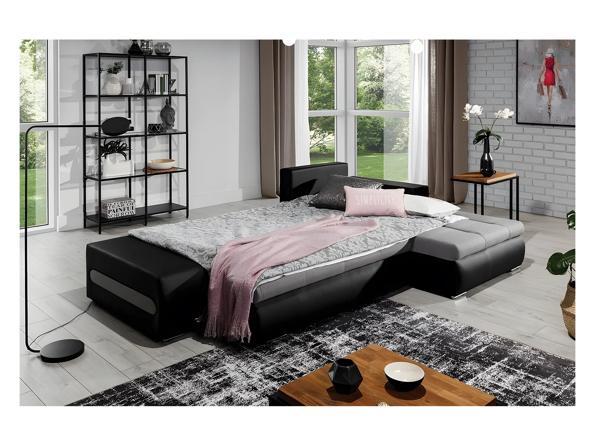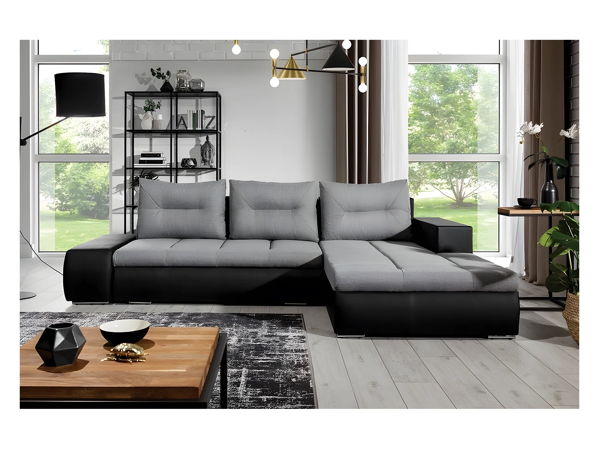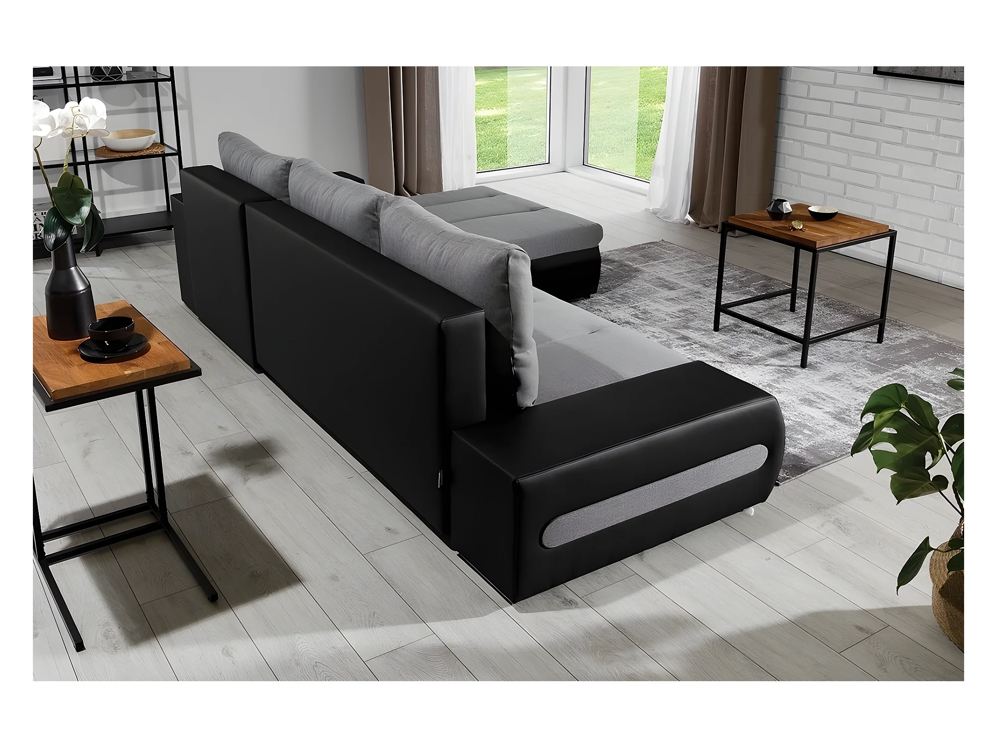 Canapé d'angle convertible en tissu luxe gris et simili cuir noir, 5 places, angle droit (vu de face) - OTELLO