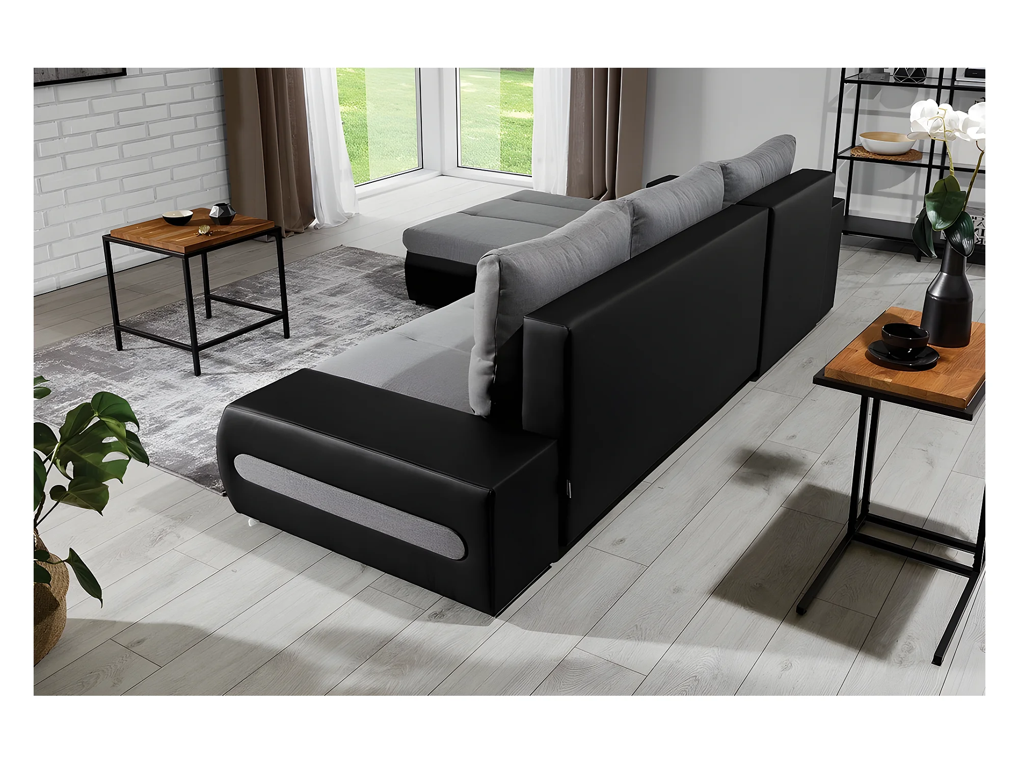 Canapé d'angle convertible en tissu luxe gris et simili cuir noir, 5 places, angle gauche (vu de face) - OTELLO