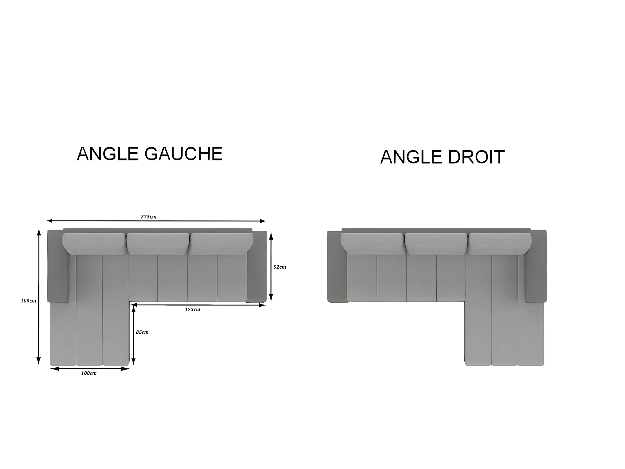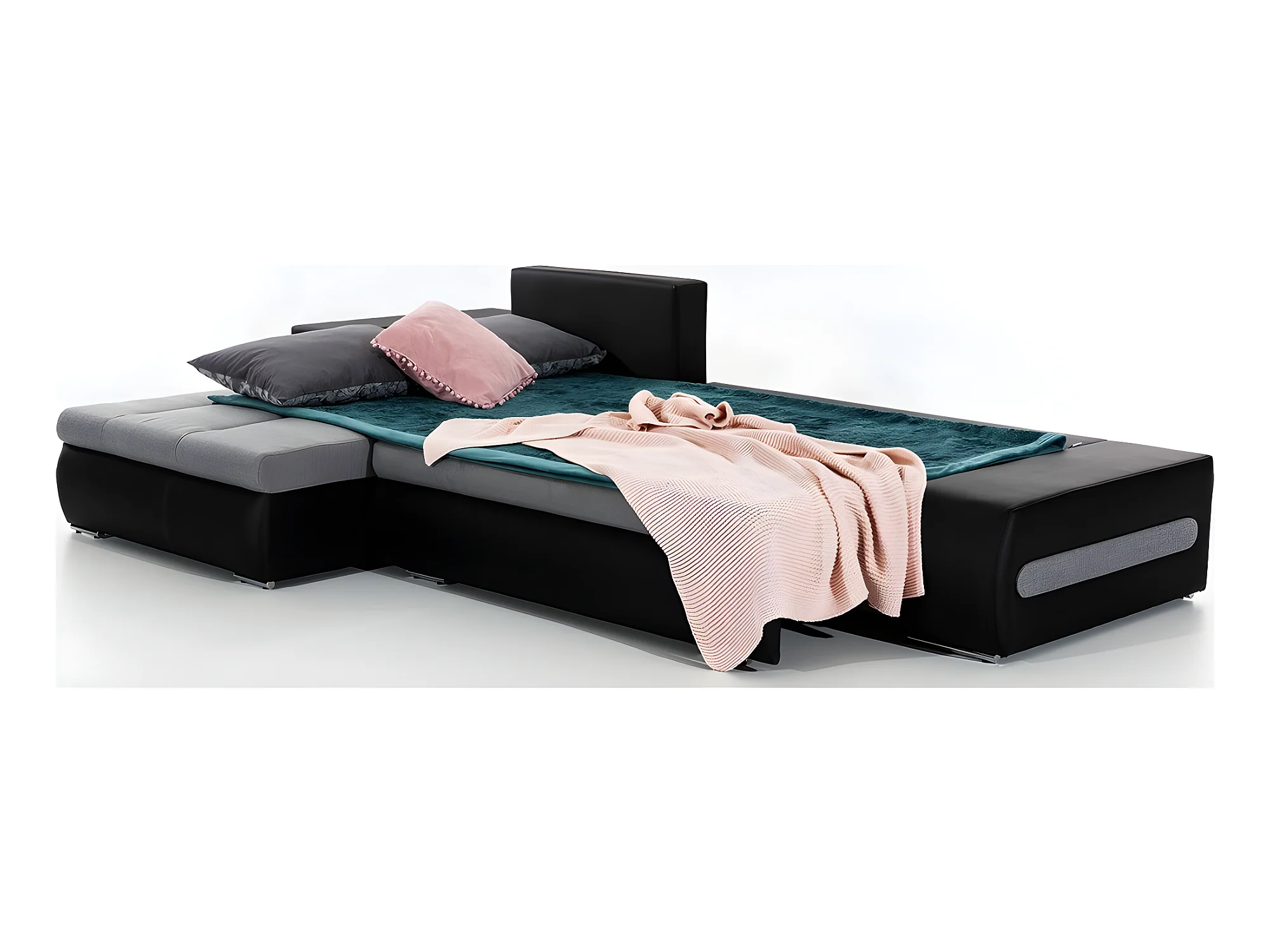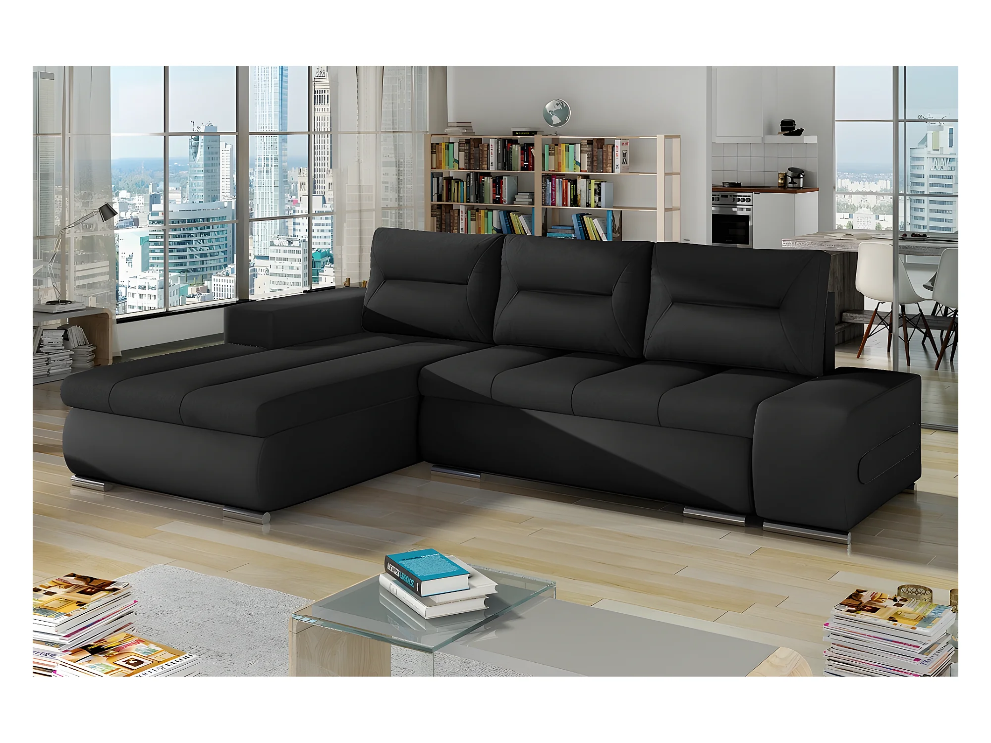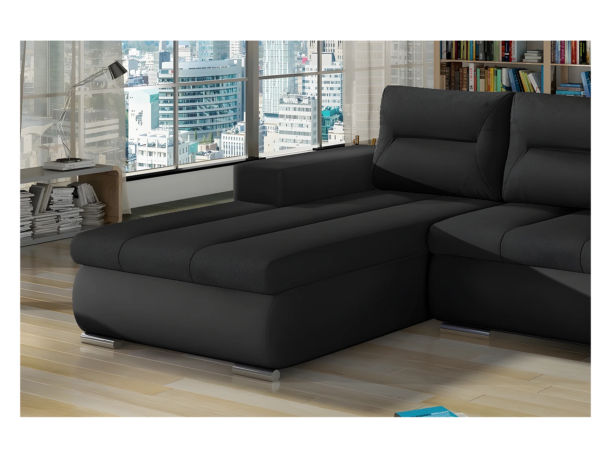 Canapé d'angle convertible en tissu luxe noir et simili cuir noir, 5 places, angle gauche (vu de face) - OTELLO
