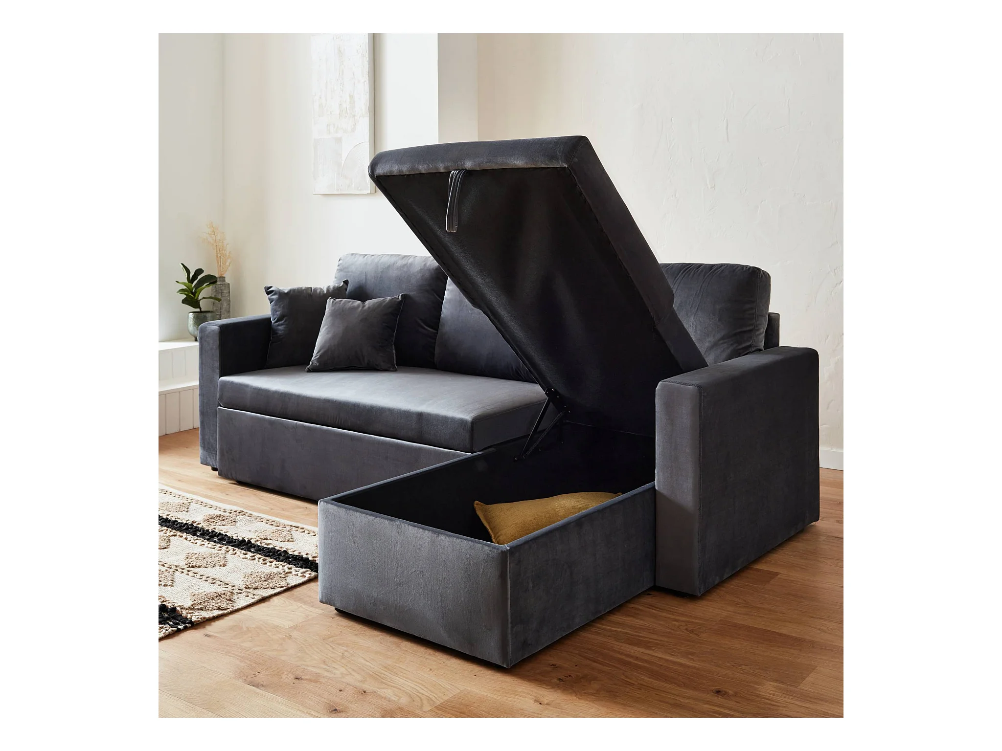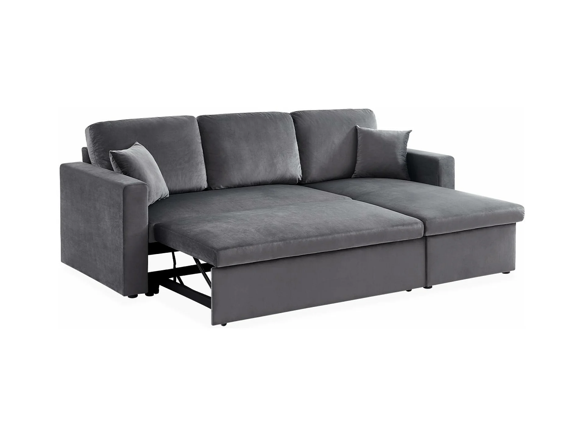 Canapé d'angle convertible en velours gris foncé 3 places. fauteuil d'angle réversible coffre rangement lit modulable