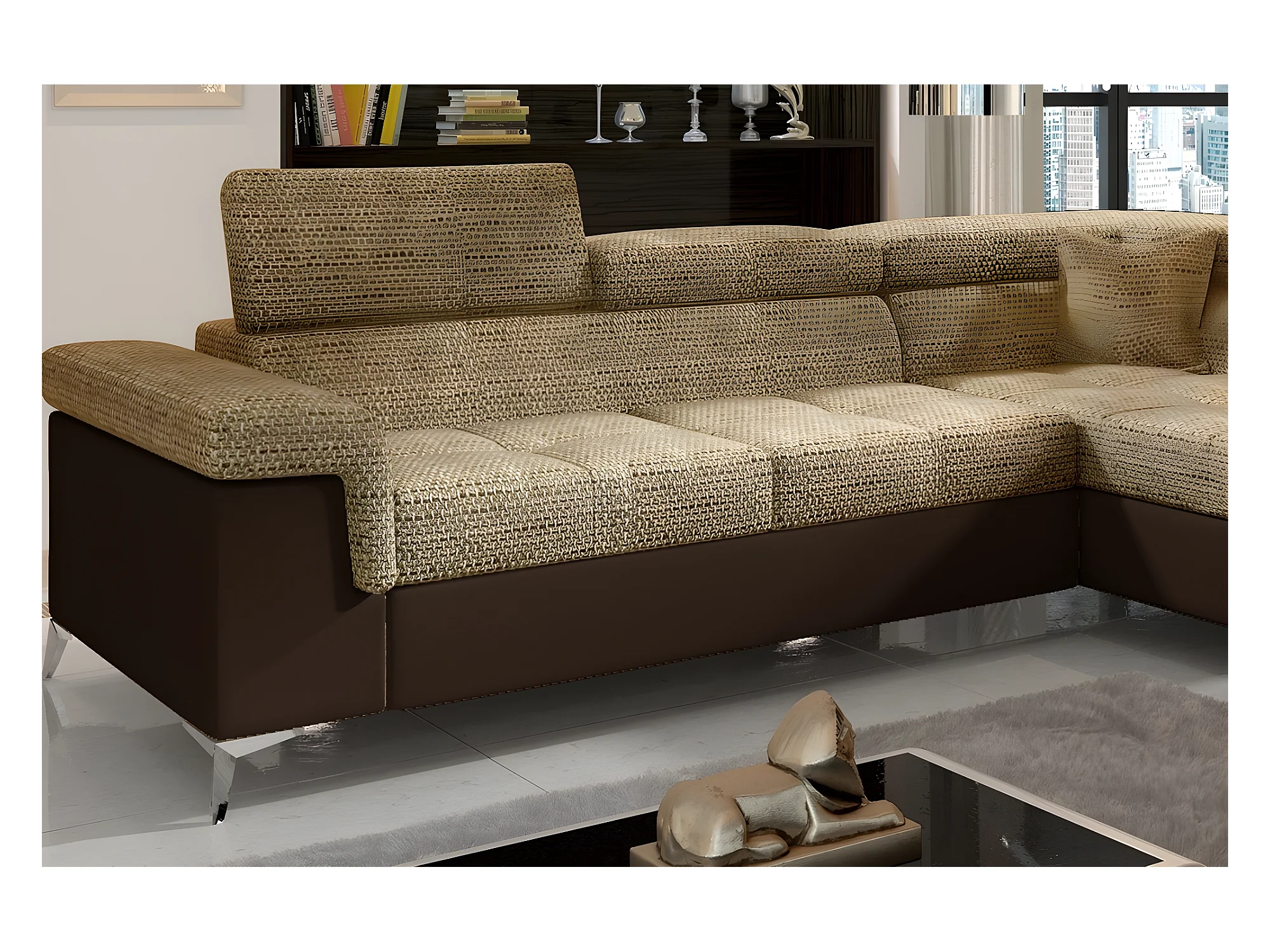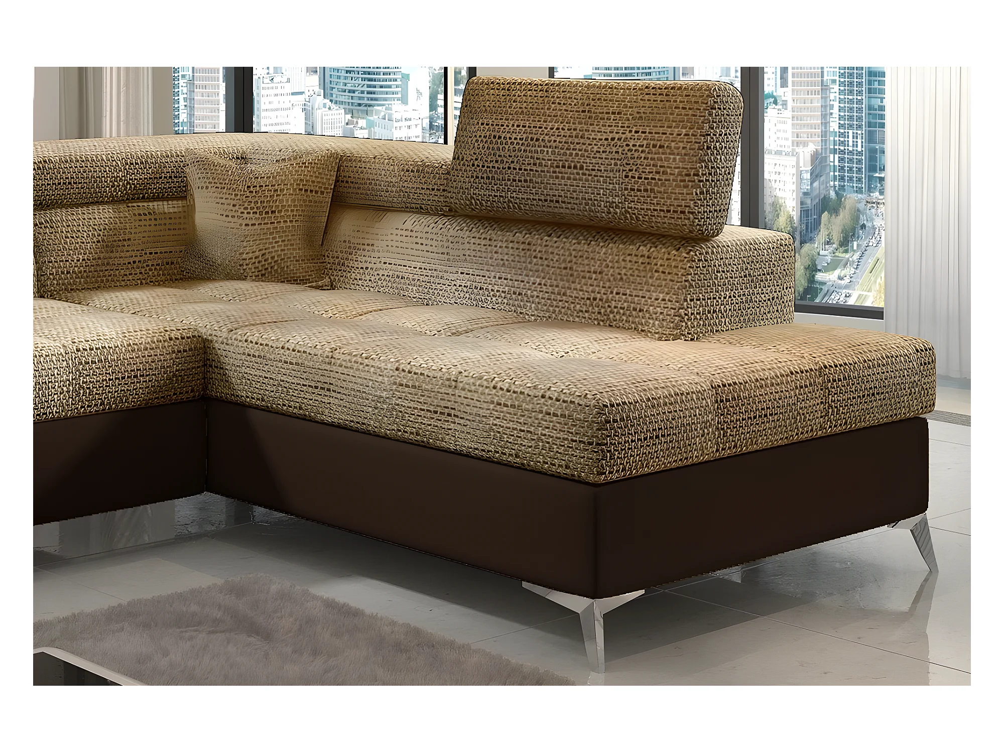 Canapé d'angle convertible - ERMAN - en tissu et simili 5 places, marron et chocolat, angle droit (vu de face)