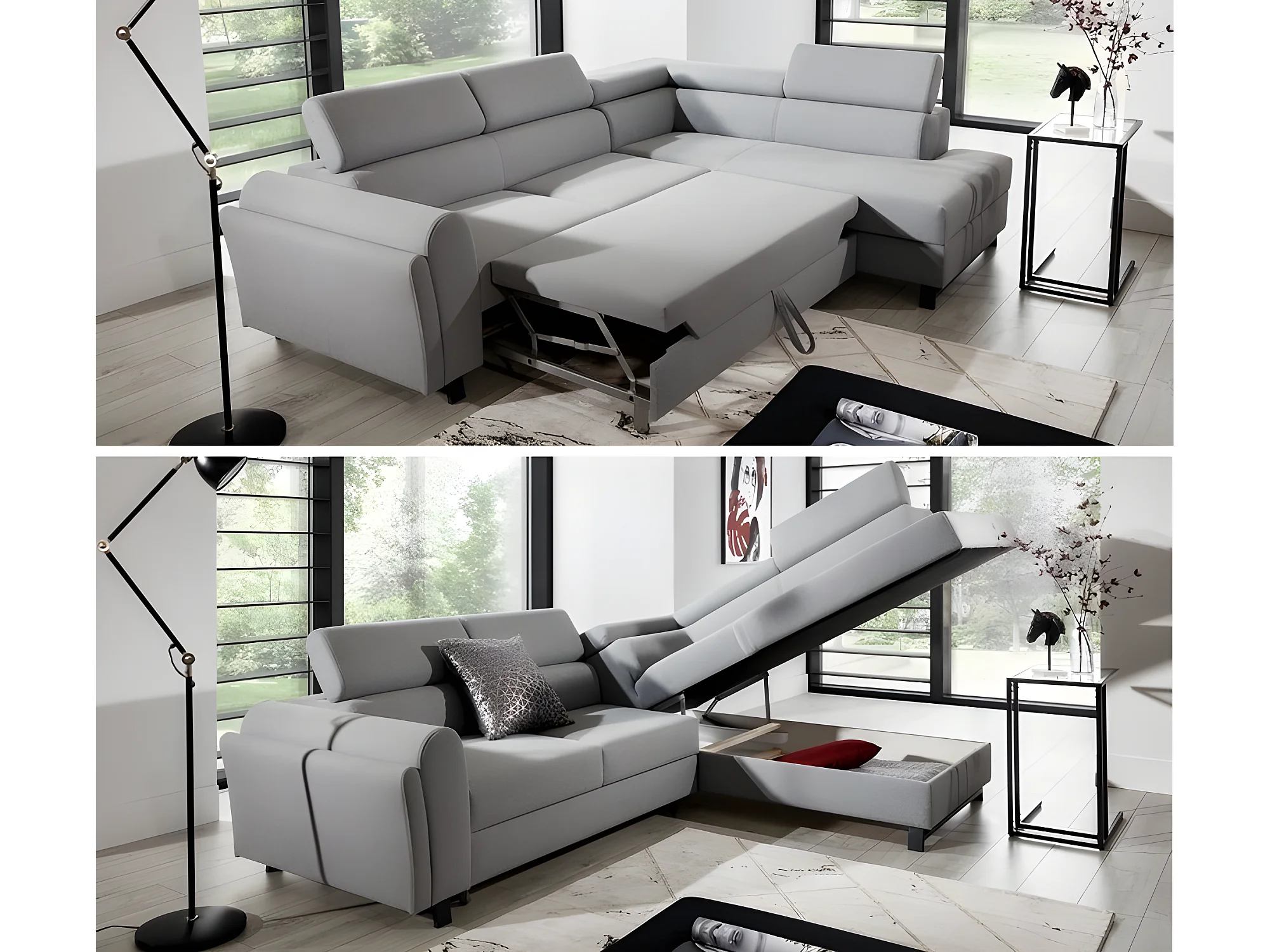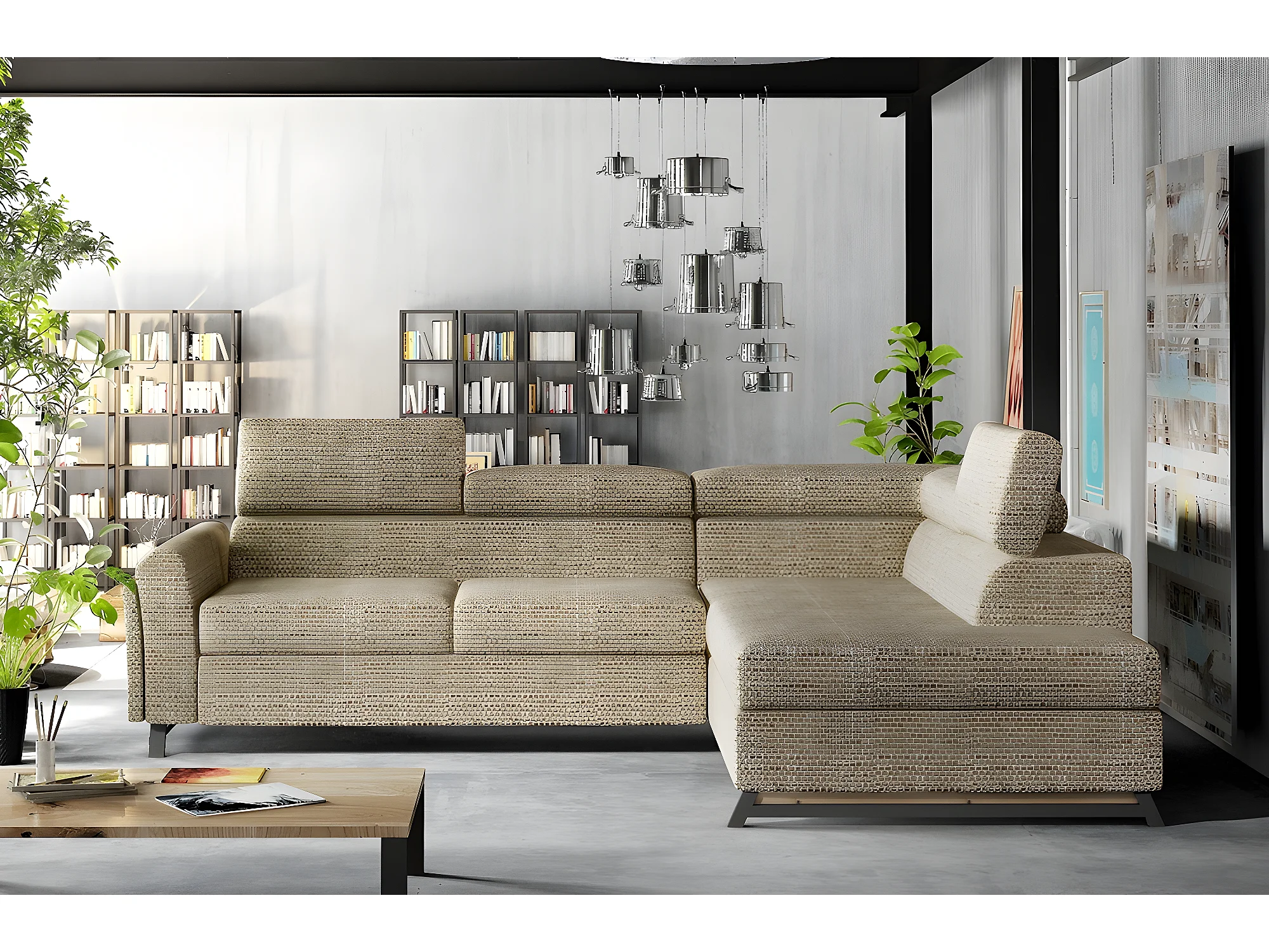 Canapé d'angle convertible - KARL - en tissu luxe 5 places, beige, angle droit (vu de face)
