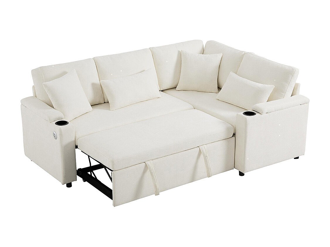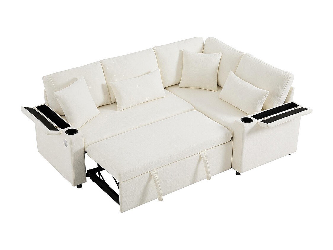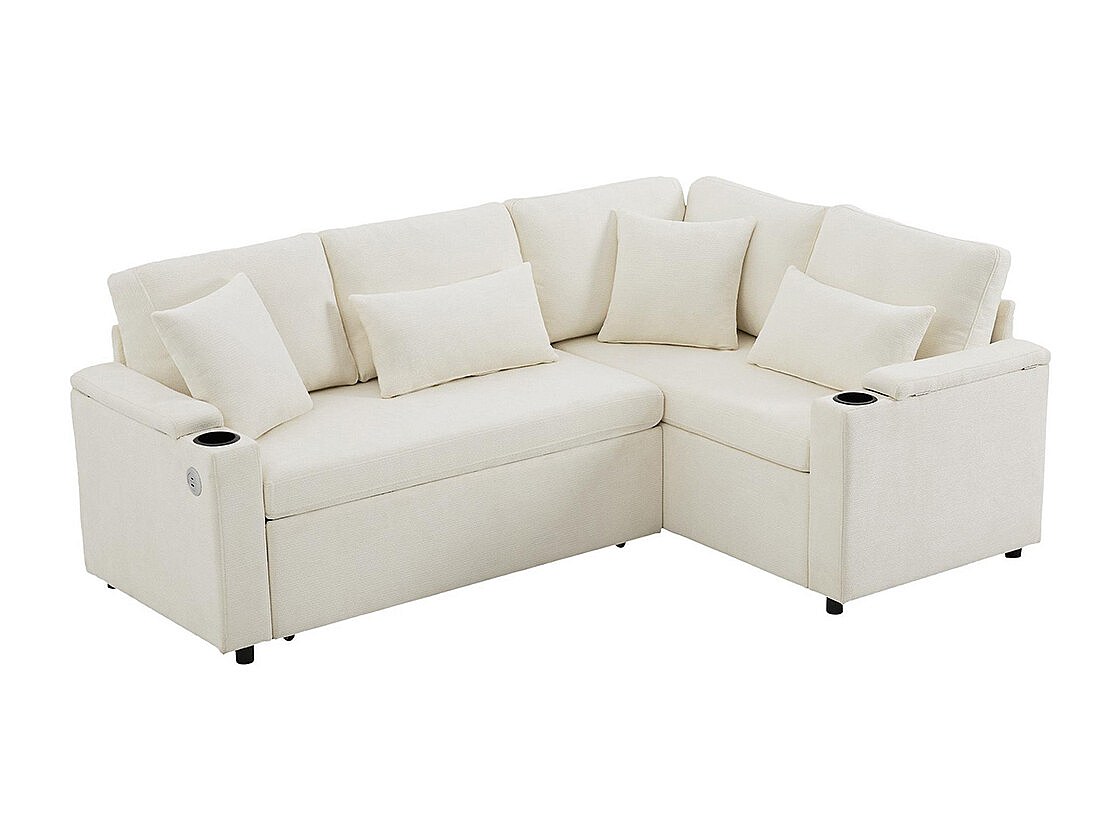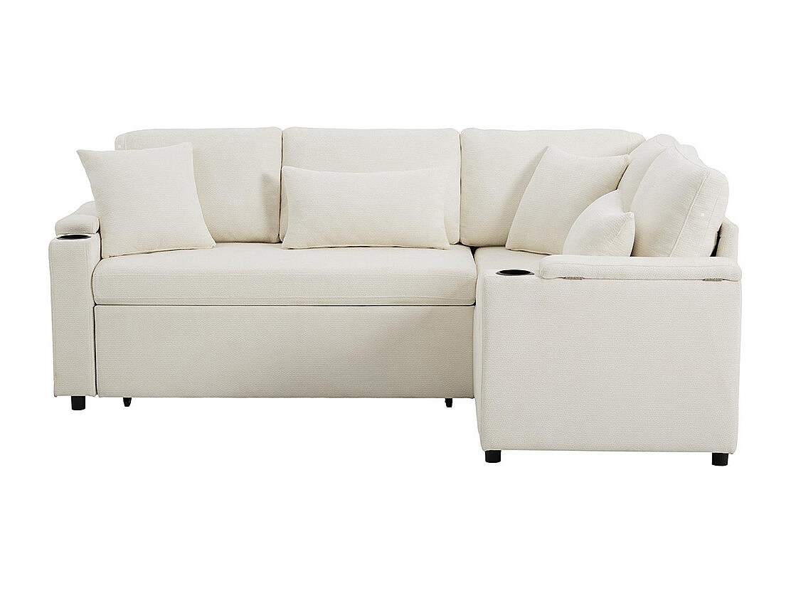 Canapé d'angle convertible L rangement porte-gobelets USB tablette accoudoir 4 coussins salon home cinéma beige