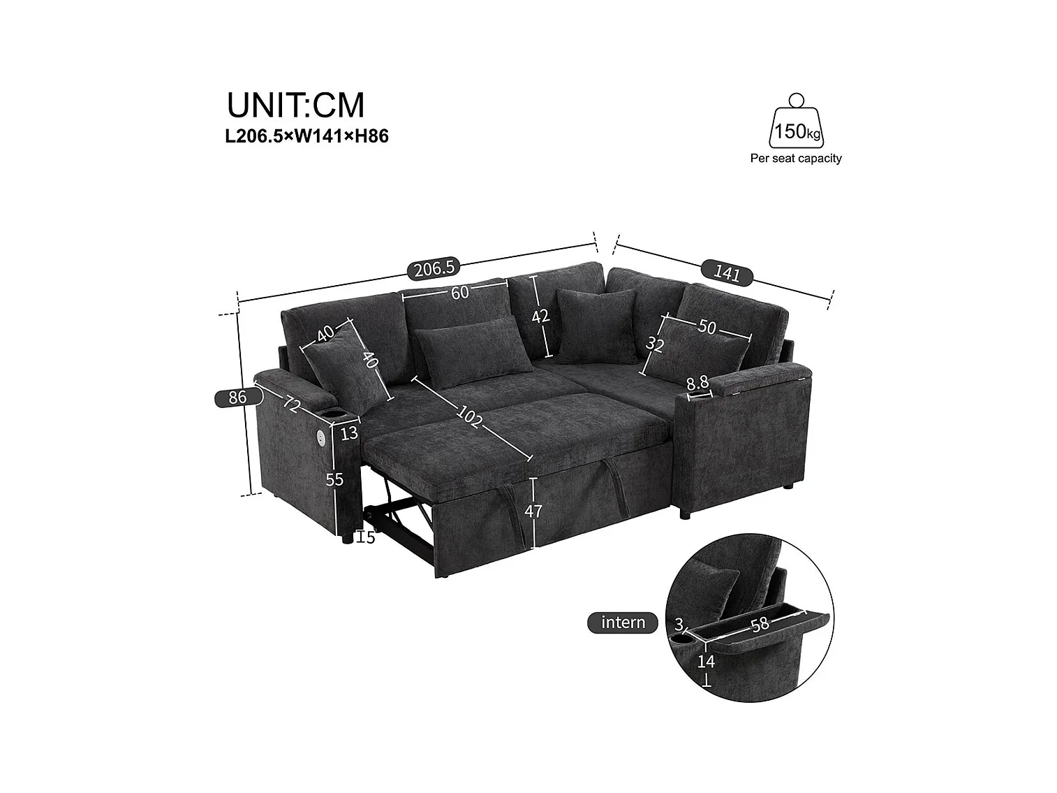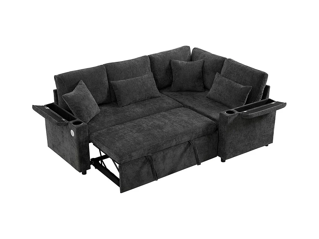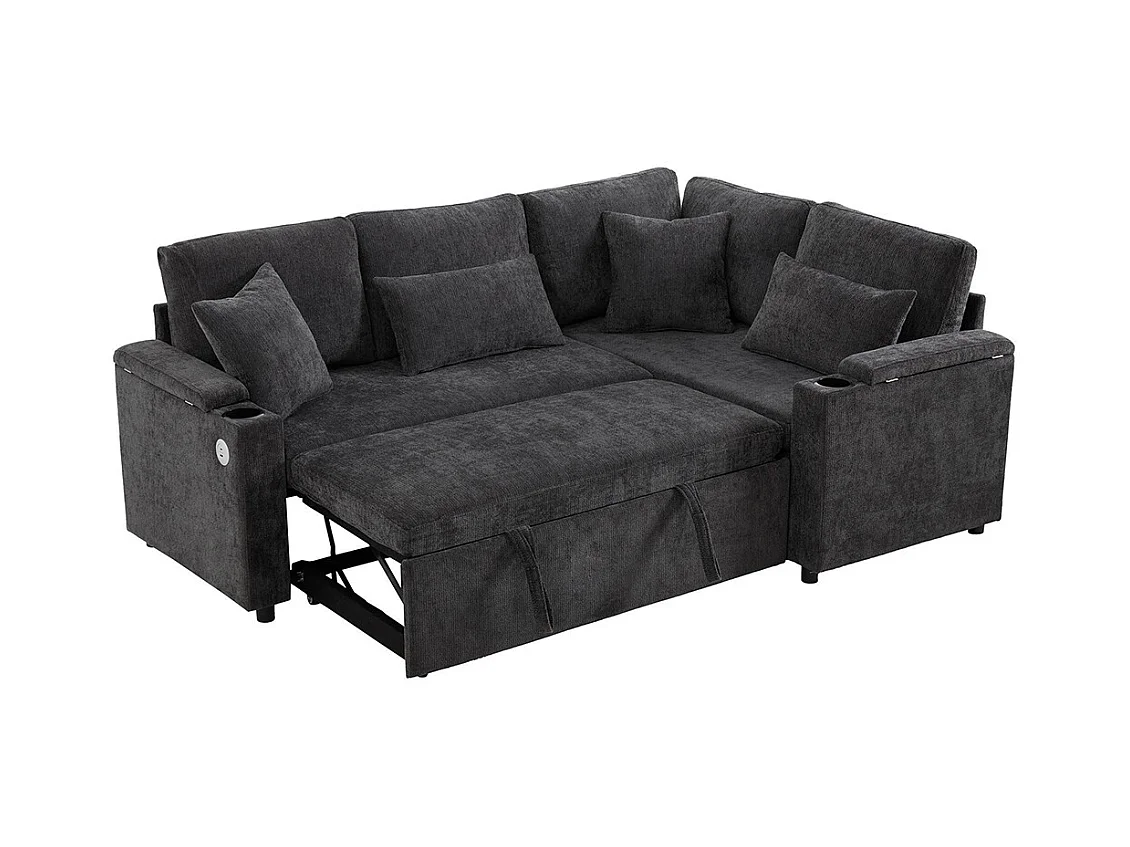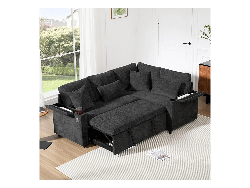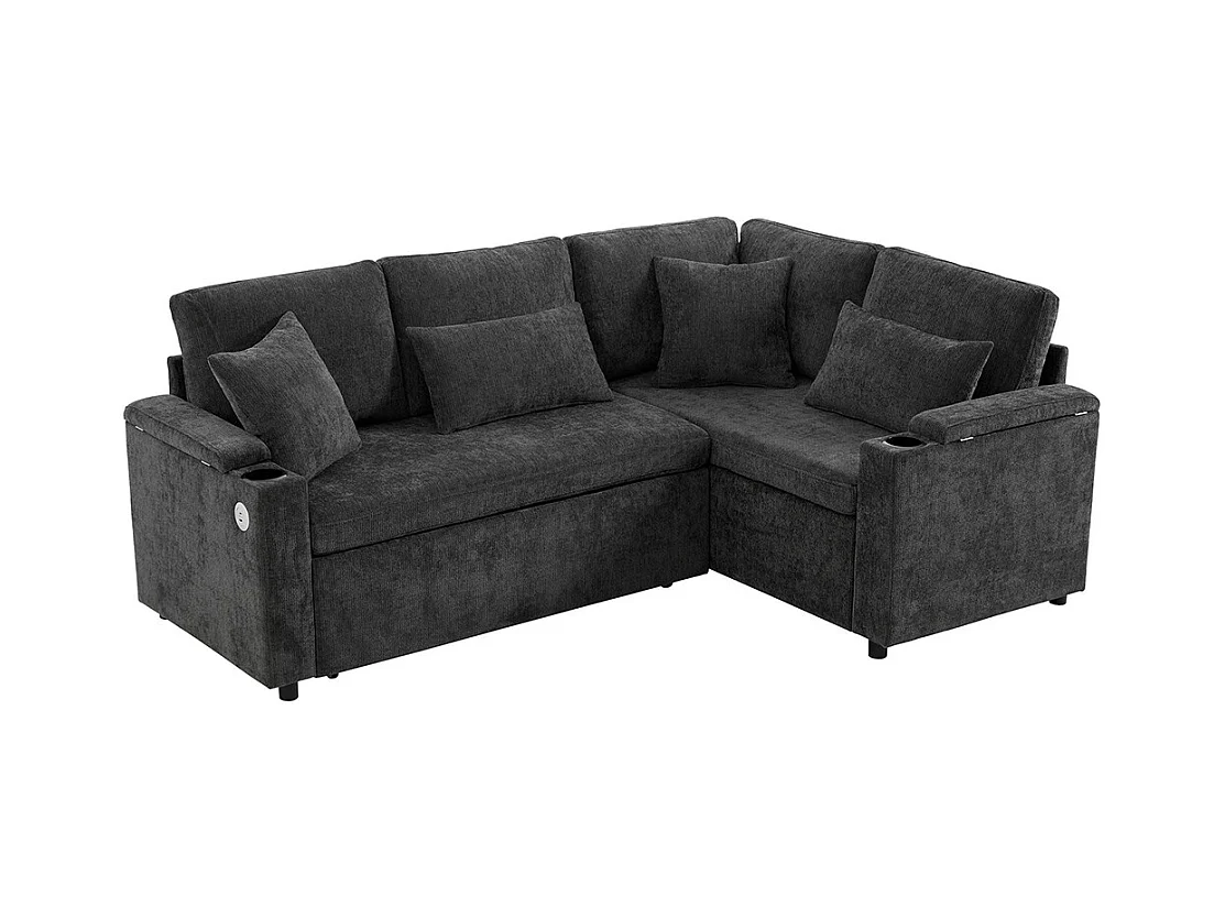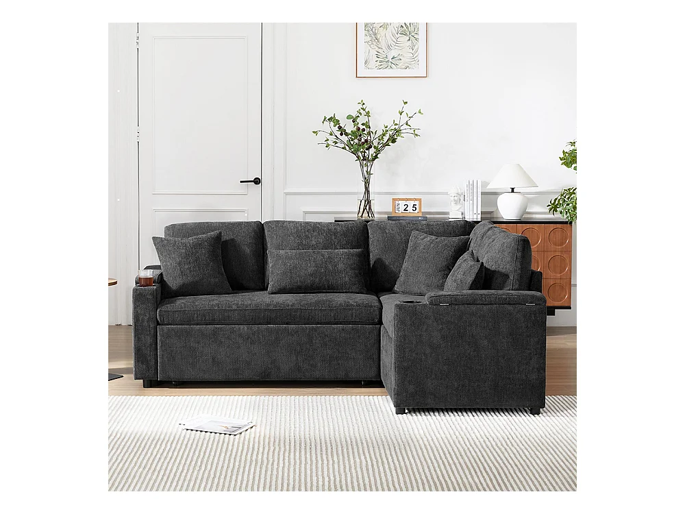 Canapé d'angle convertible L rangement porte-gobelets USB tablette accoudoir 4 coussins salon home cinéma gris foncé