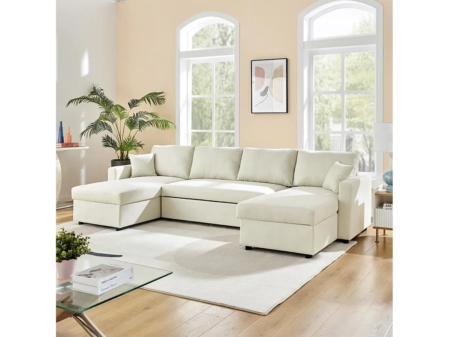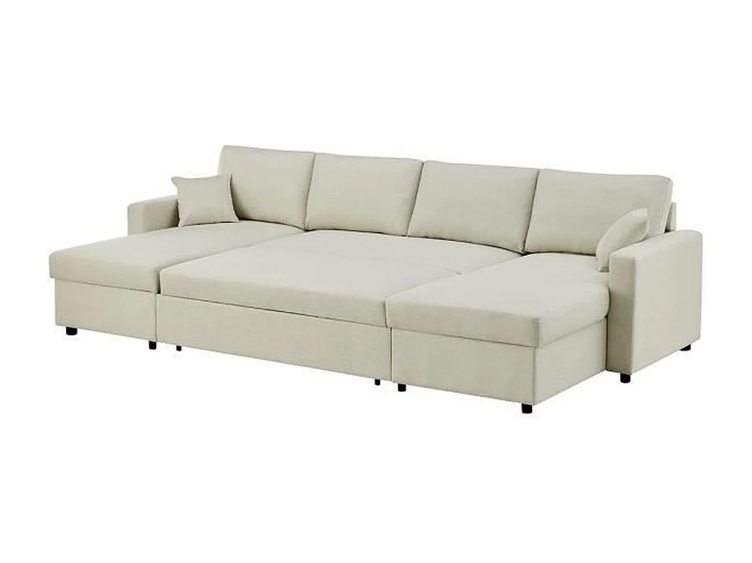 Canapé d'angle convertible panoramique + 2 coffres de rangement + 2 coussins - Tissu Beige - 300 x 148 x 83 cm - OWENS