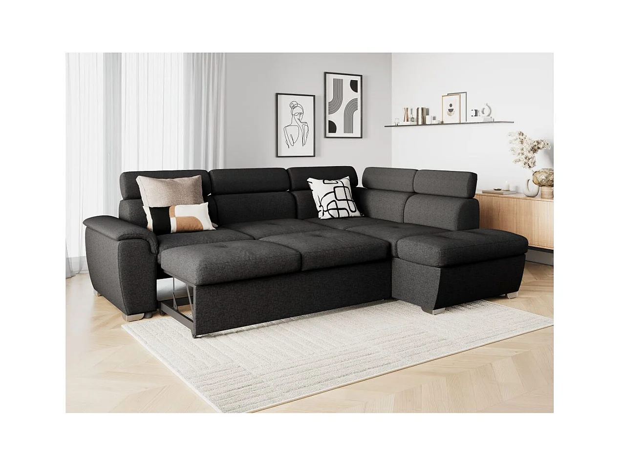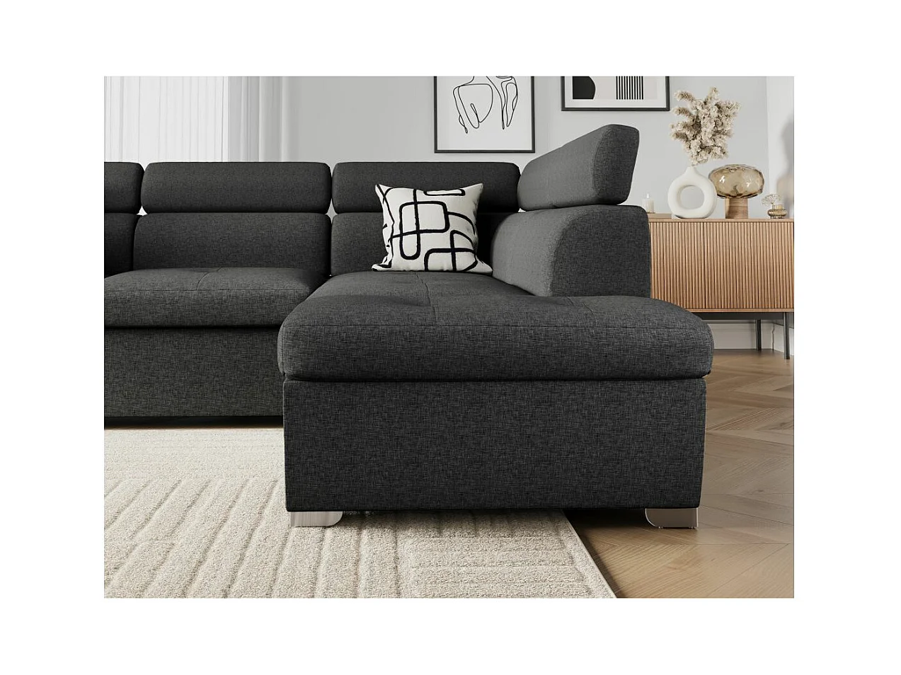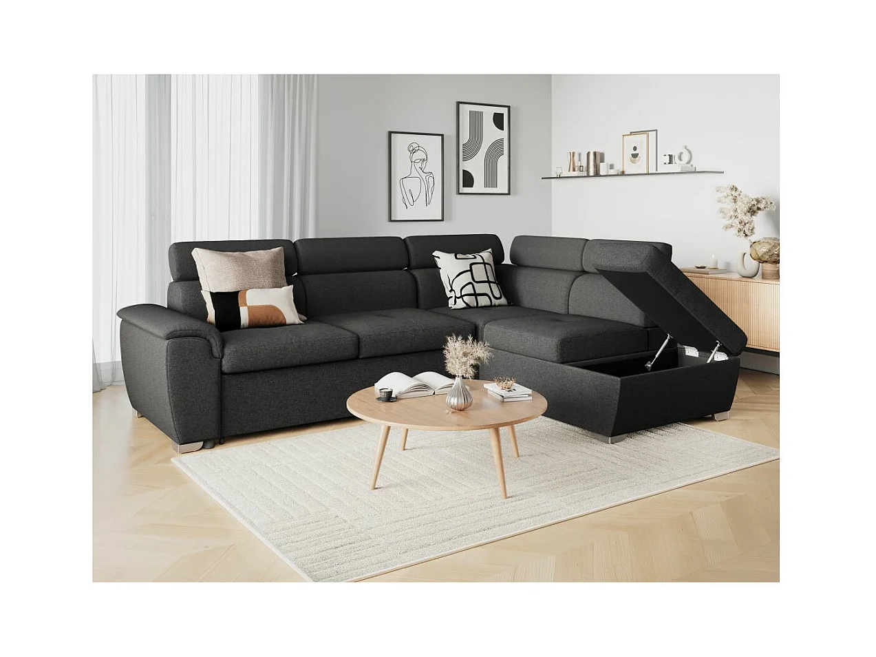 Canapé d'angle droit convertible Paola 4 places avec coffre en tissu - Gris anthracite - L261 x P198 x H80cm - Loungitude