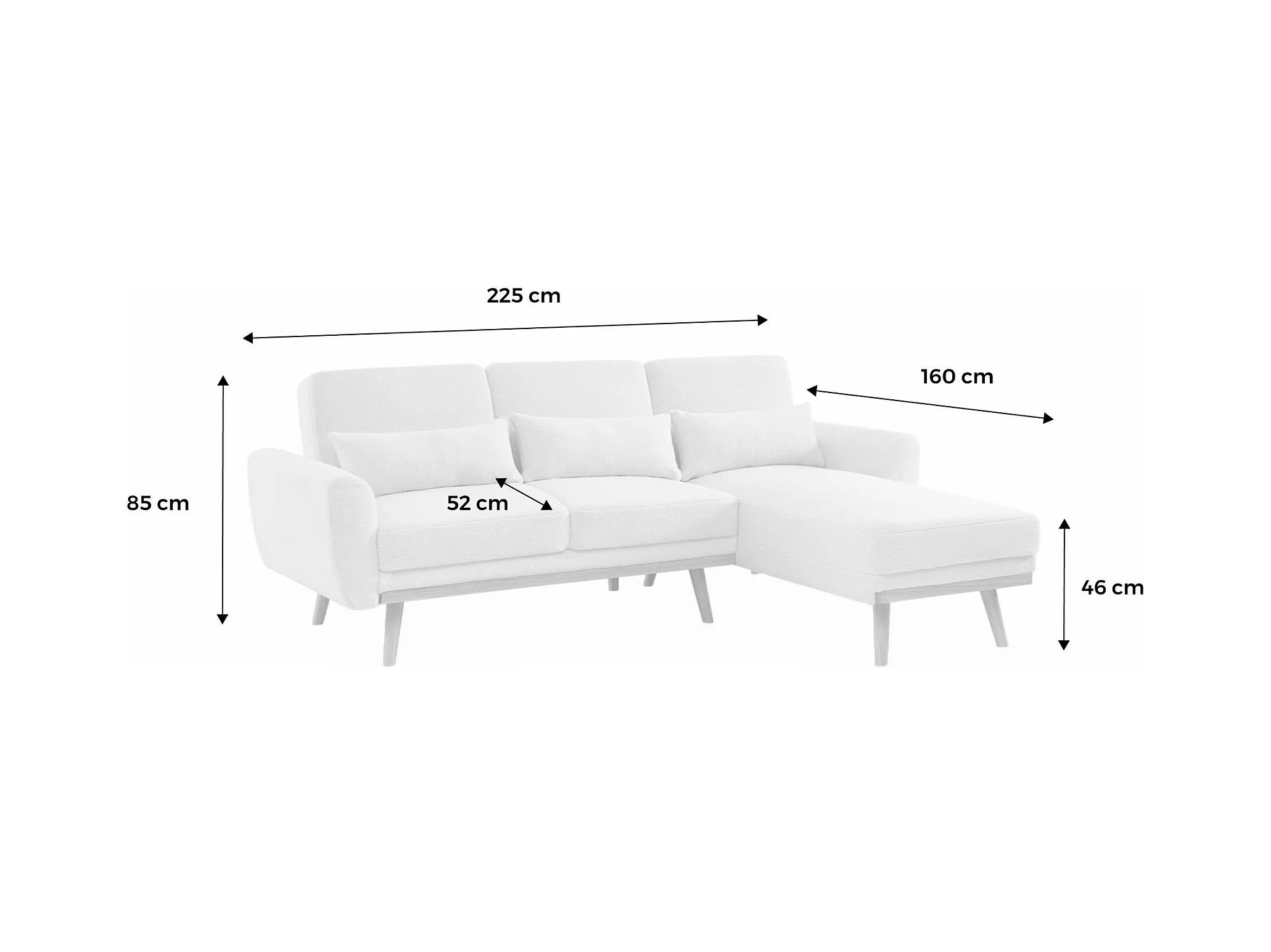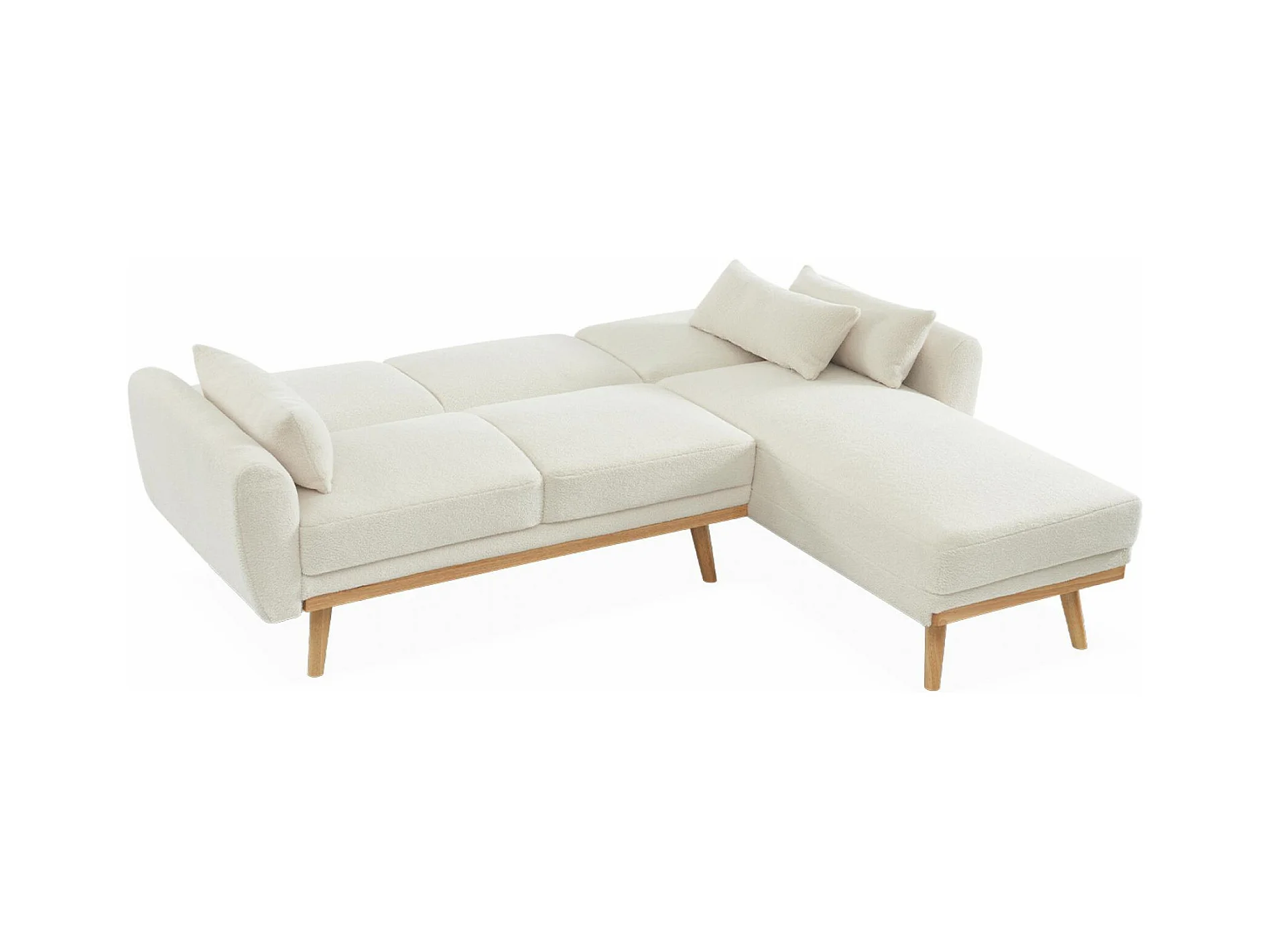 Canapé d'angle convertible réversible 3 places. tissu bouclettes crème. pieds bois