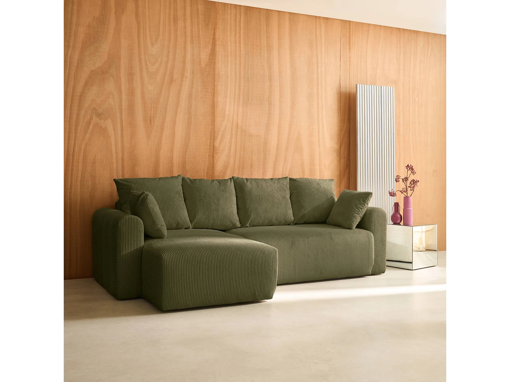 Canapé d'angle convertible réversible 3 places velours côtelé kaki avec coffre de rangement - Almo