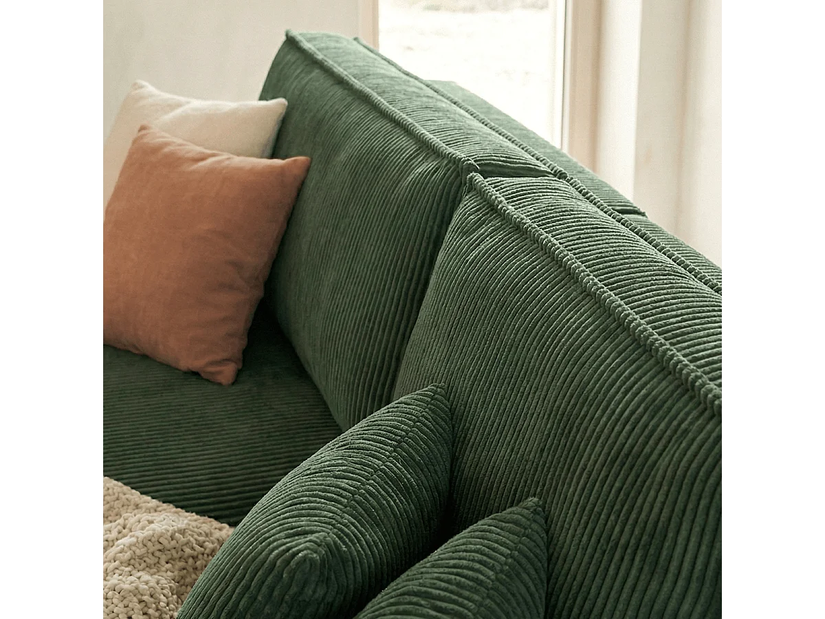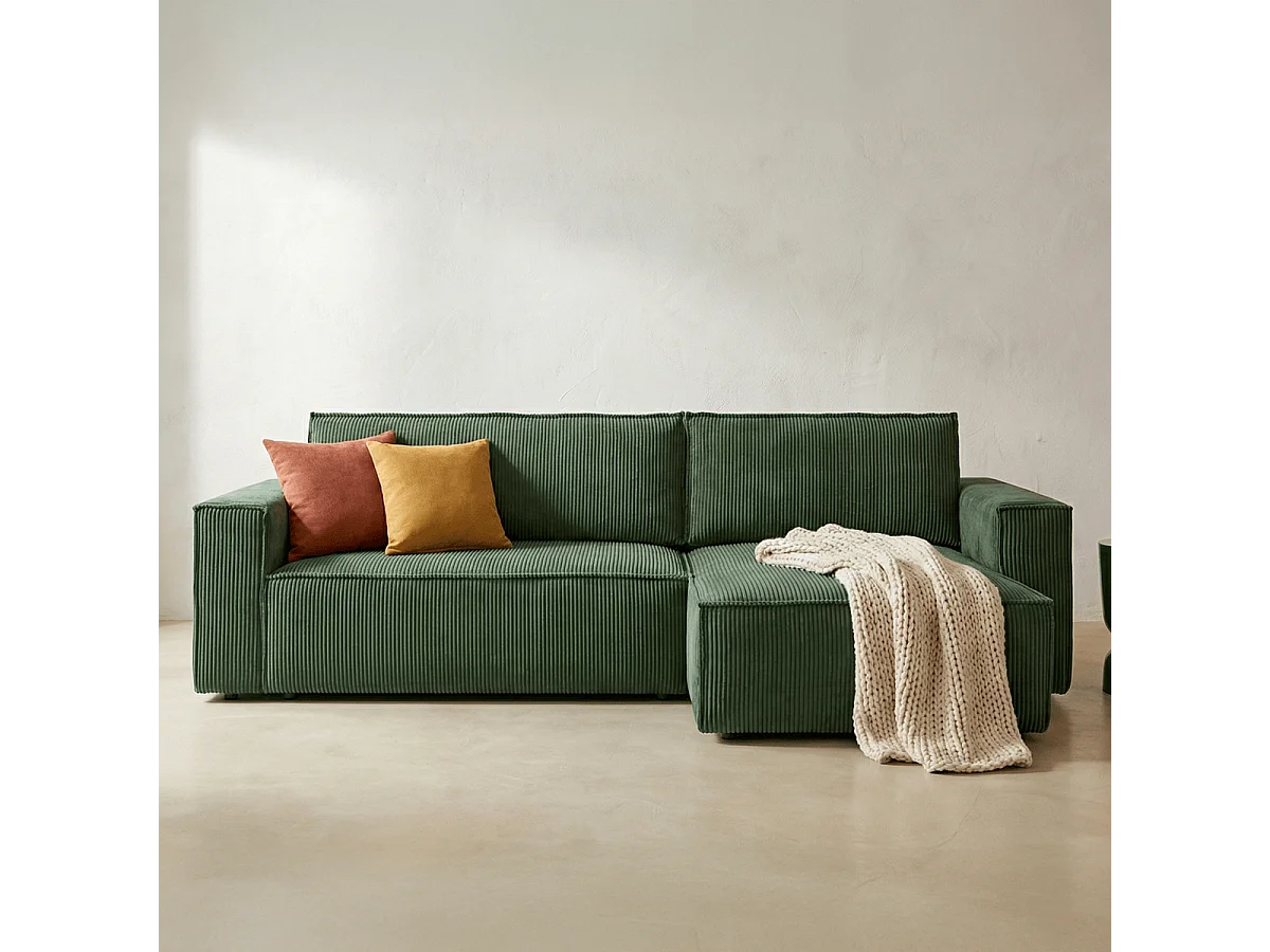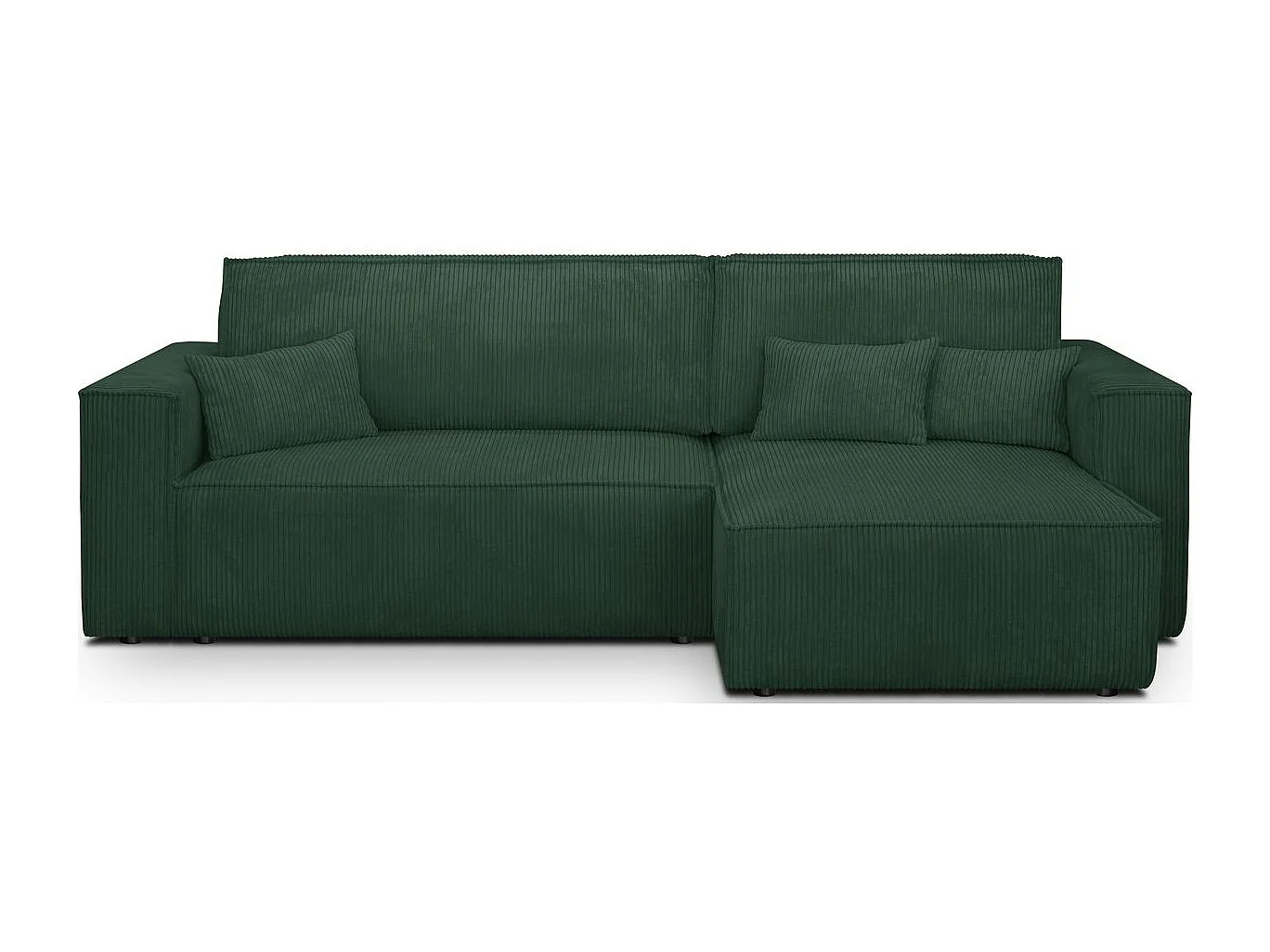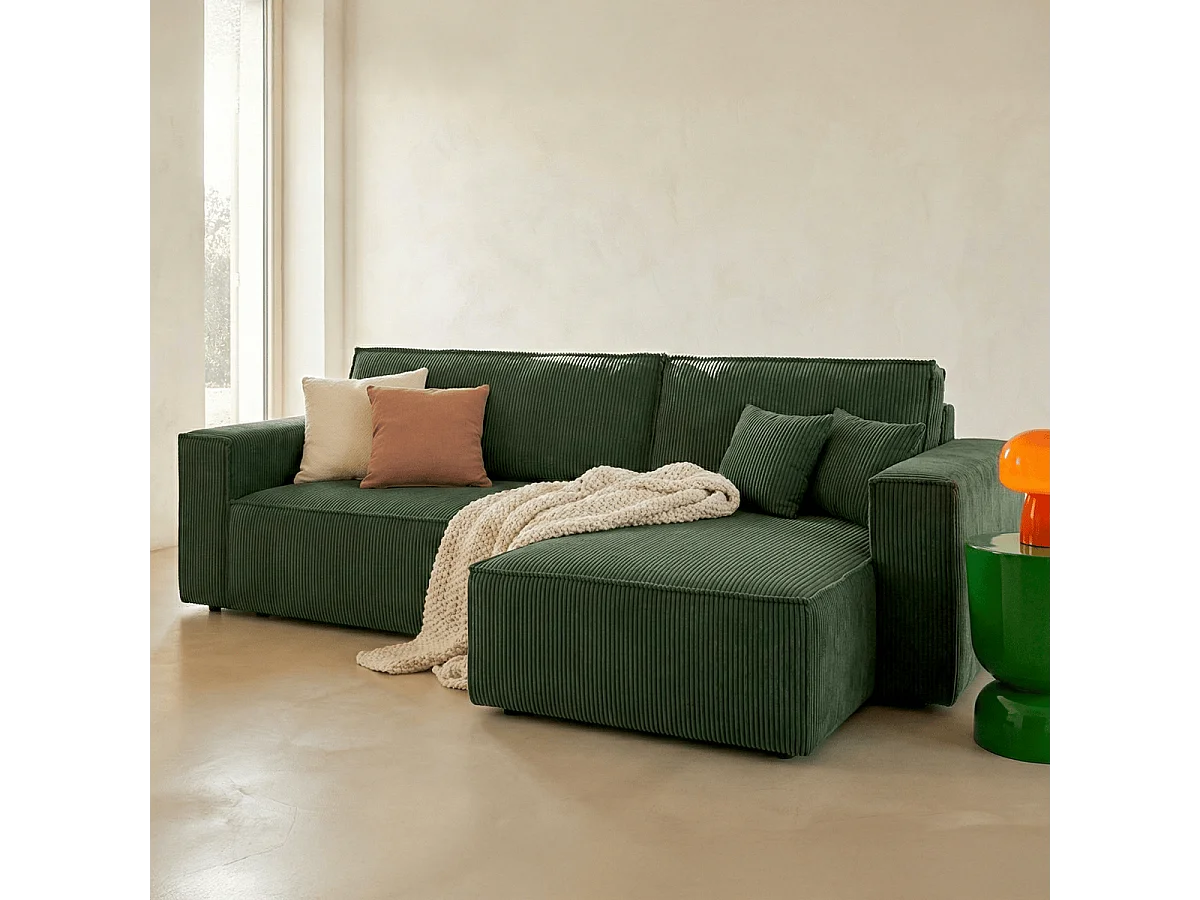Canapé d'angle convertible réversible 4 places avec coffre de rangement en velours côtelé vert foncé - Livia