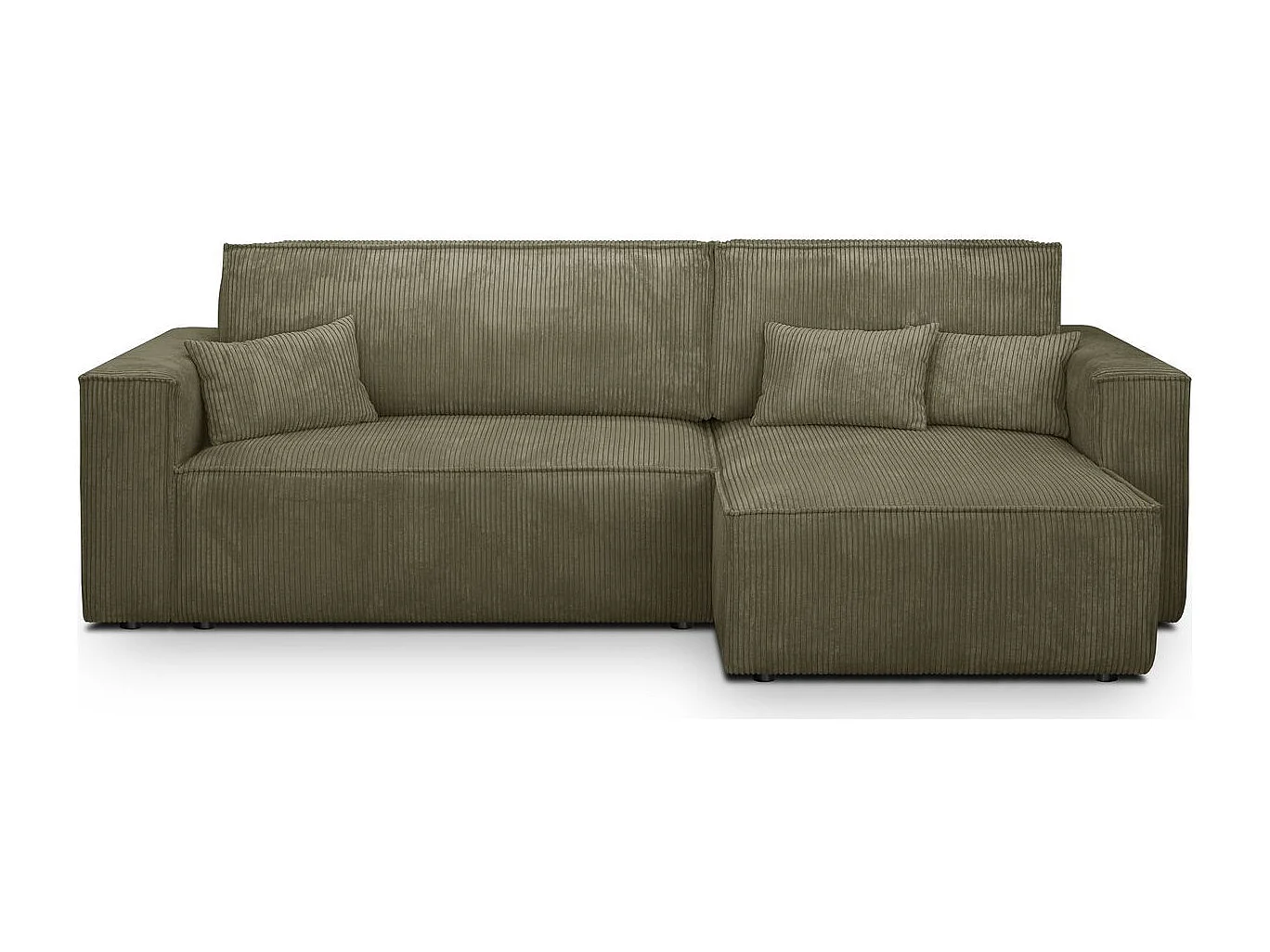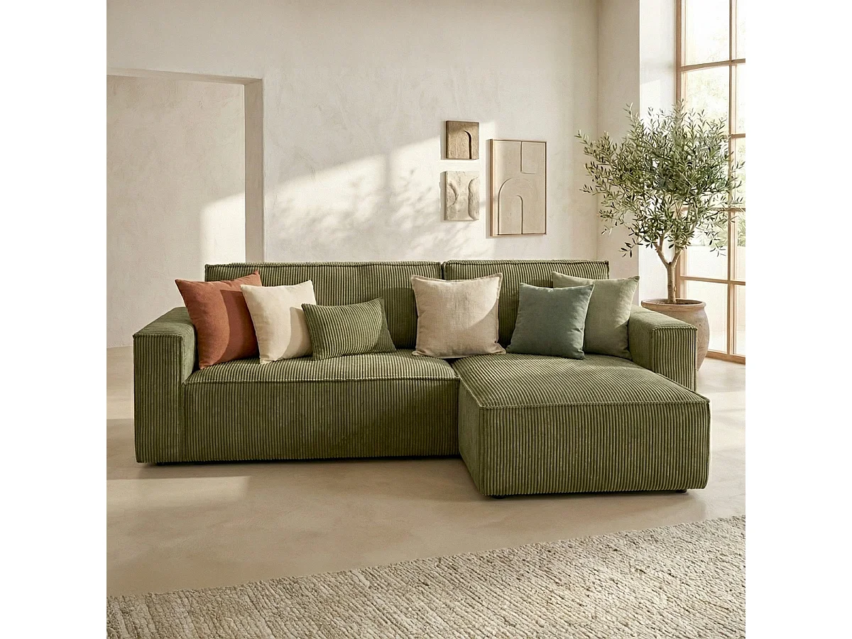 Canapé d'angle convertible réversible 4 places avec coffre de rangement en velours côtelé vert kaki - Livia