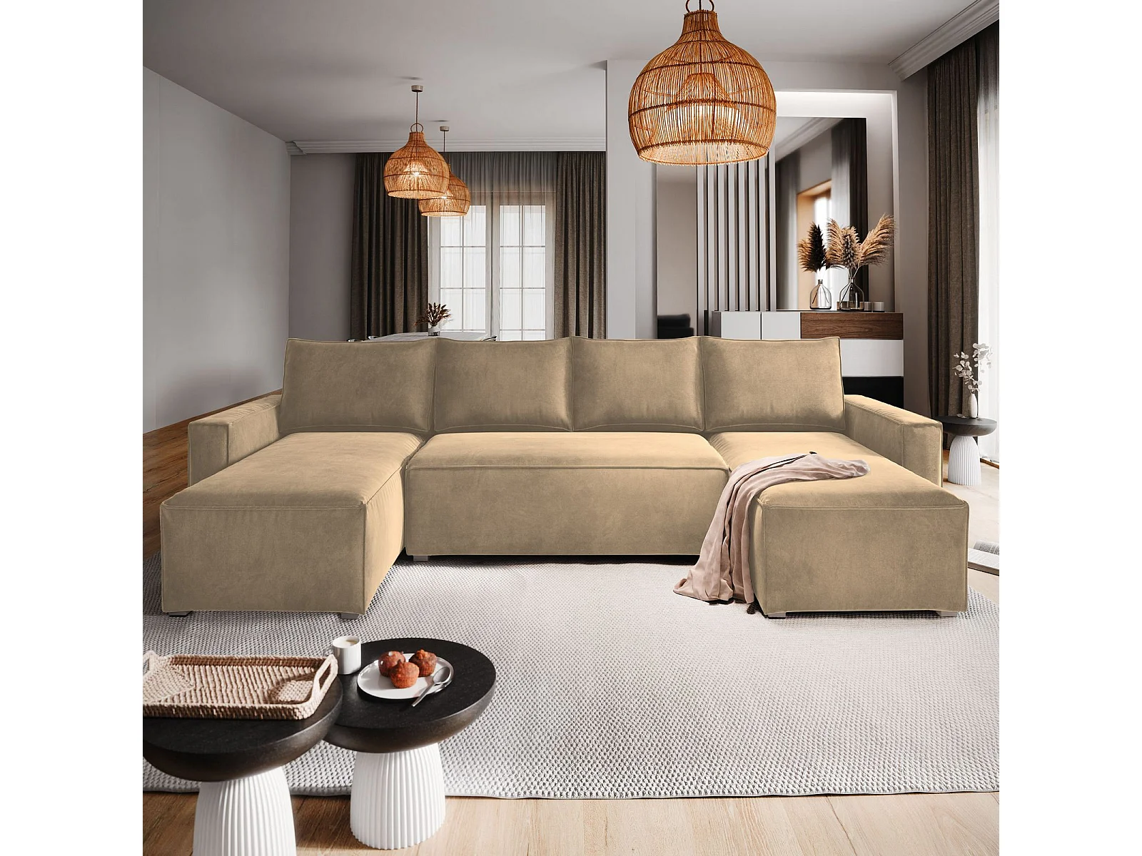 Canapé d'angle DENI Crème en velours avec fonction de couchage