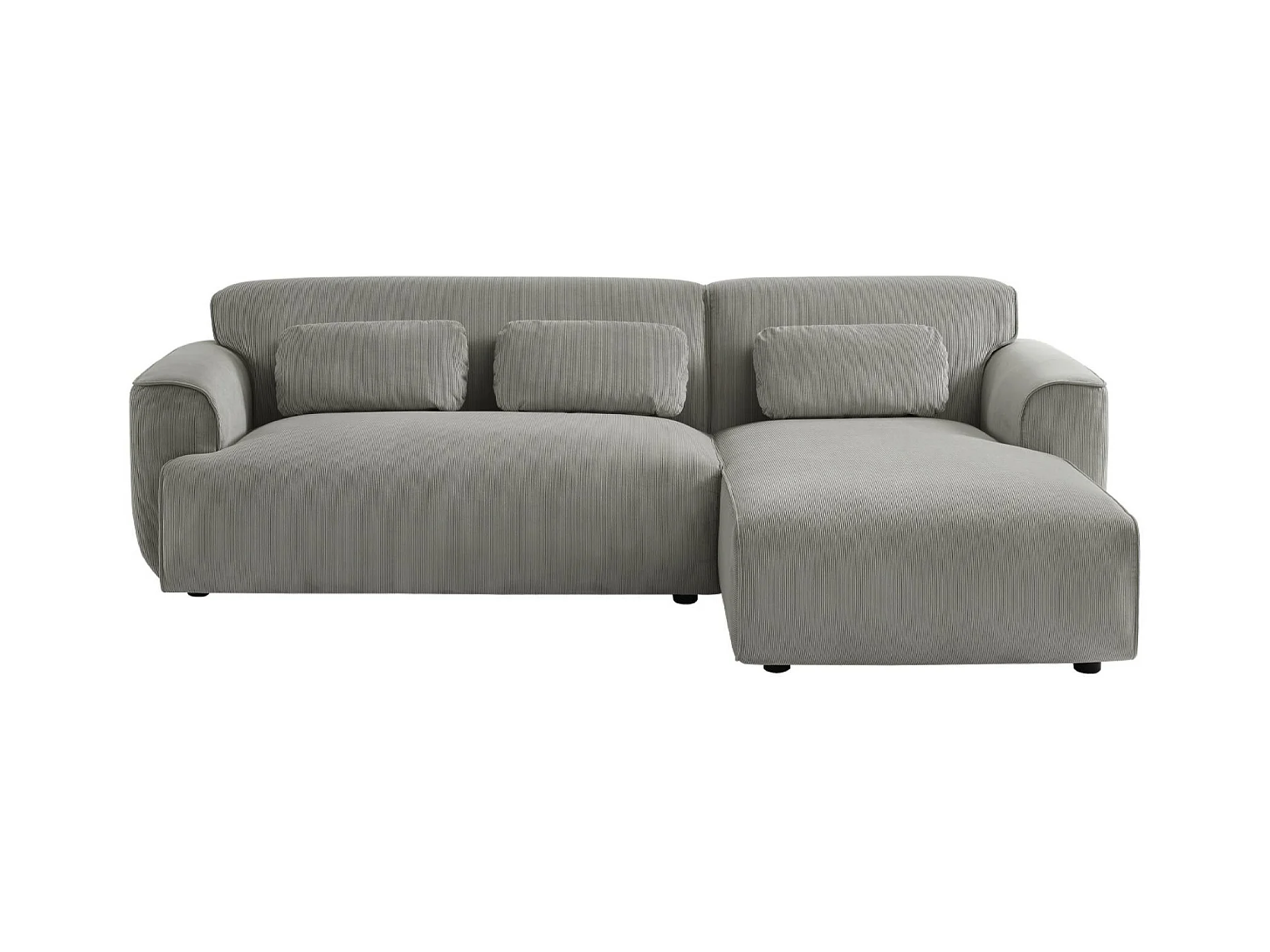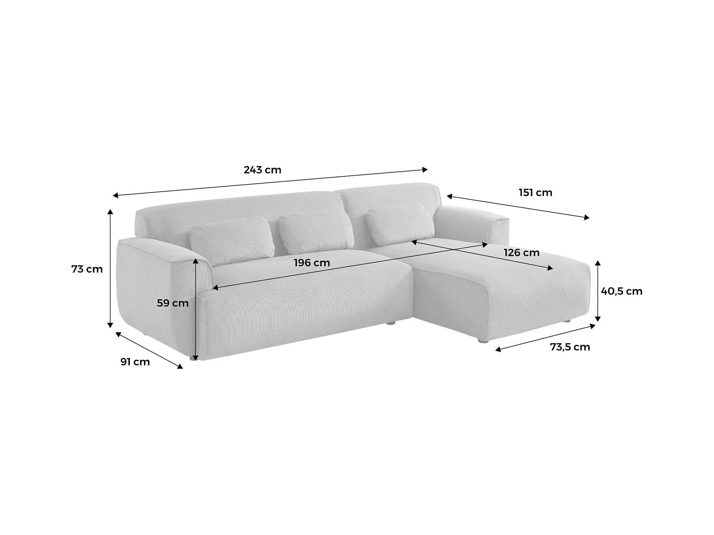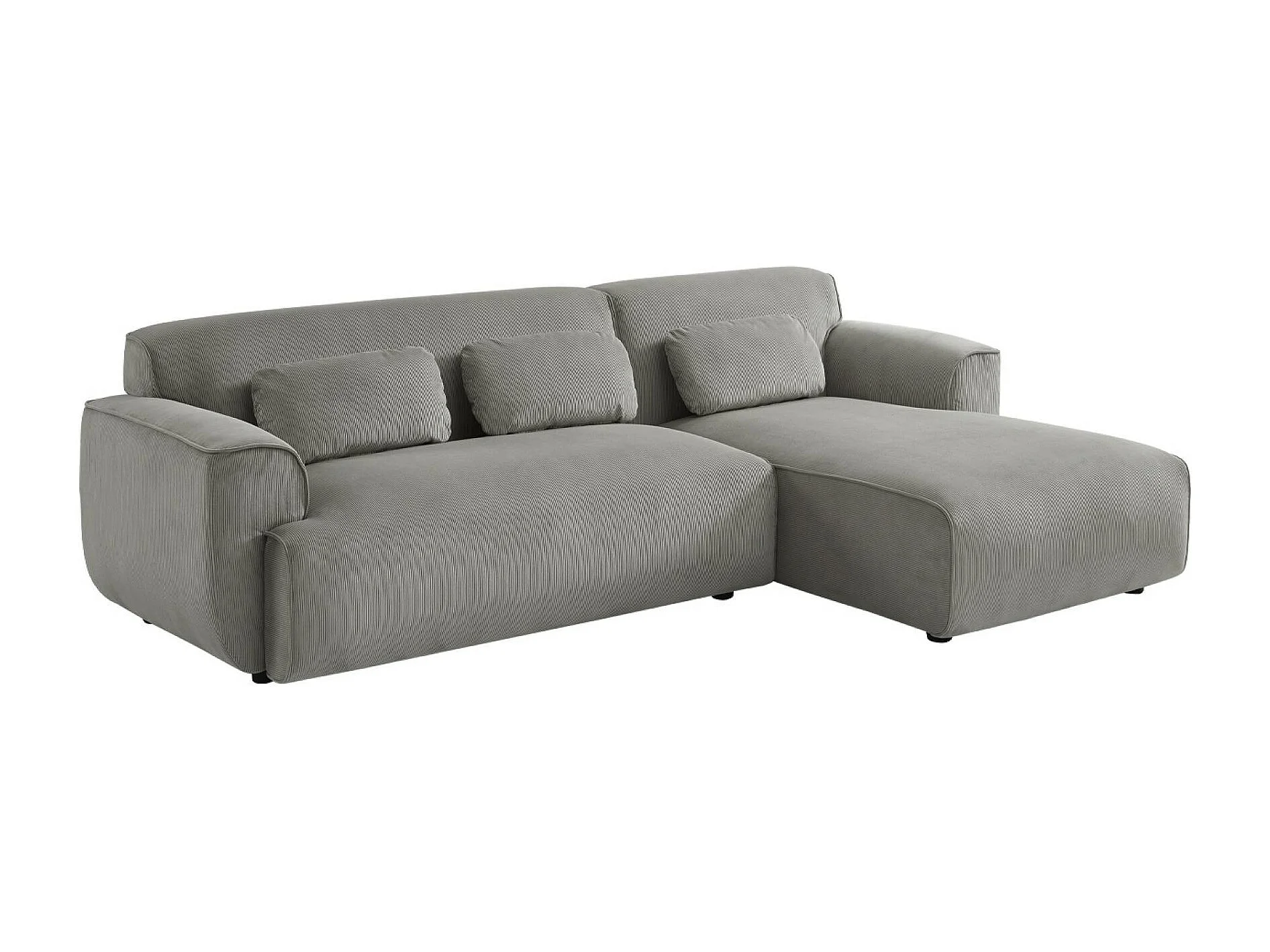 Canapé d'angle droit. 2 à 3 places. velours côtelé gris clair. Wallas L 196 x P 151 / 91 / x H 73cm