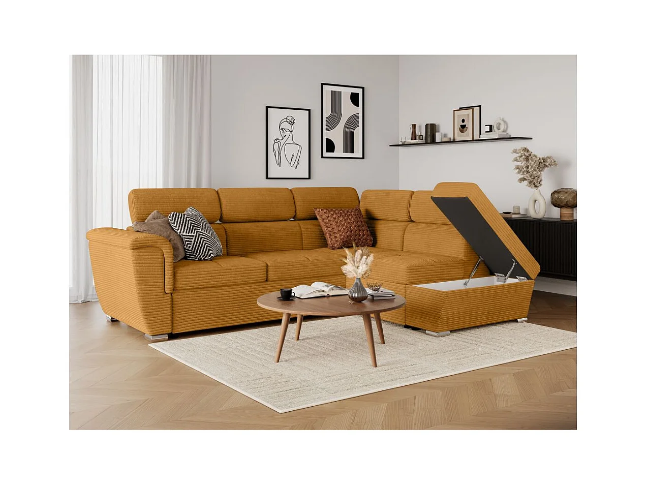 Canapé d'angle droit 4 places Paola convertible avec coffre en velours côtelé - Jaune - L252 x P188 x H76cm - Loungitude