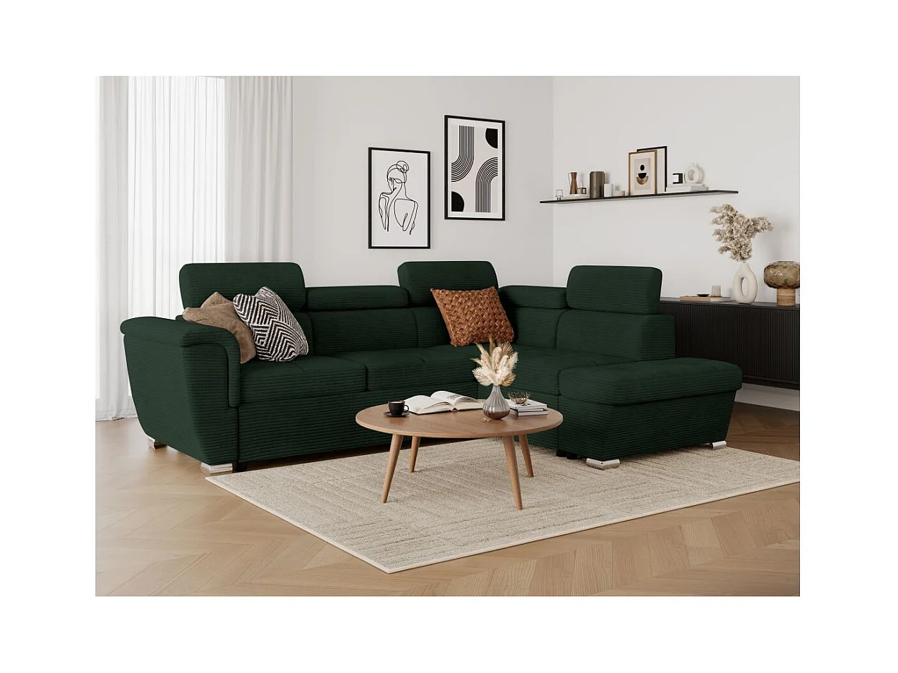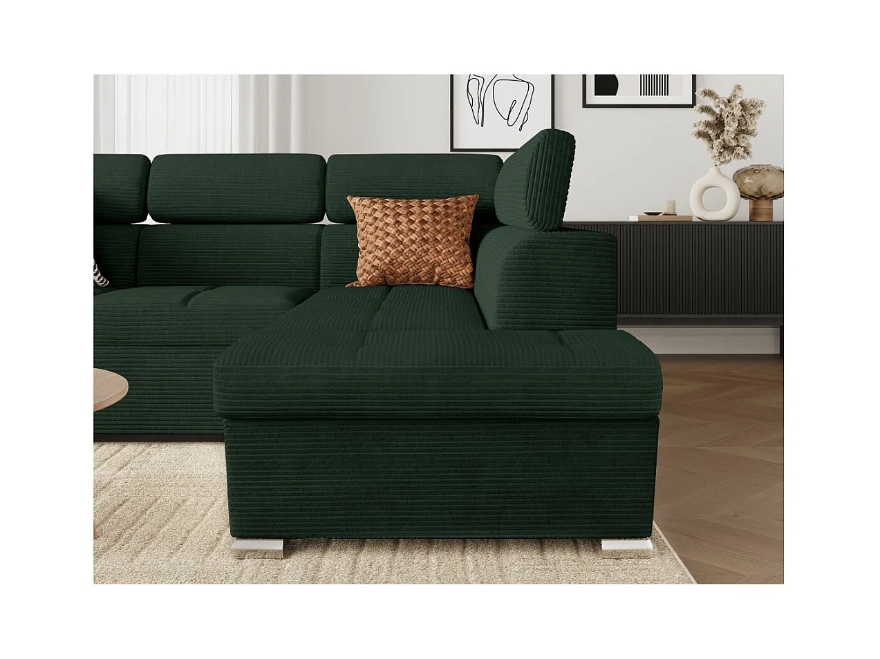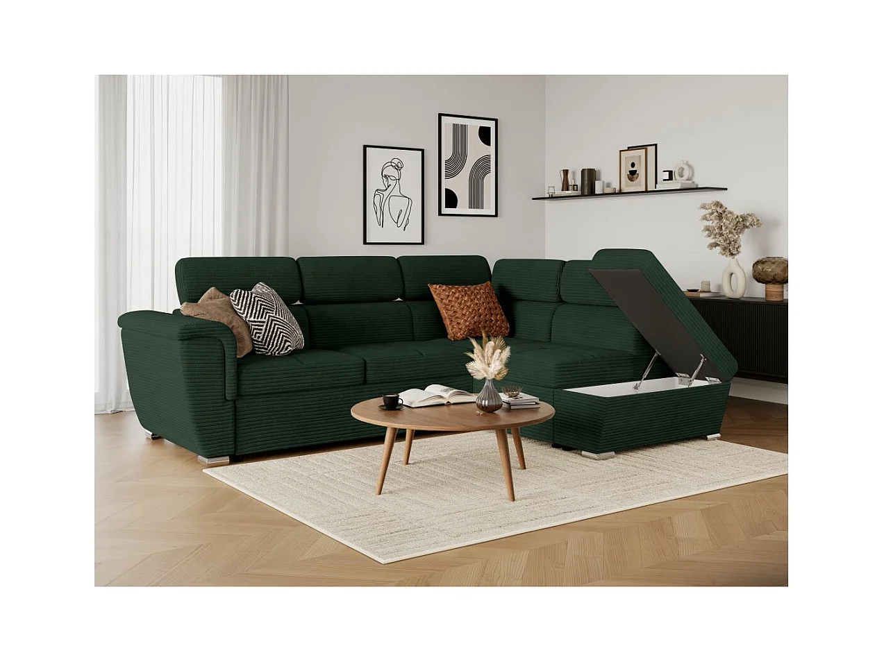 Canapé d'angle droit 4 places Paola convertible avec coffre en velours côtelé - Vert foncé - L252 x P188 x H76cm - Loungitude