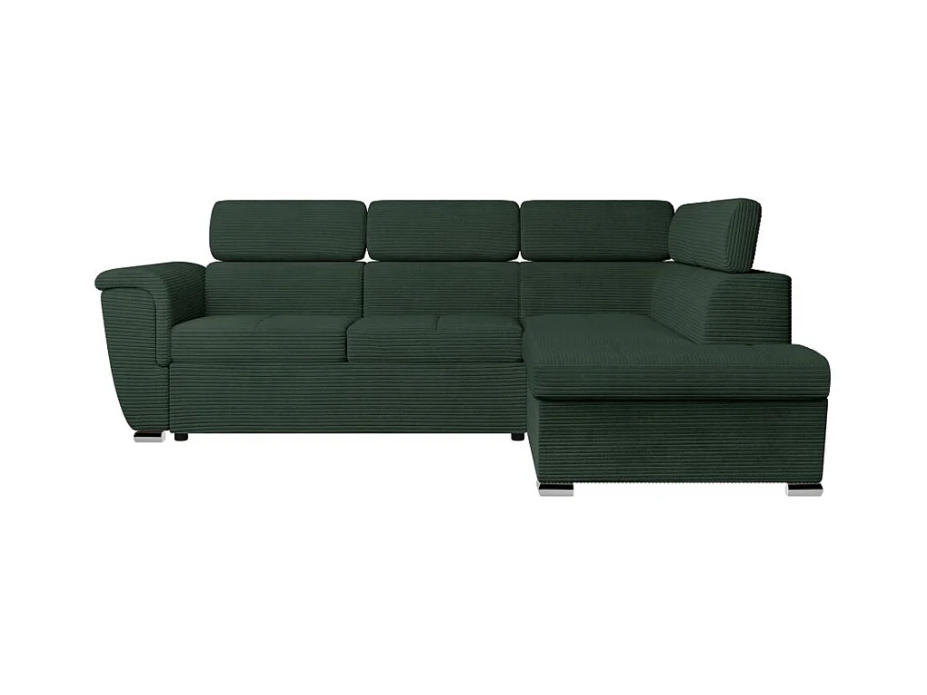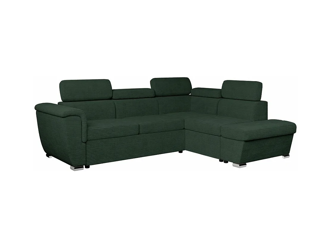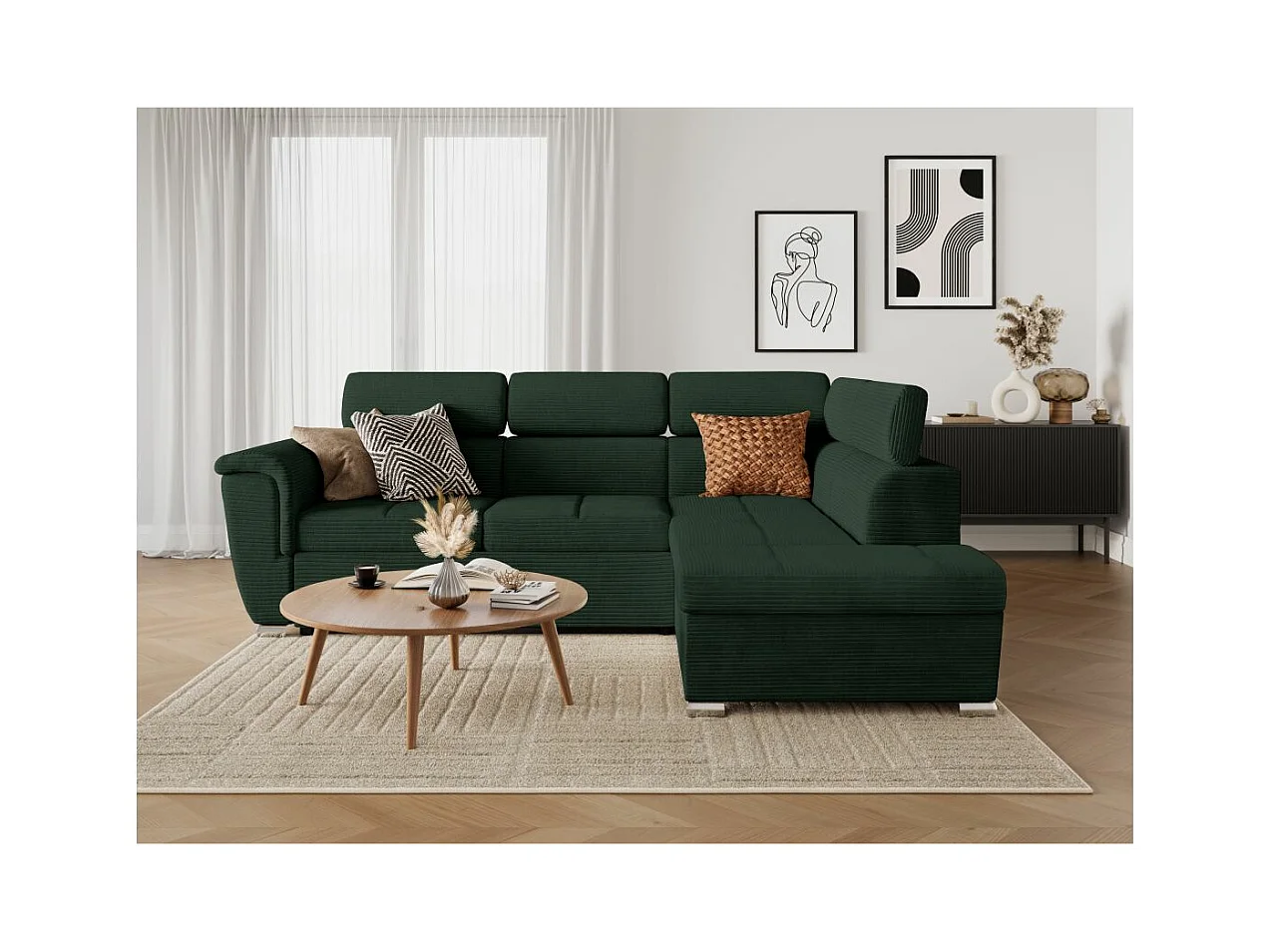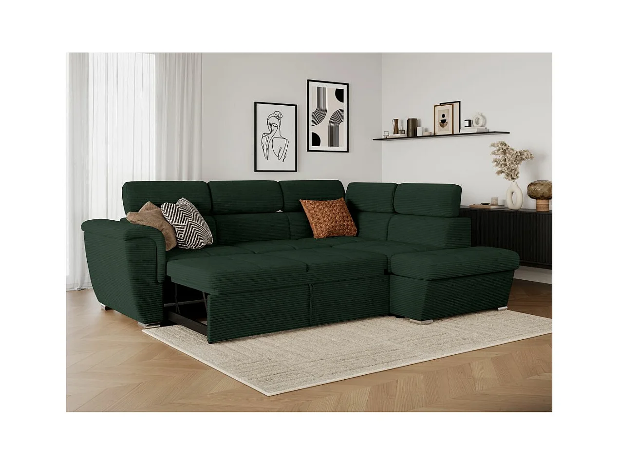 Canapé d'angle droit 4 places Paola convertible avec coffre en velours côtelé - Vert foncé - L252 x P188 x H76cm - Loungitude