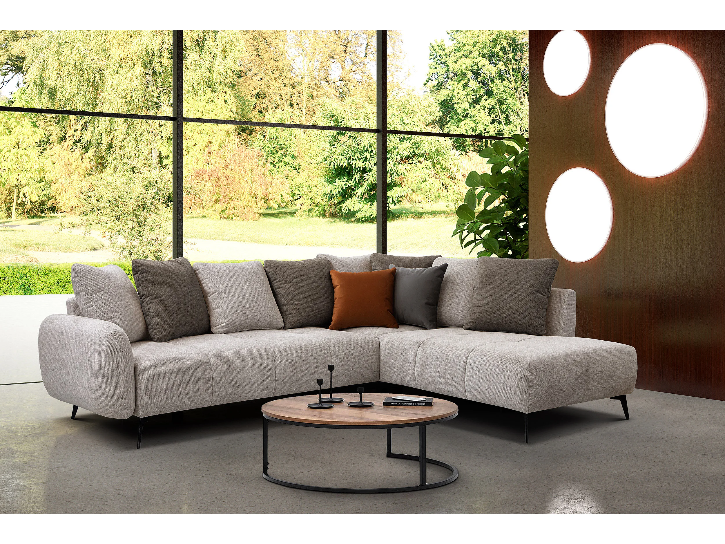 Canapé d'angle droit 5 places tissu beige - EVENTO