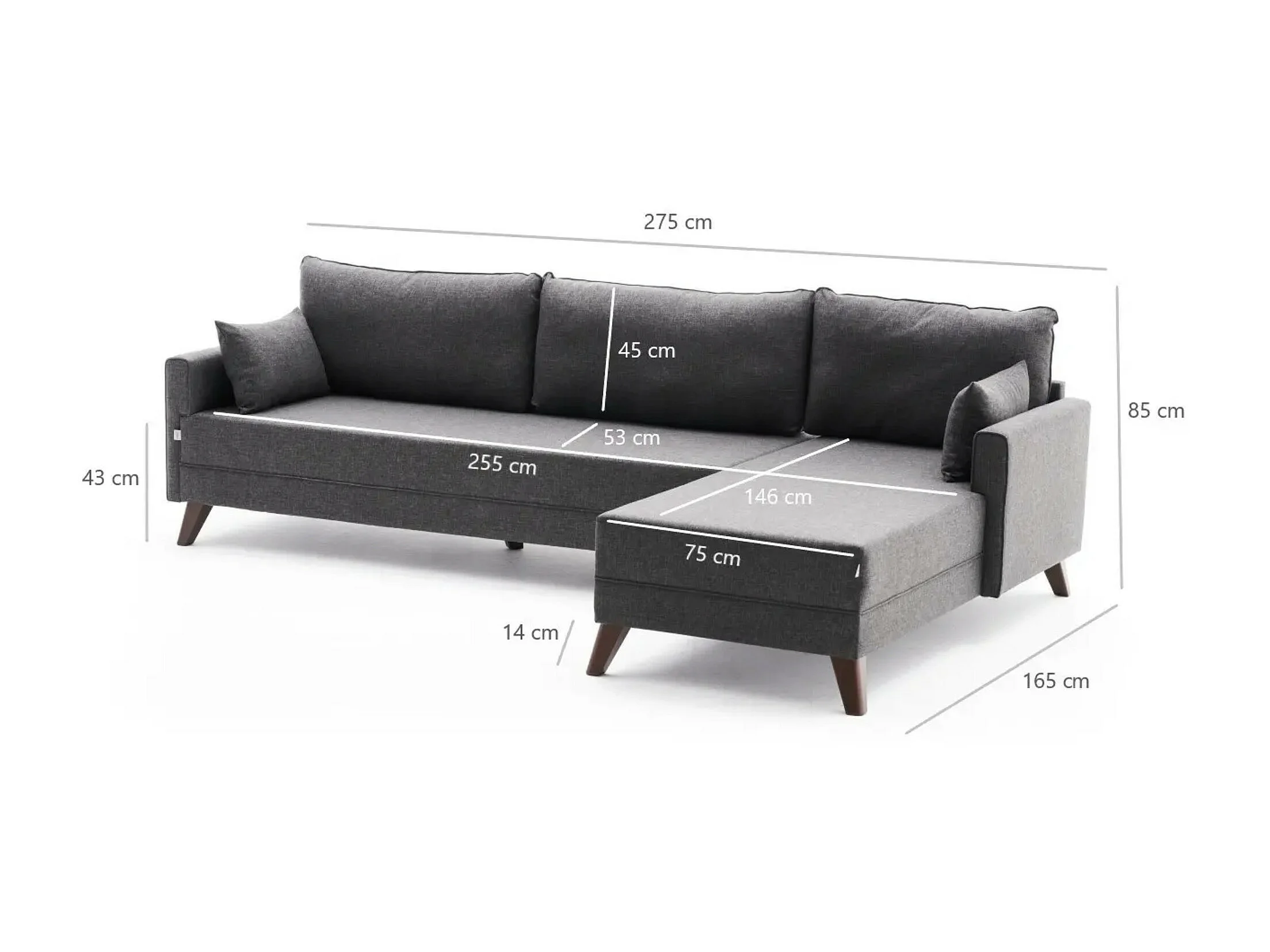 Canapé d'angle droit 5 places tissu gris foncé Kandy 275cm
