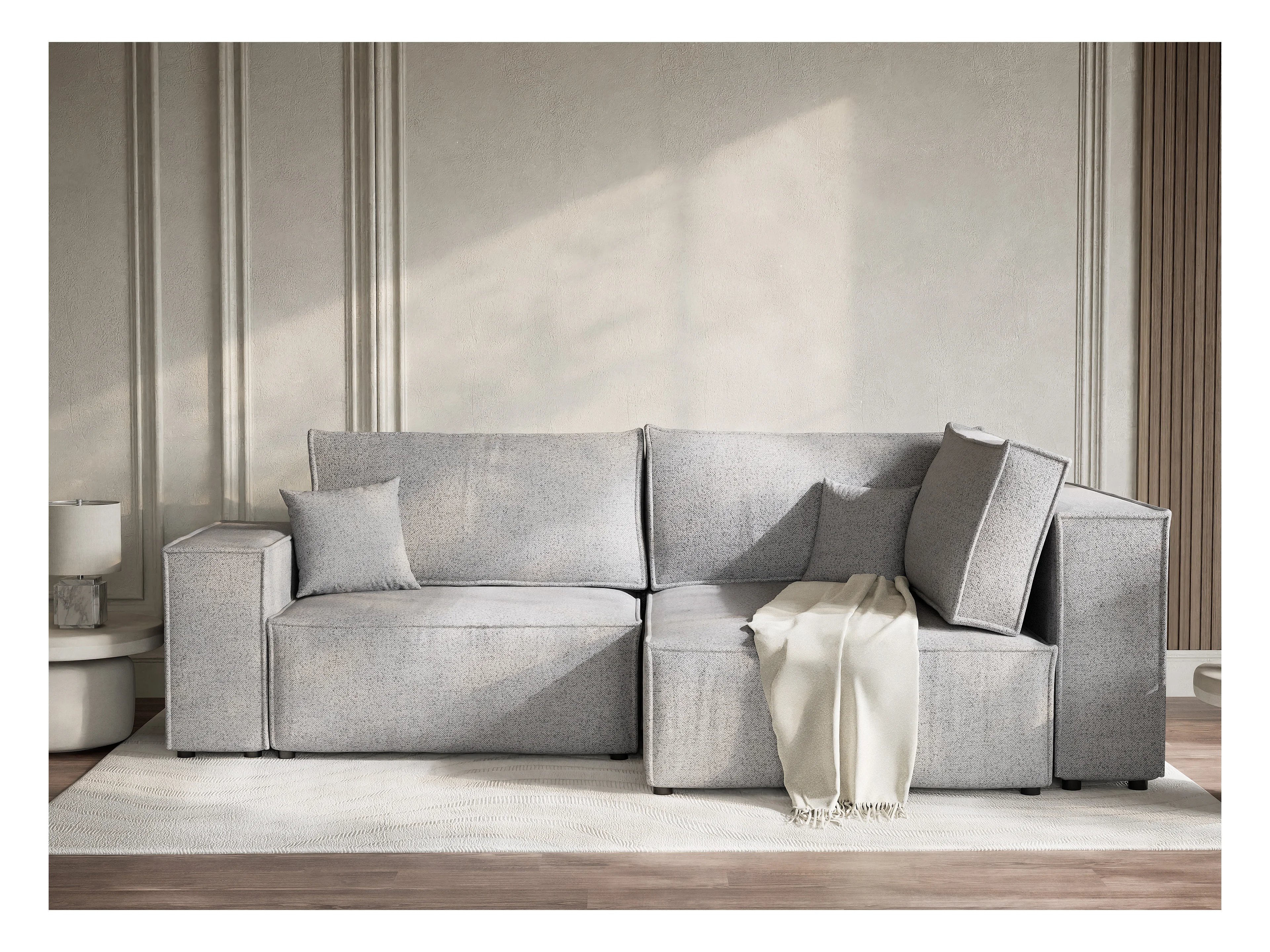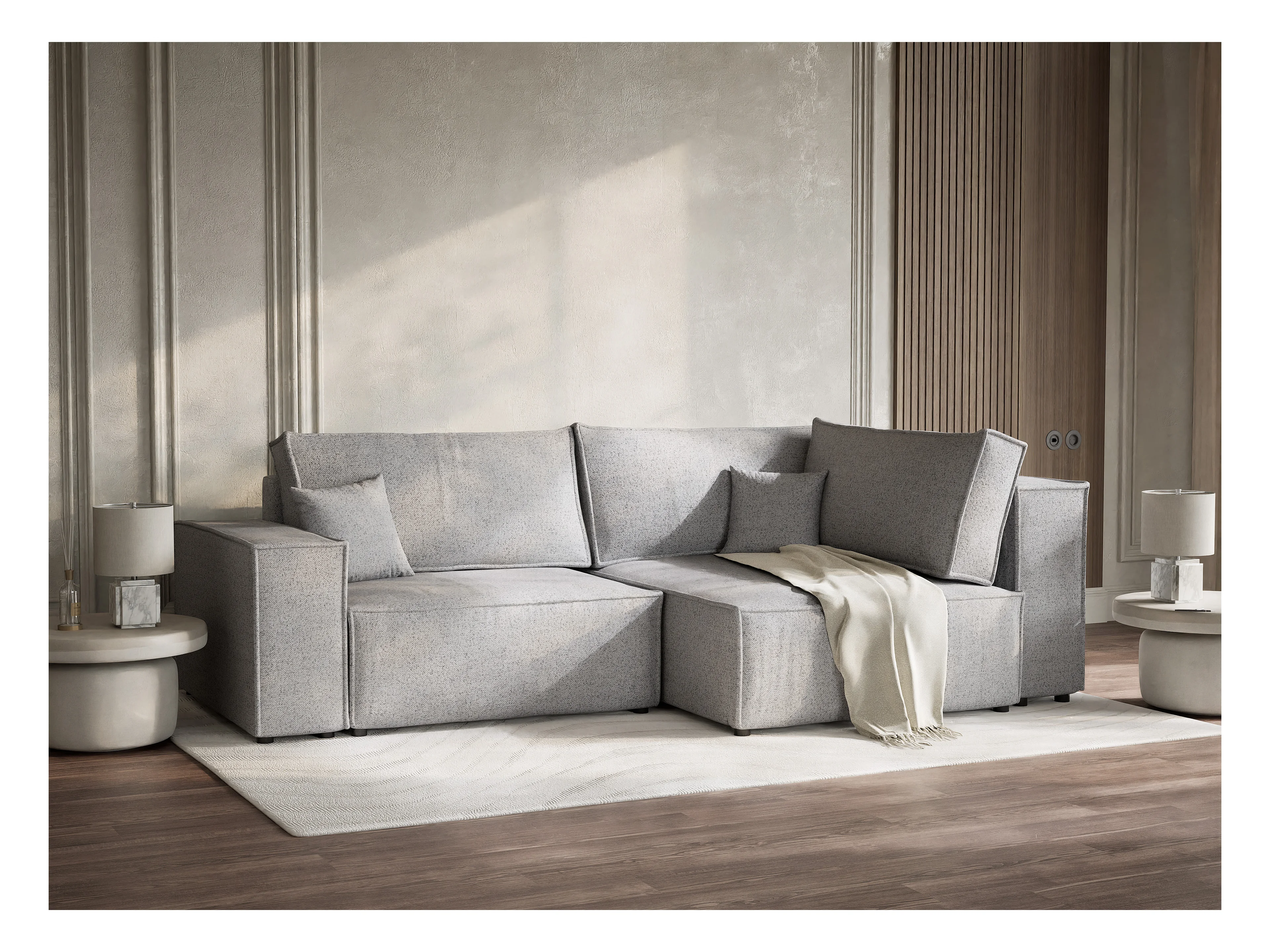 Canapé d'angle droit avec fonction lit en tissu tressé gris clair TONGA