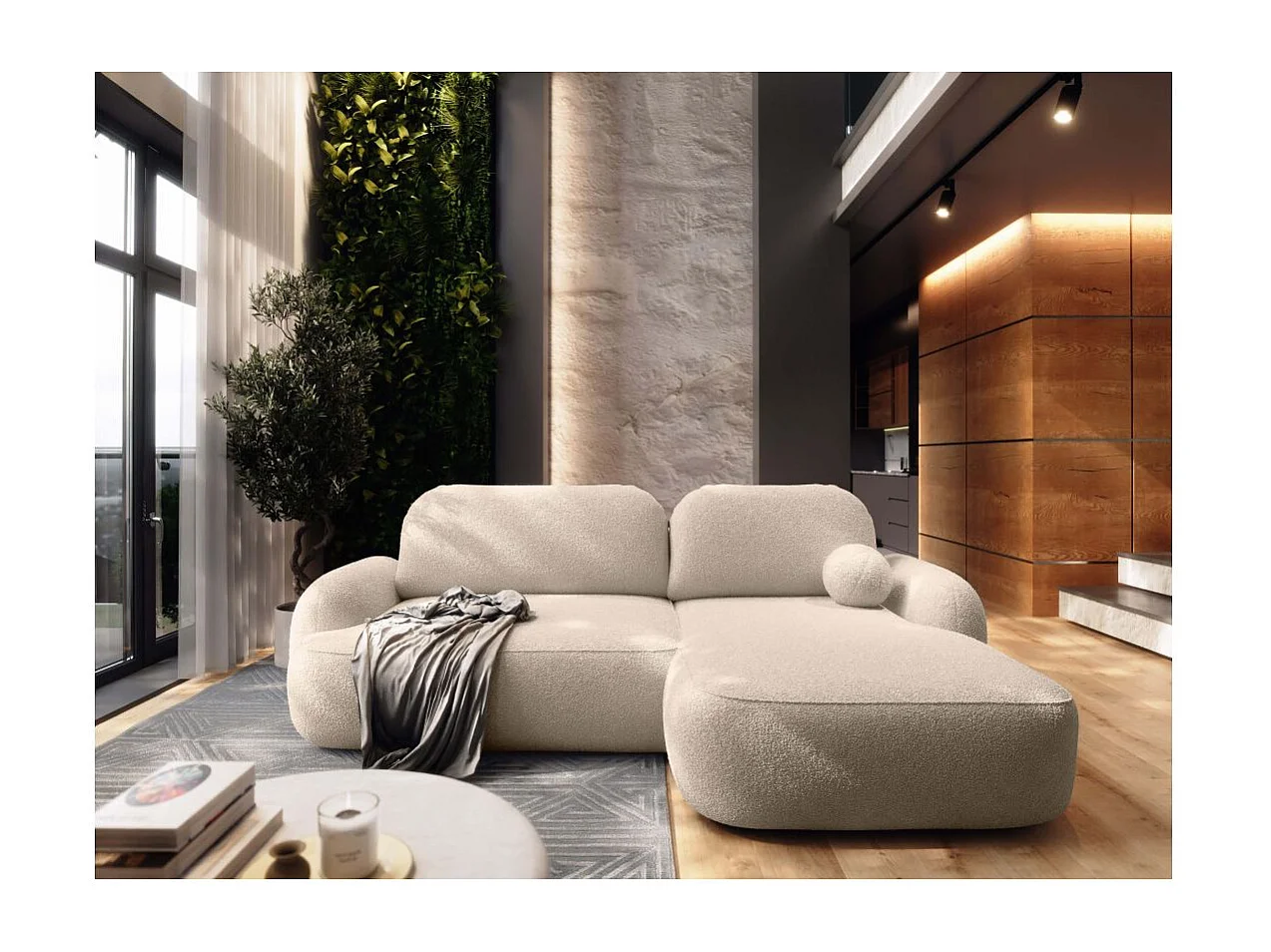 Canapé d'angle droit convertible 4 places MILLY avec coffre en tissu bouclette - Beige