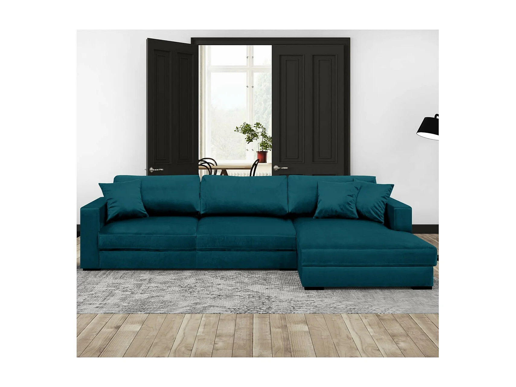 Canapé d'angle droit convertible 5 places en velours bleu canard avec coffre de rangement - Robin
