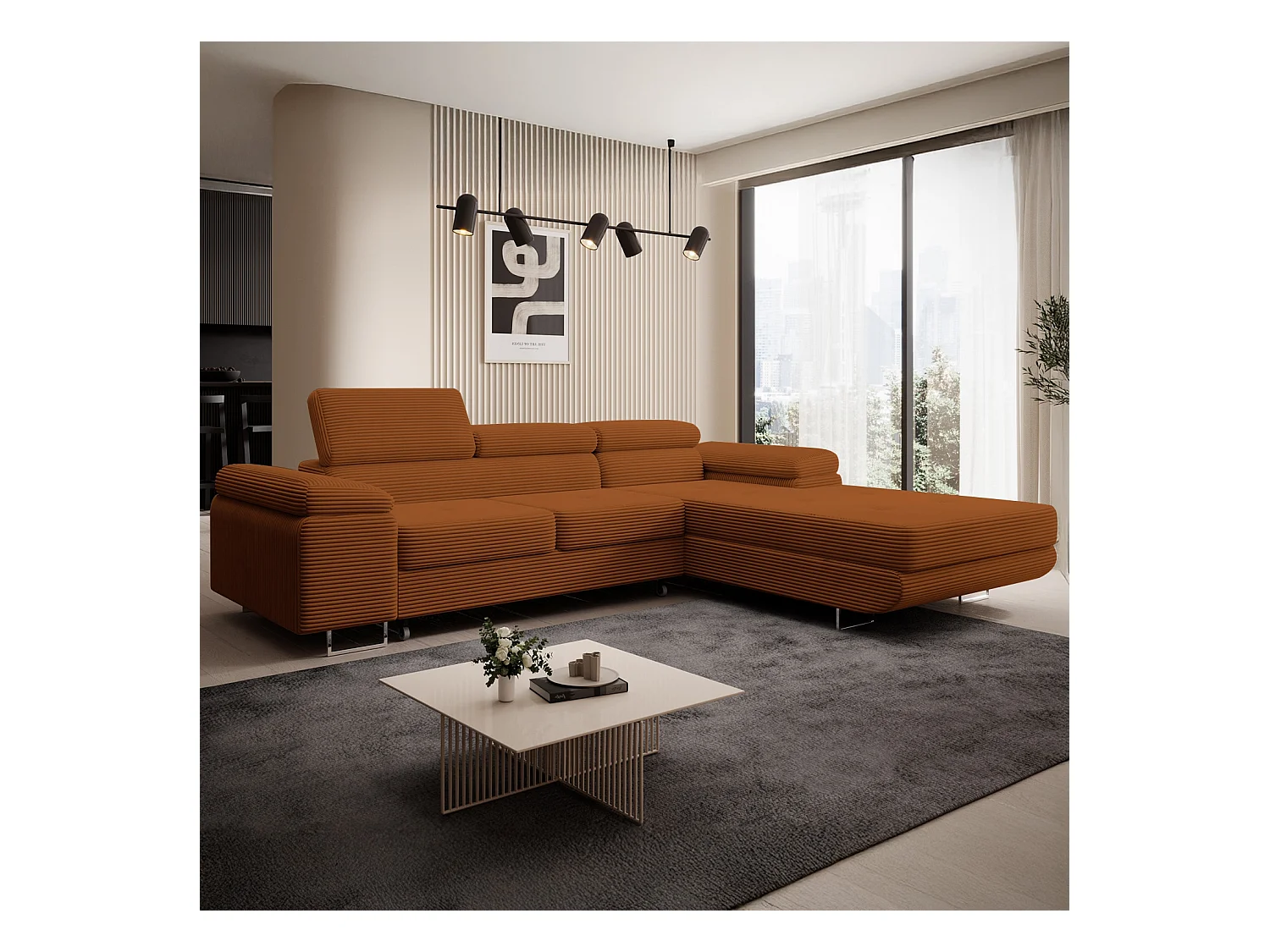 Canapé d'angle droit convertible Alphonso velours côtelé Terracotta