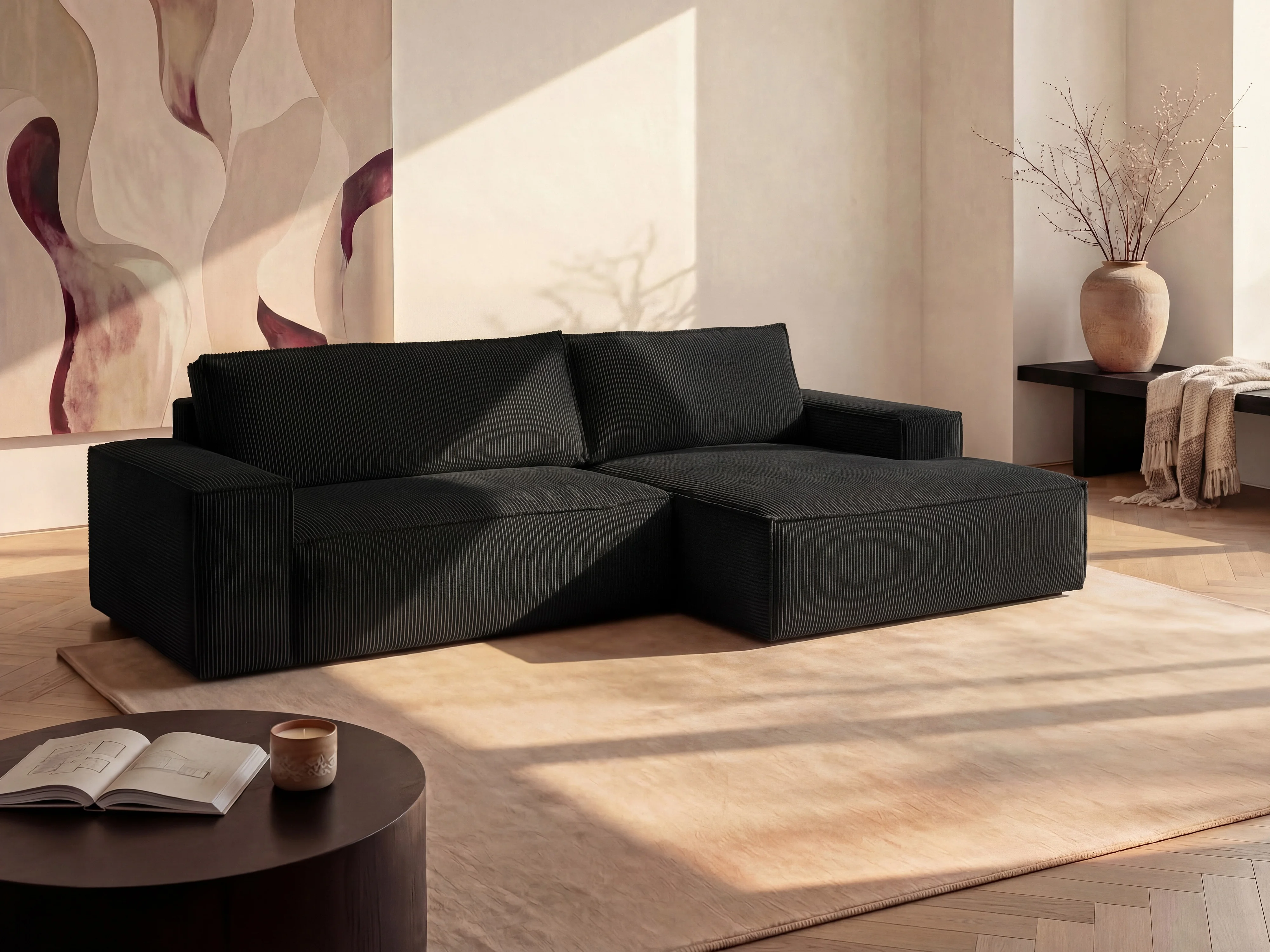 Canapé d'angle droit convertible en velours côtelé noir AMELIA