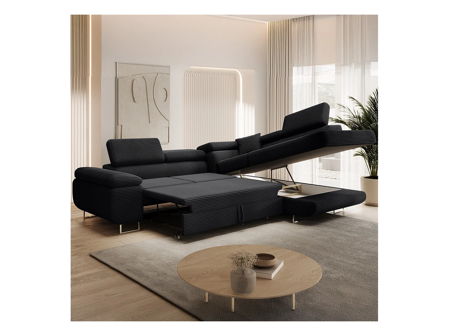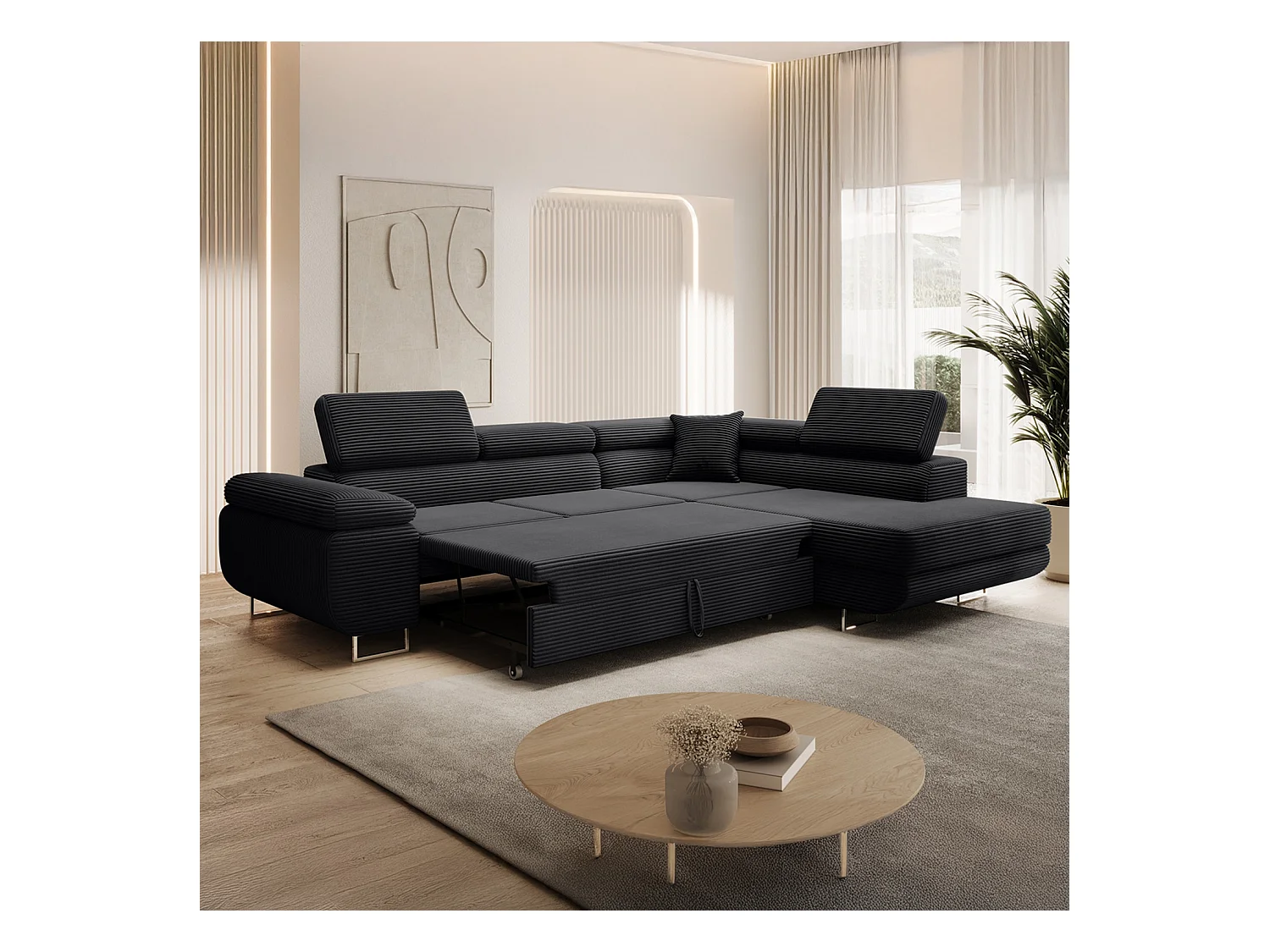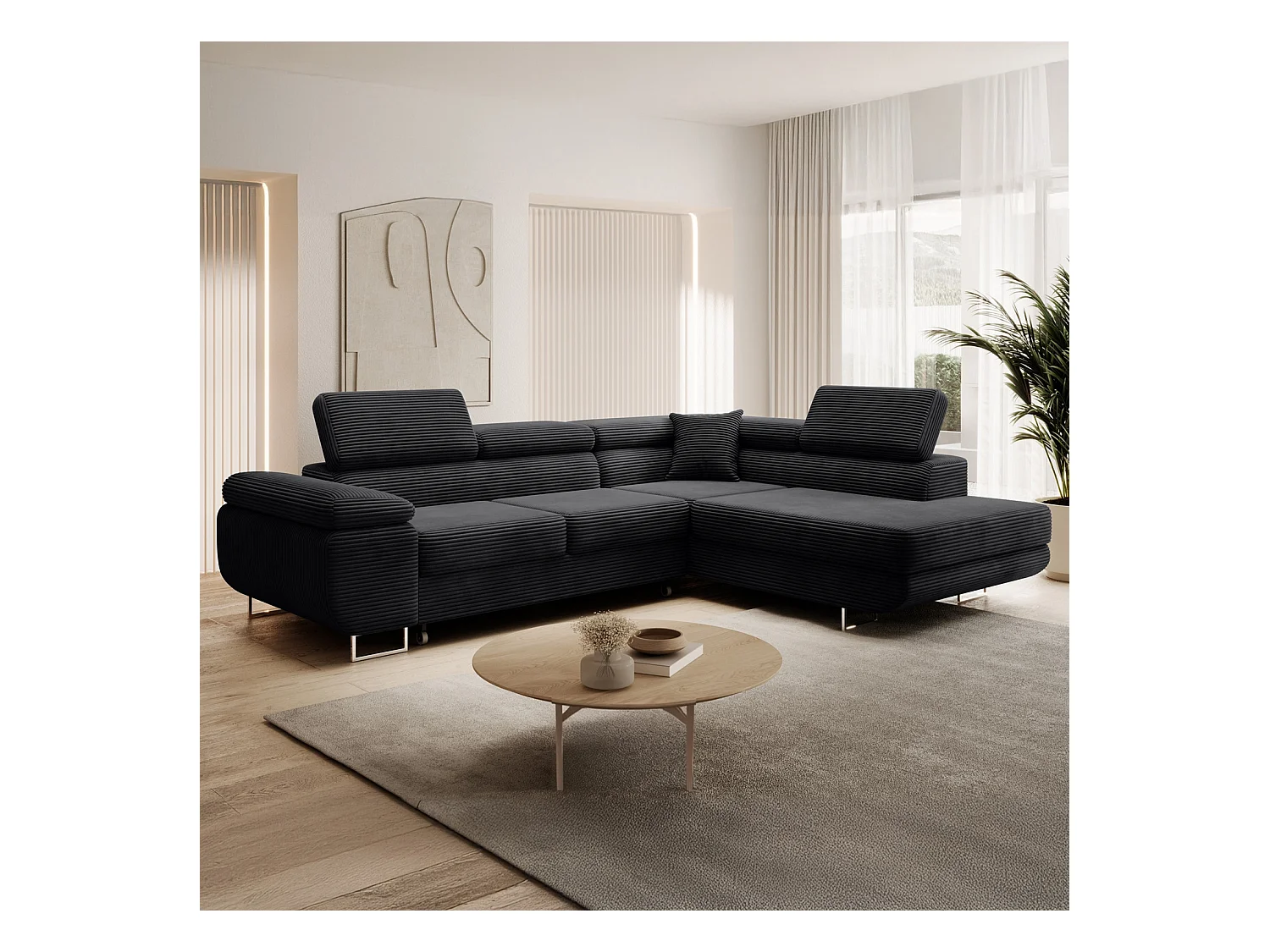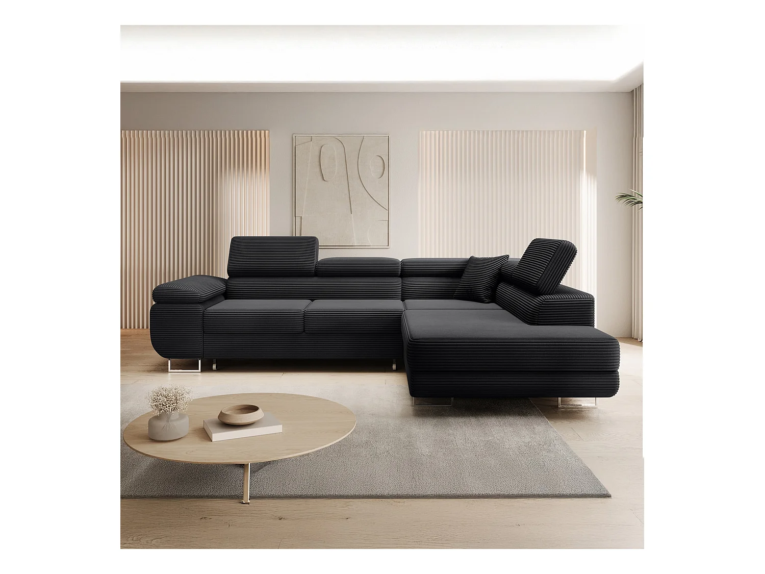 Canapé d'angle droit convertible Marius velours côtelé Noir