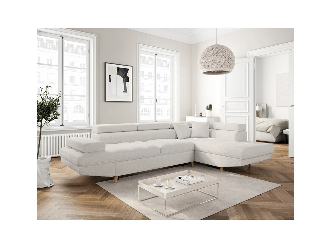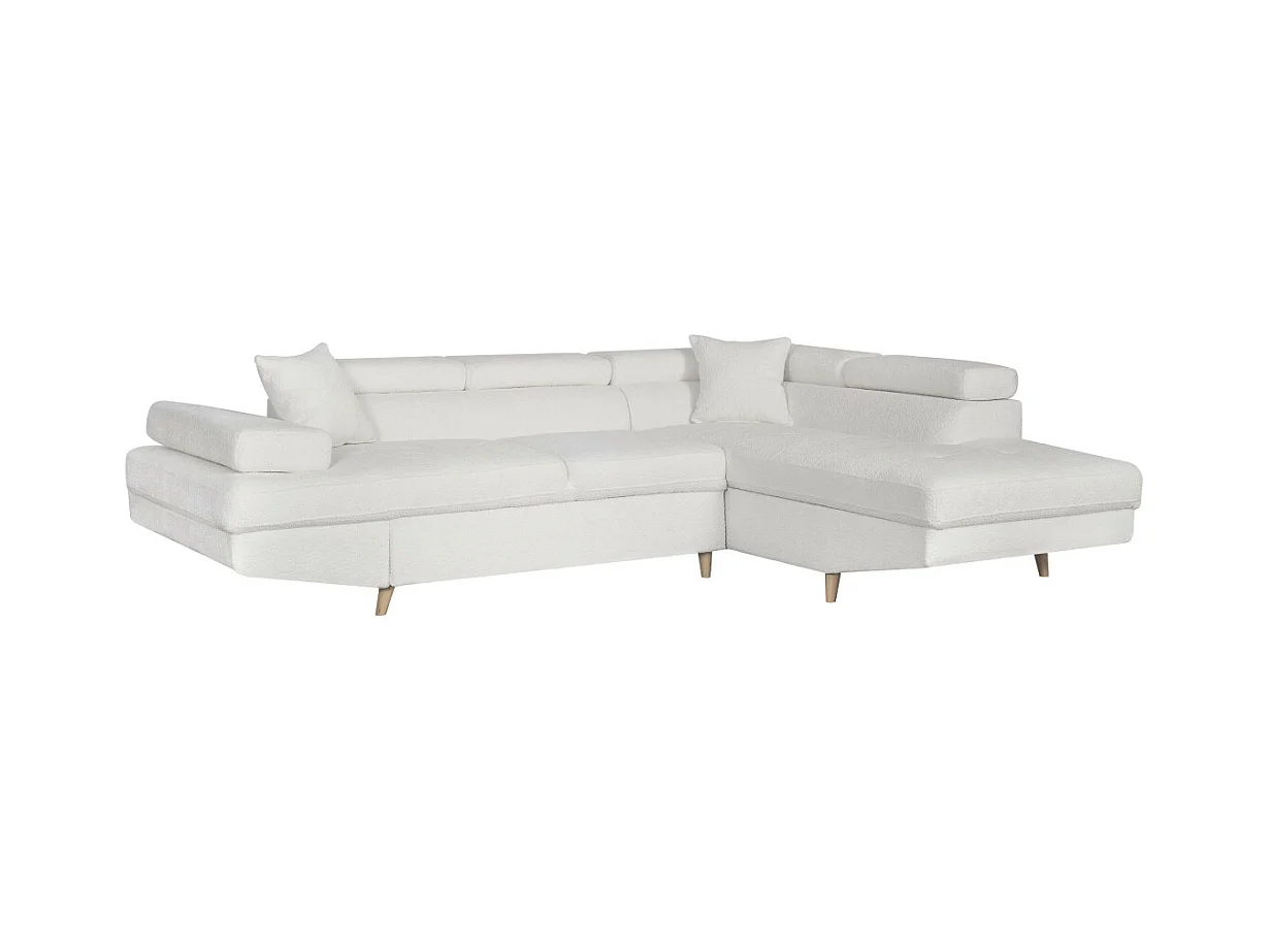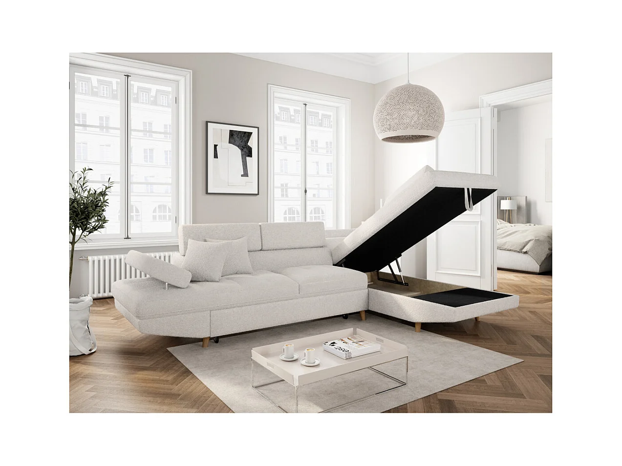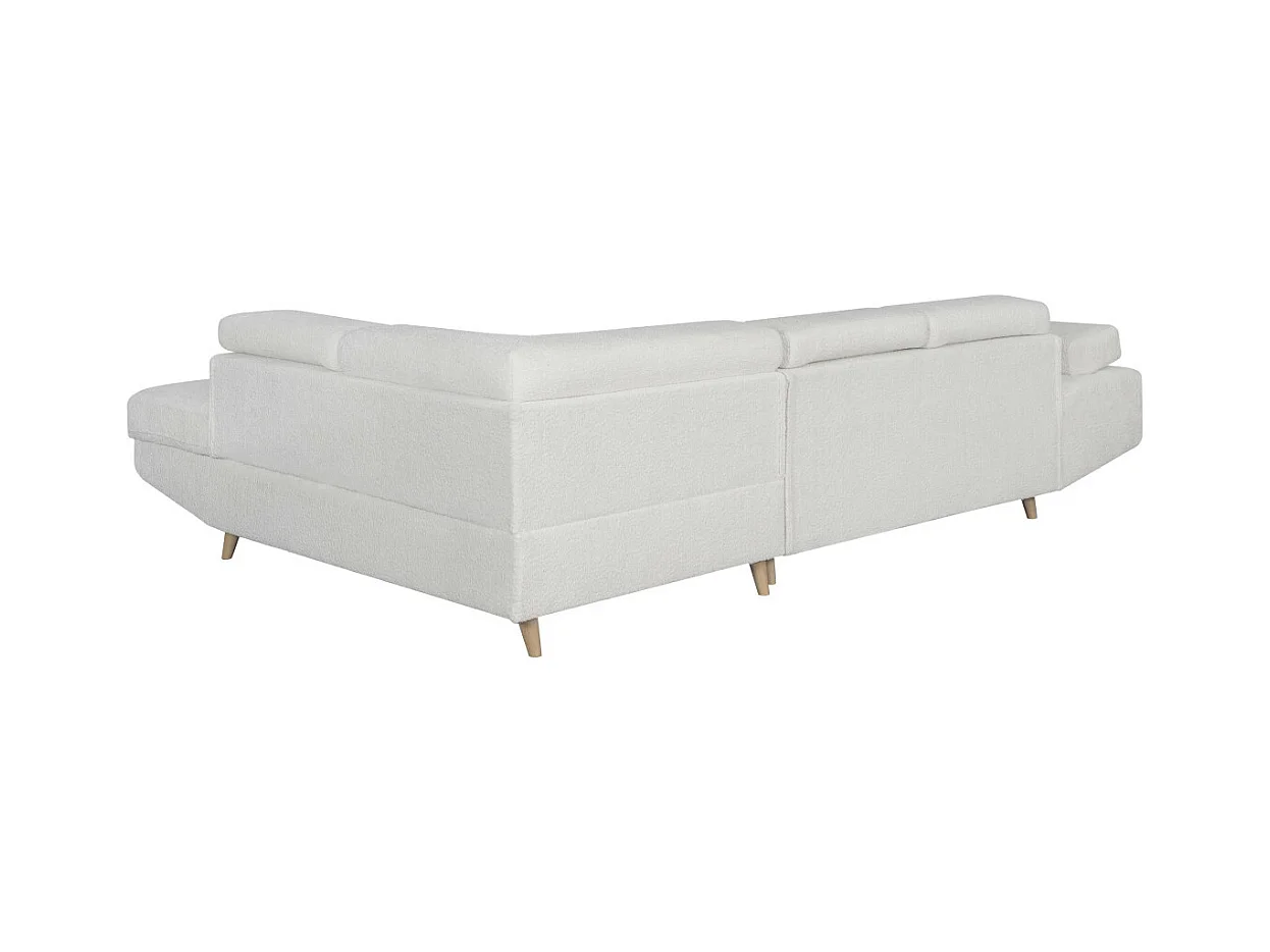 Canapé d'angle droit convertible Rio Scandinave avec coffre en tissu bouclette - Blanc, Pied bois - L271 x P192 x H70cm - Loungitude