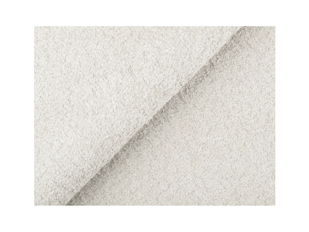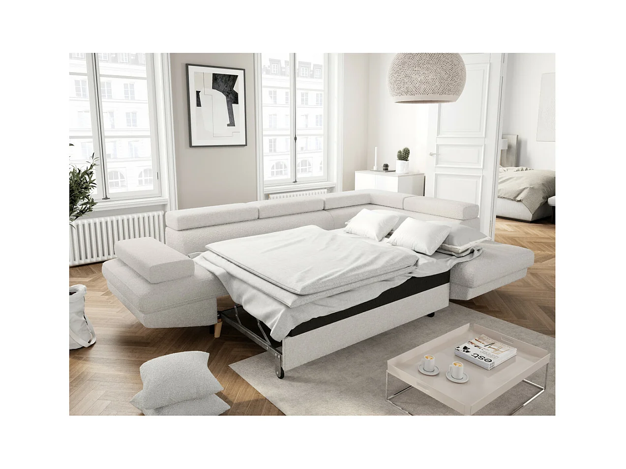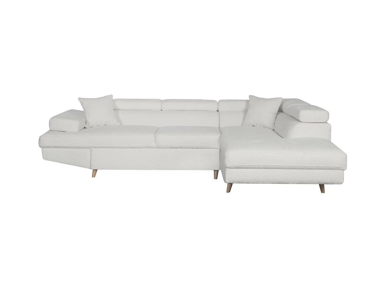 Canapé d'angle droit convertible Rio Scandinave avec coffre en tissu bouclette - Blanc, Pied bois - L271 x P192 x H70cm - Loungitude