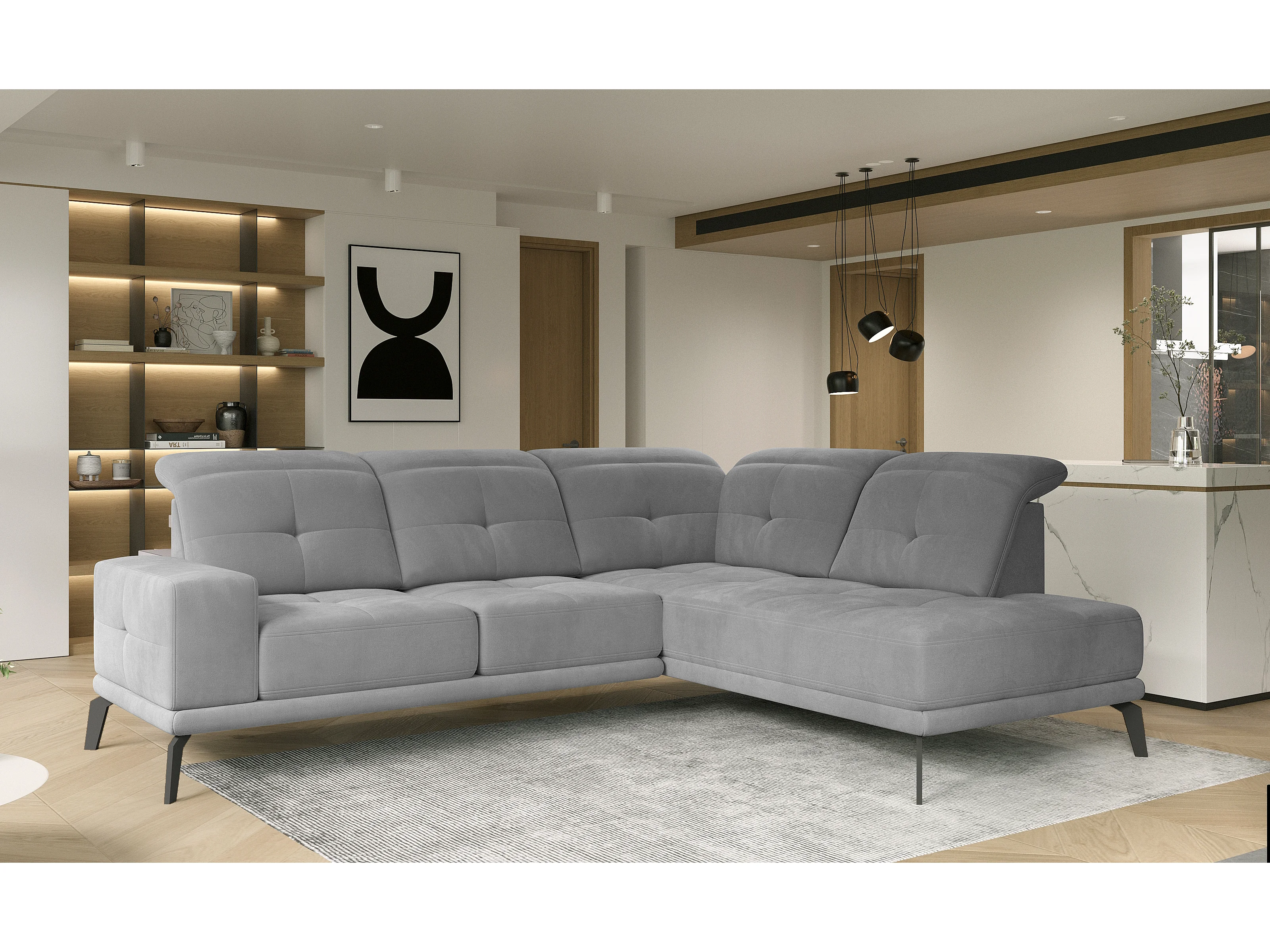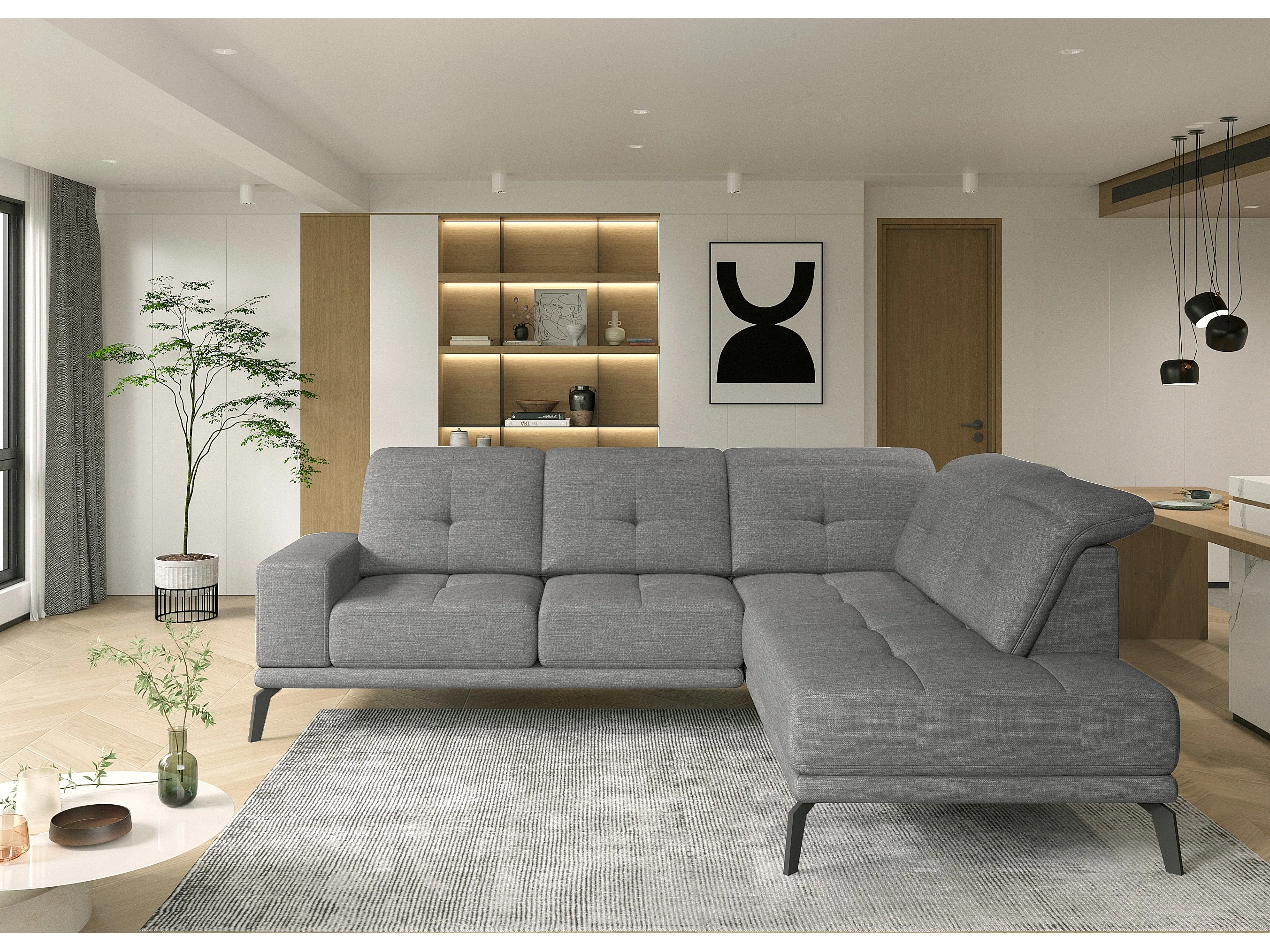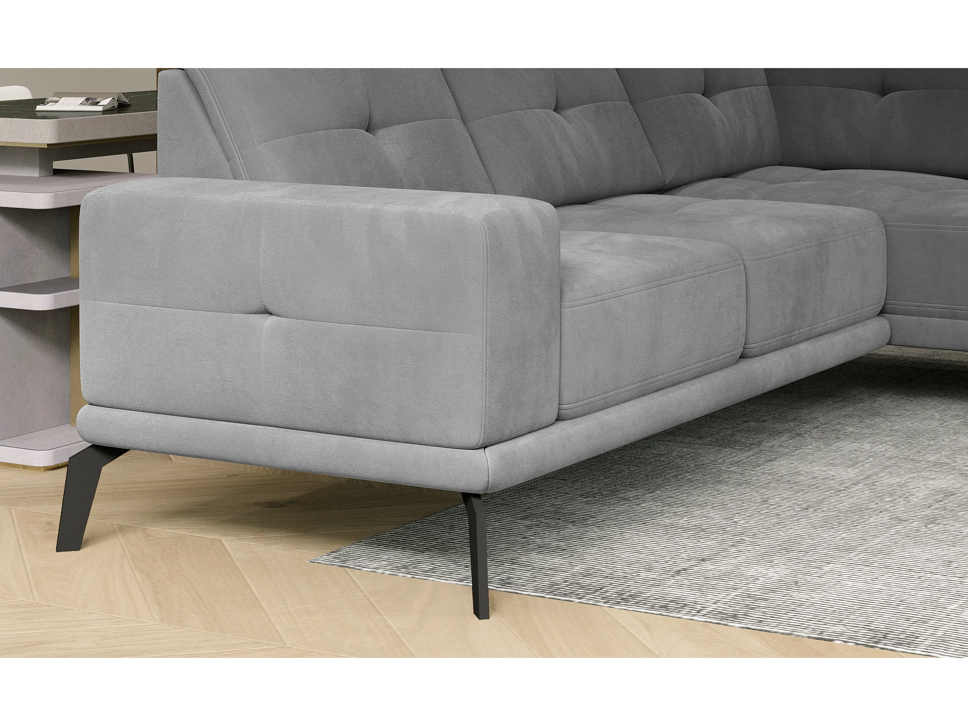 Canapé d'angle droit design matelassé tissu gris clair chiné et pied noir Kazane 275cm