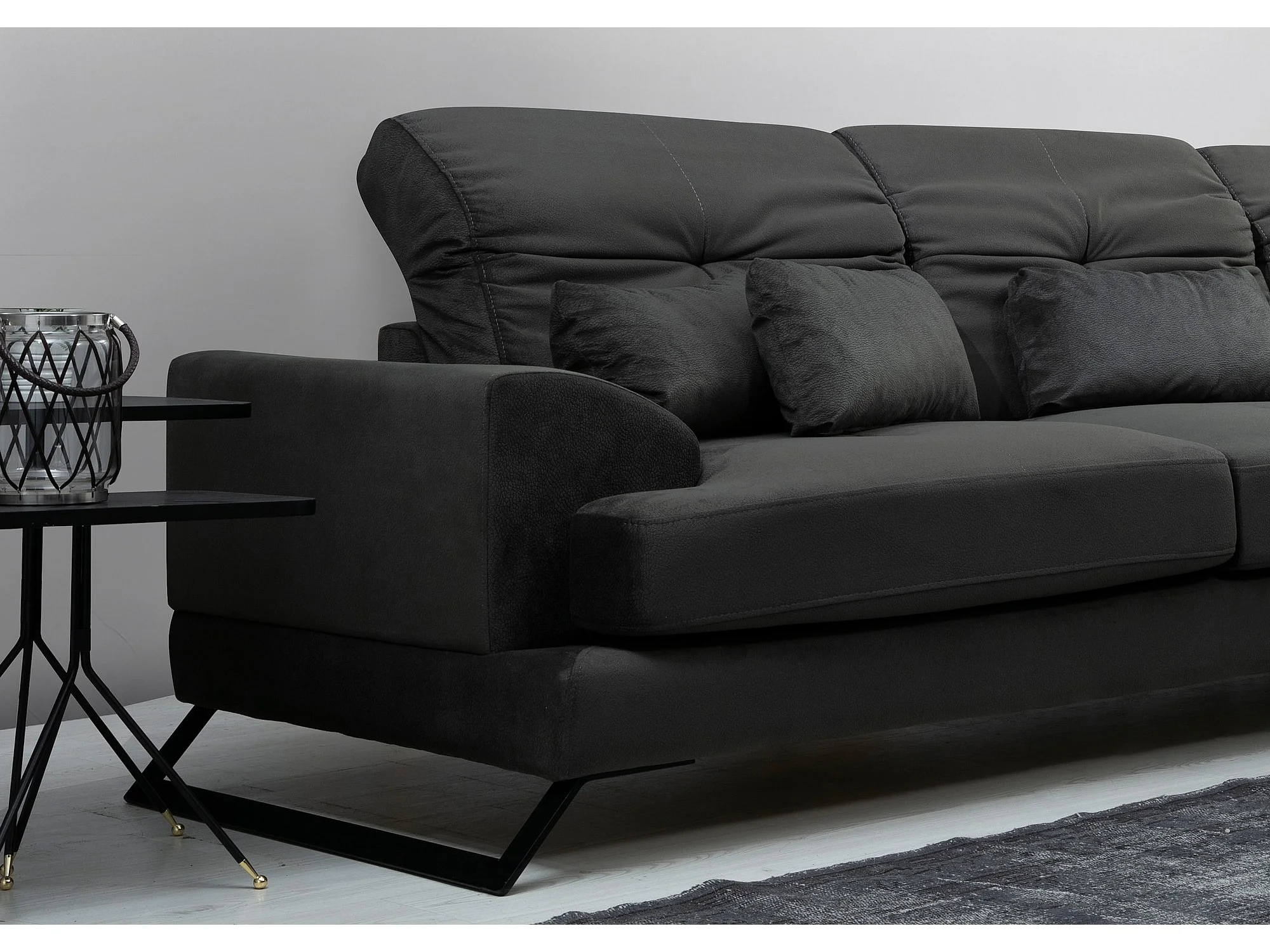 Canapé d'angle droit velours anthracite avec têtières relevables et pieds metal noir Briko 308cm