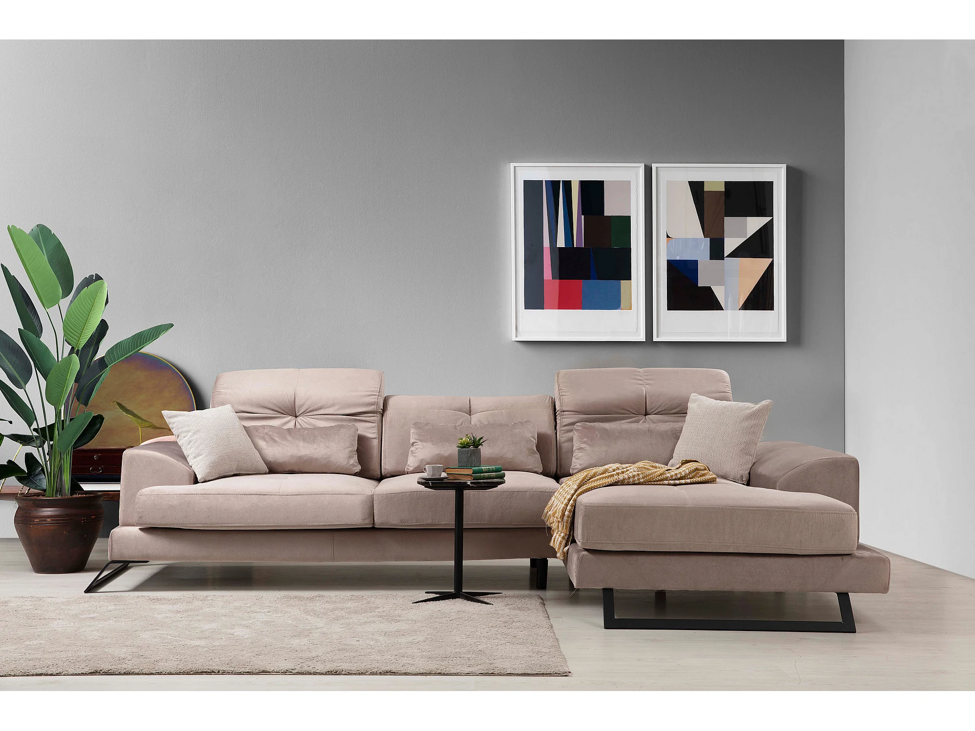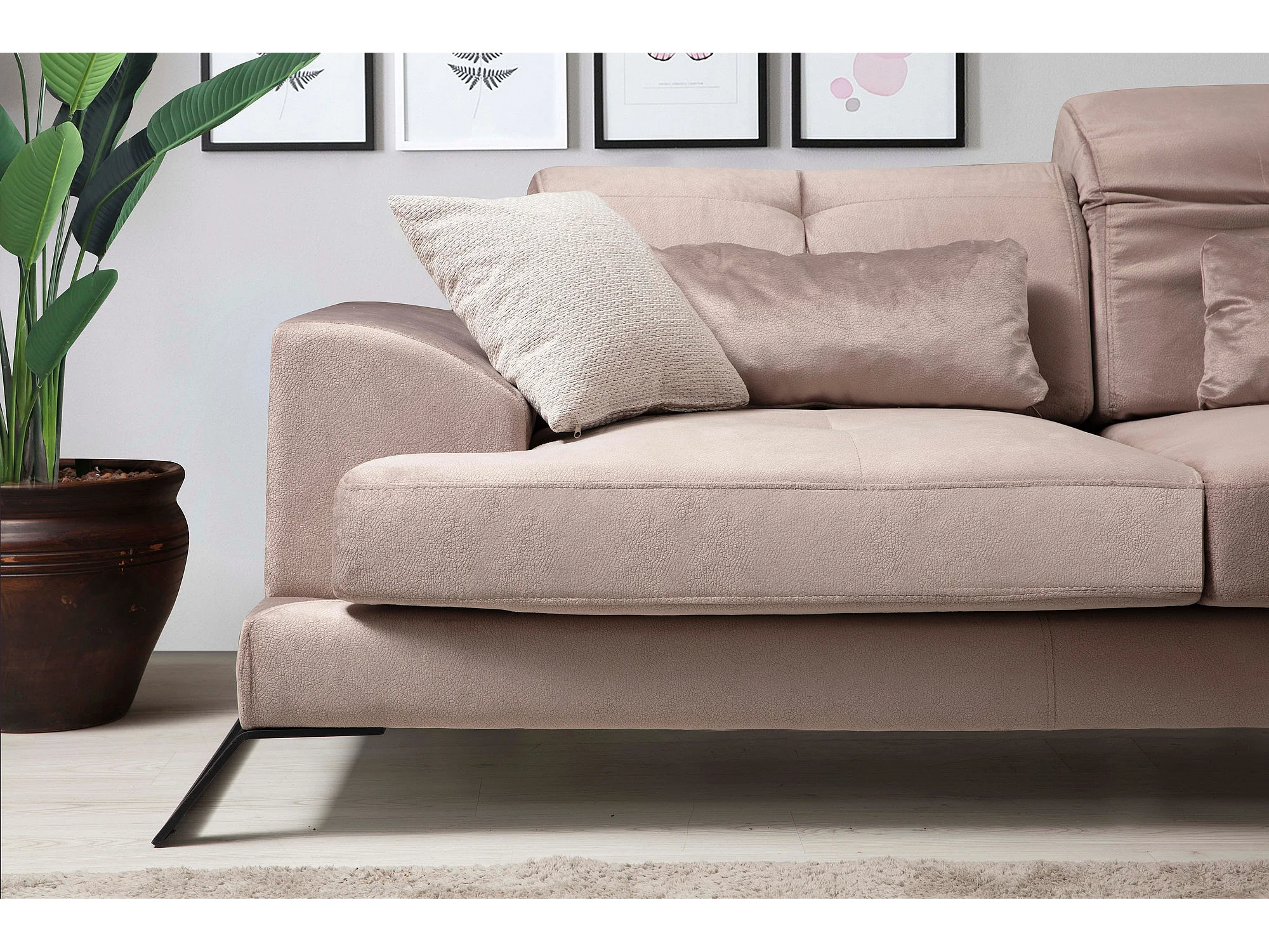 Canapé d'angle droit velours beige avec têtières relevables et pieds metal noir Briko 308cm