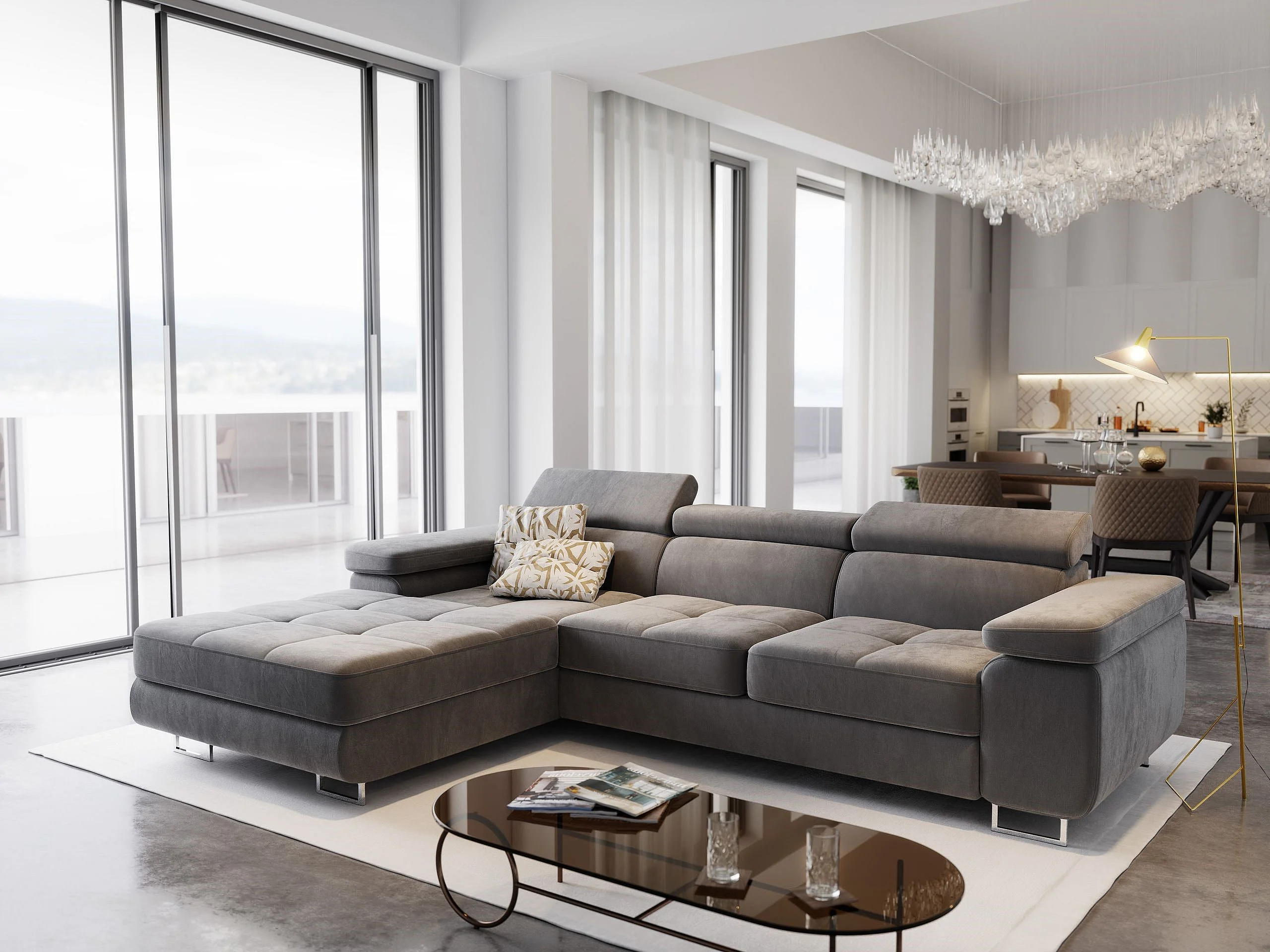 Canapé d'angle ELMA Gris en velours avec fonction de couchage