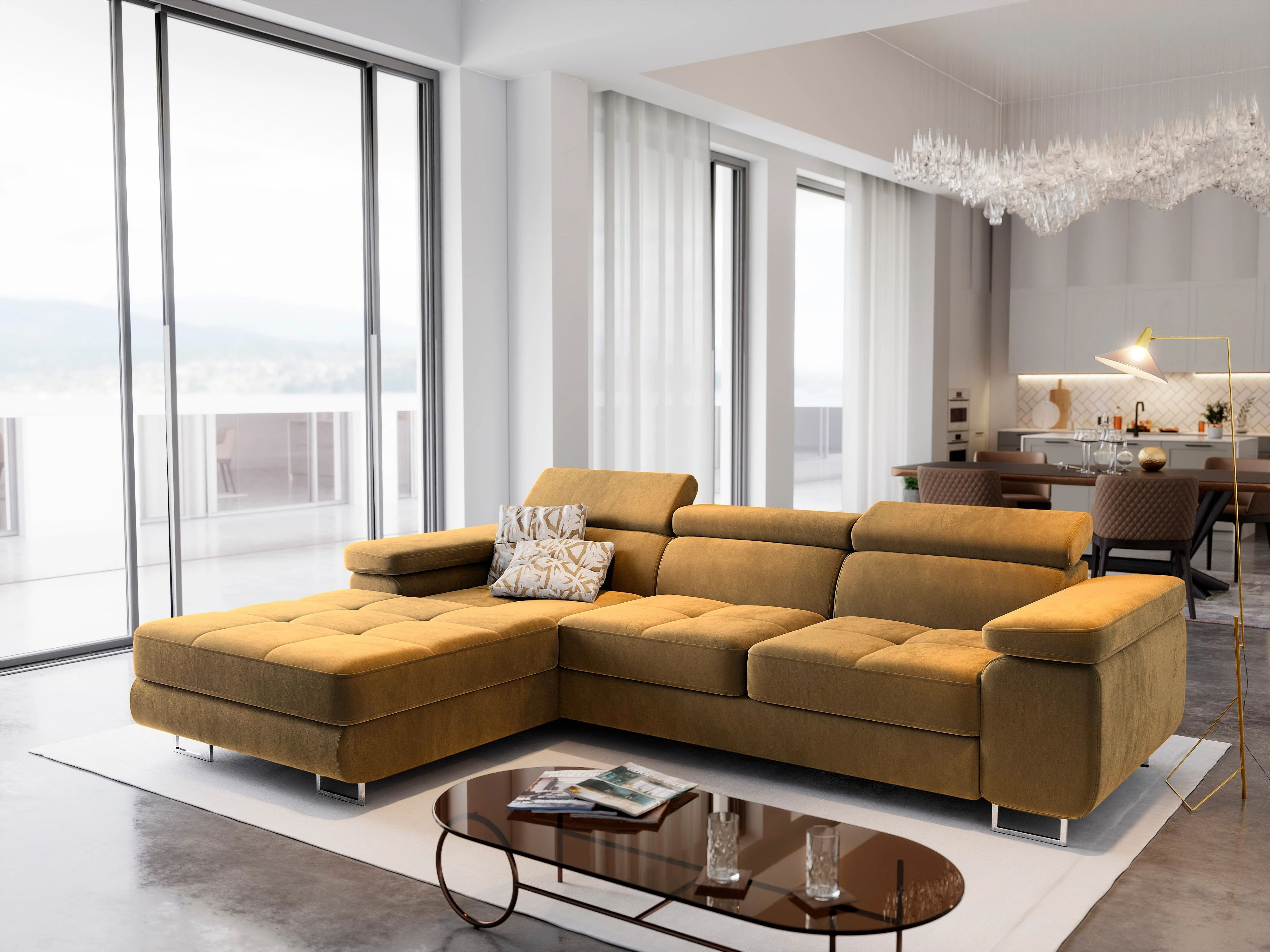 Canapé d'angle ELMA Jaune en velours avec fonction de couchage