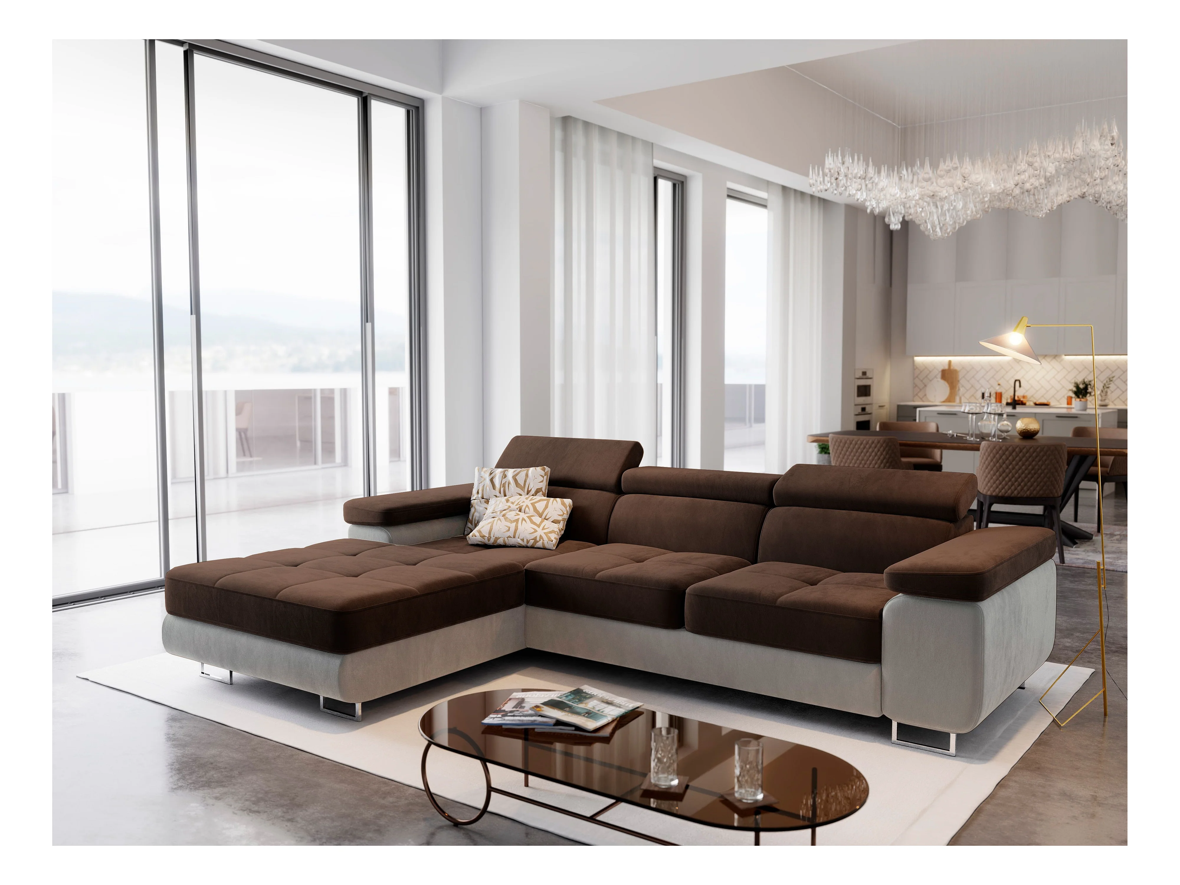 Canapé d'angle ELMA Marron en velours avec fonction de couchage