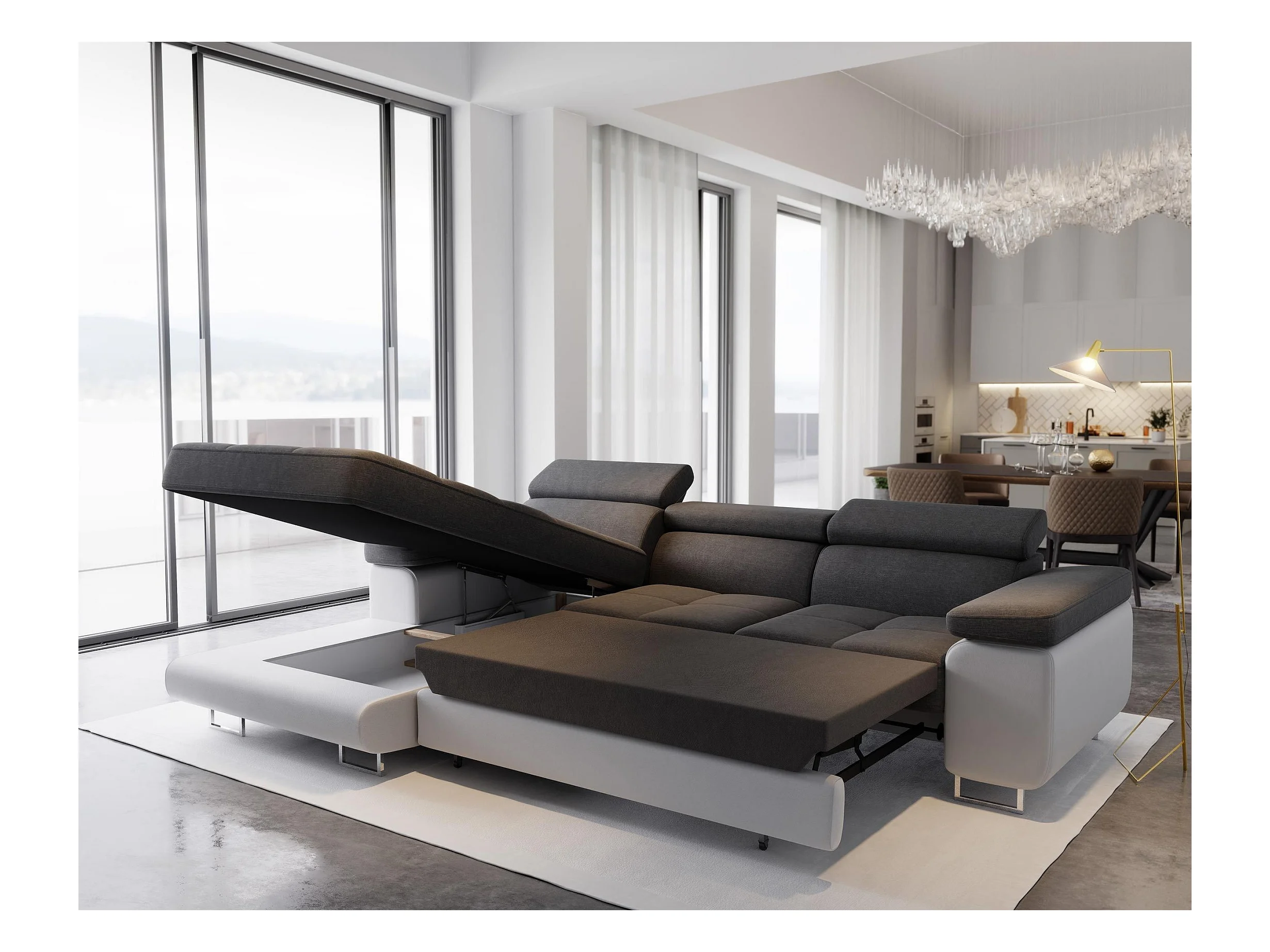 Canapé d'angle ELMA Noir en velours avec fonction de couchage