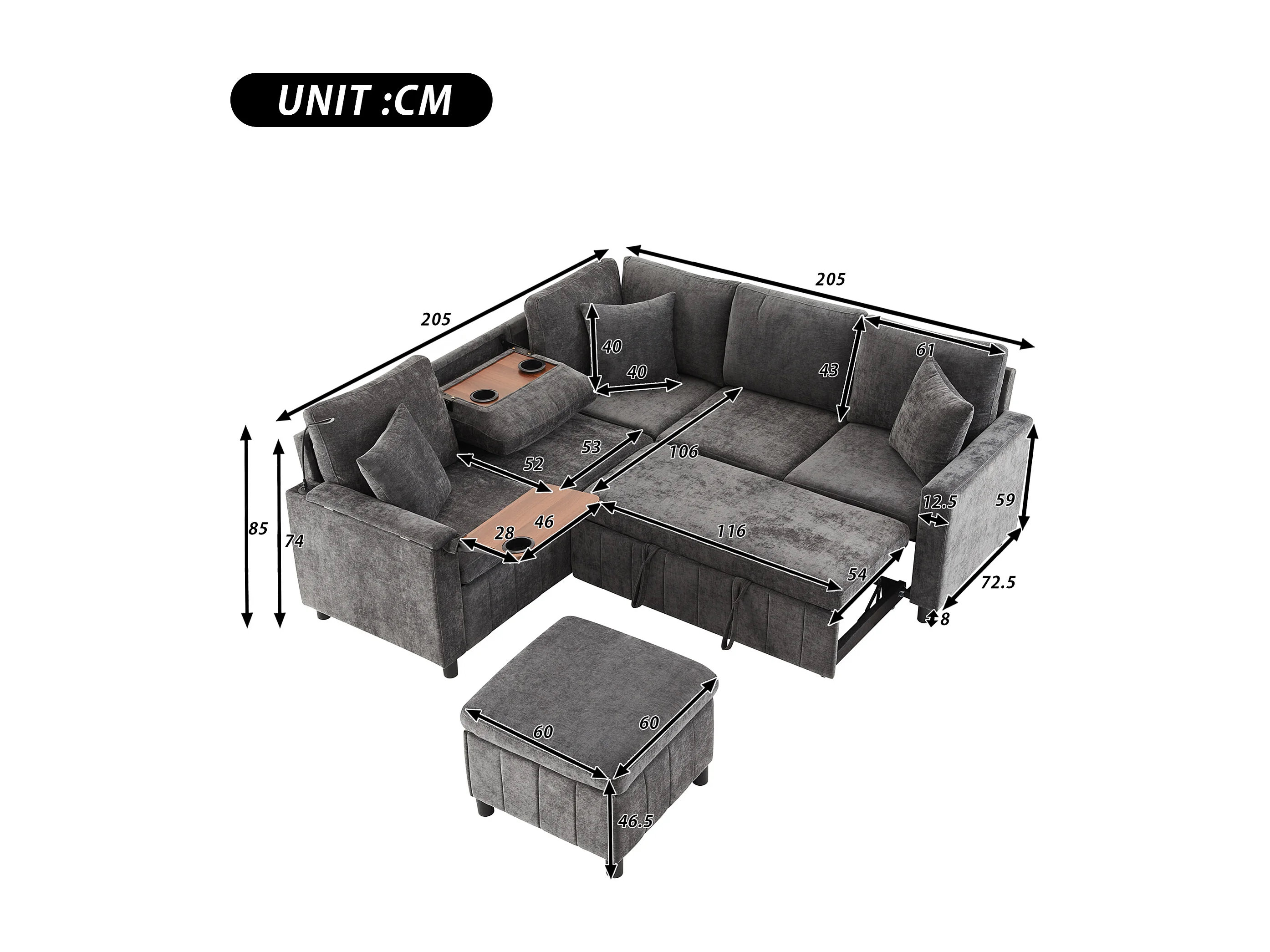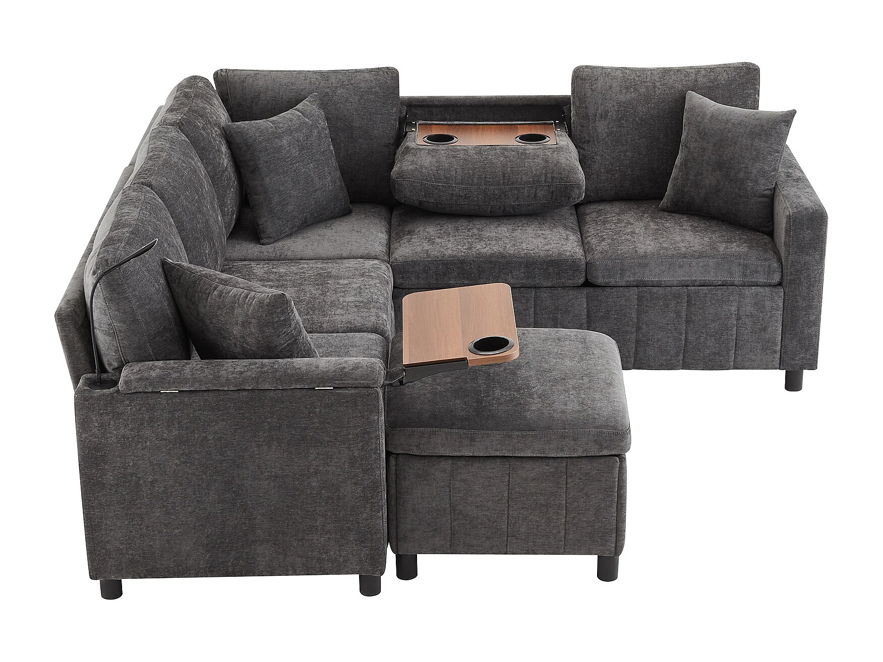 Canapé d'angle en chenille - avec fonction sommeil - avec USB, Type-C et lampe de lecture - dossier pliable avec deux porte-gobelets - avec tabouret - Gris
