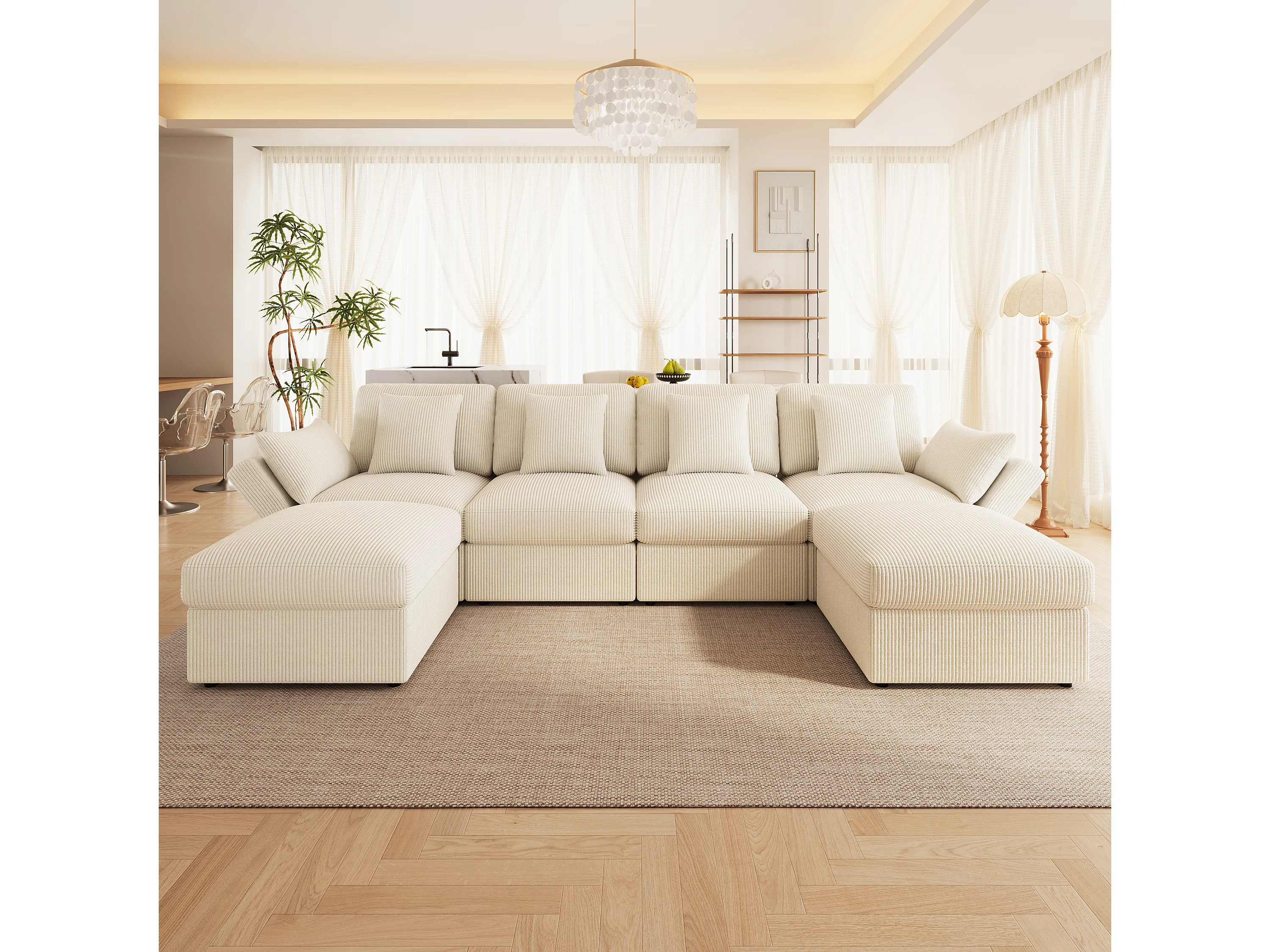 Canapé d'angle en forme de U 6 places - 290 x 159.5 x 89 cm - avec accoudoirs réglables + pouf amovible - velours - beige