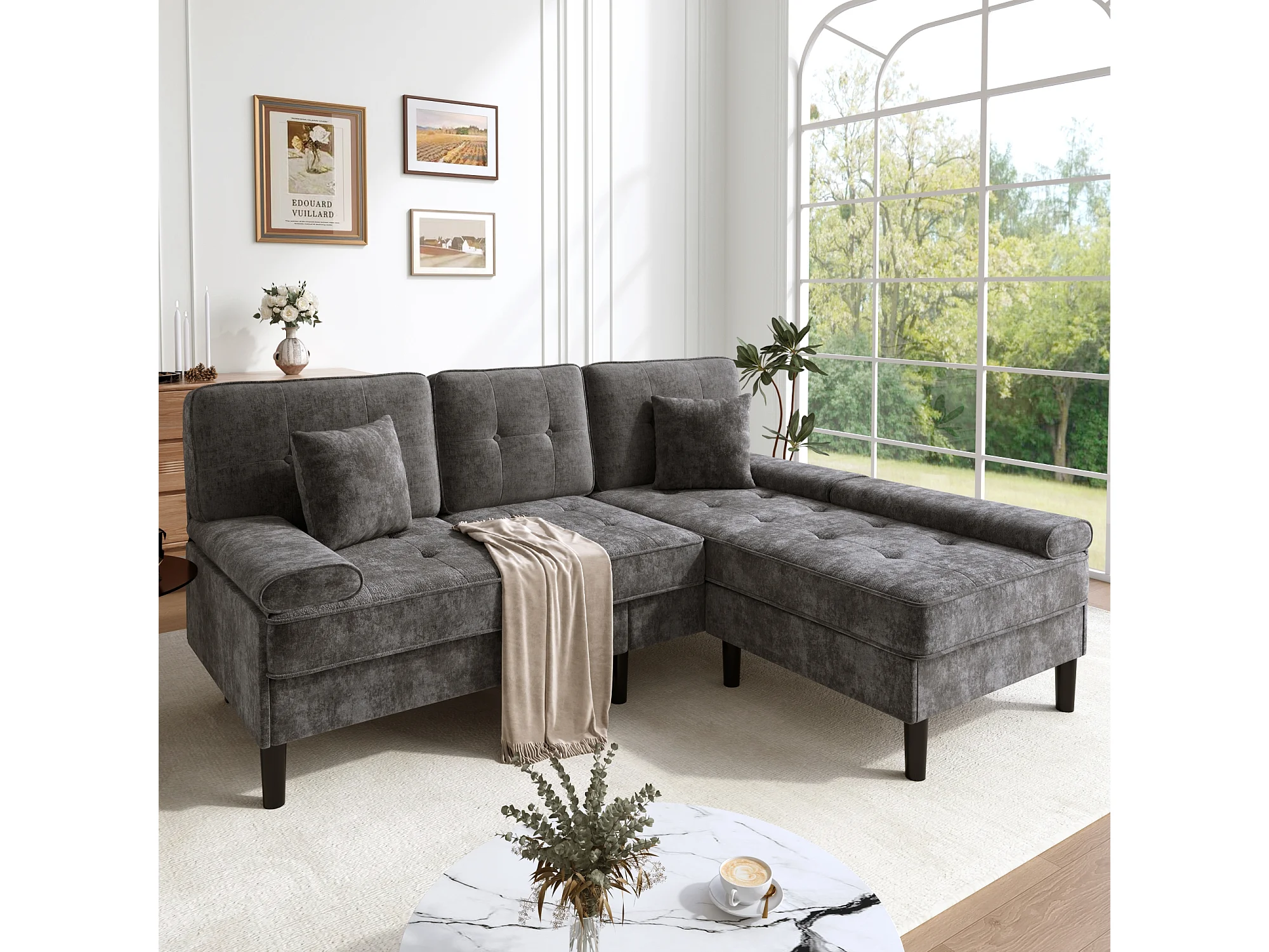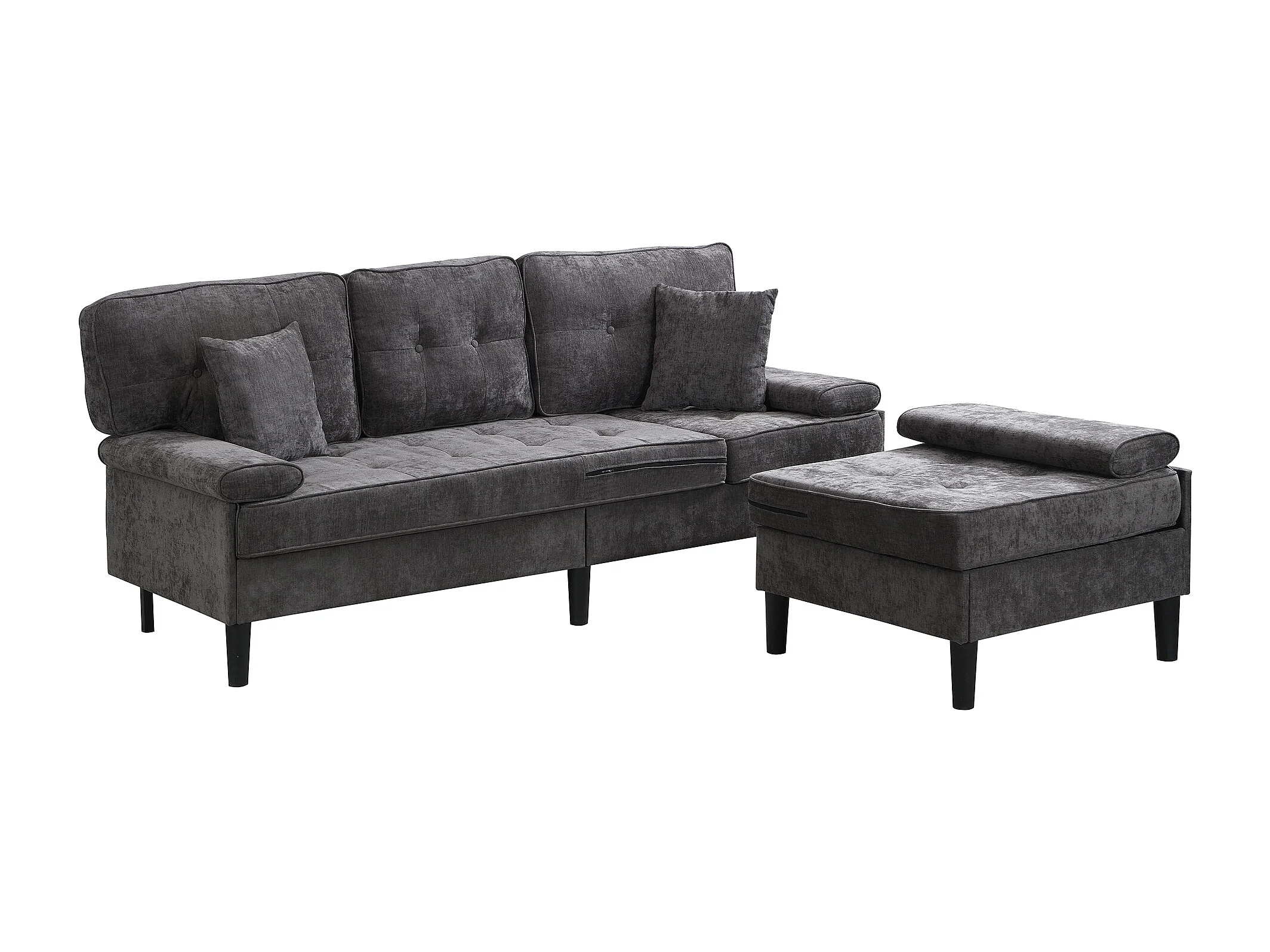 Canapé d'angle en L 3 places - avec 2 coussins - Pouf amovible - Tissu chenille - Gris