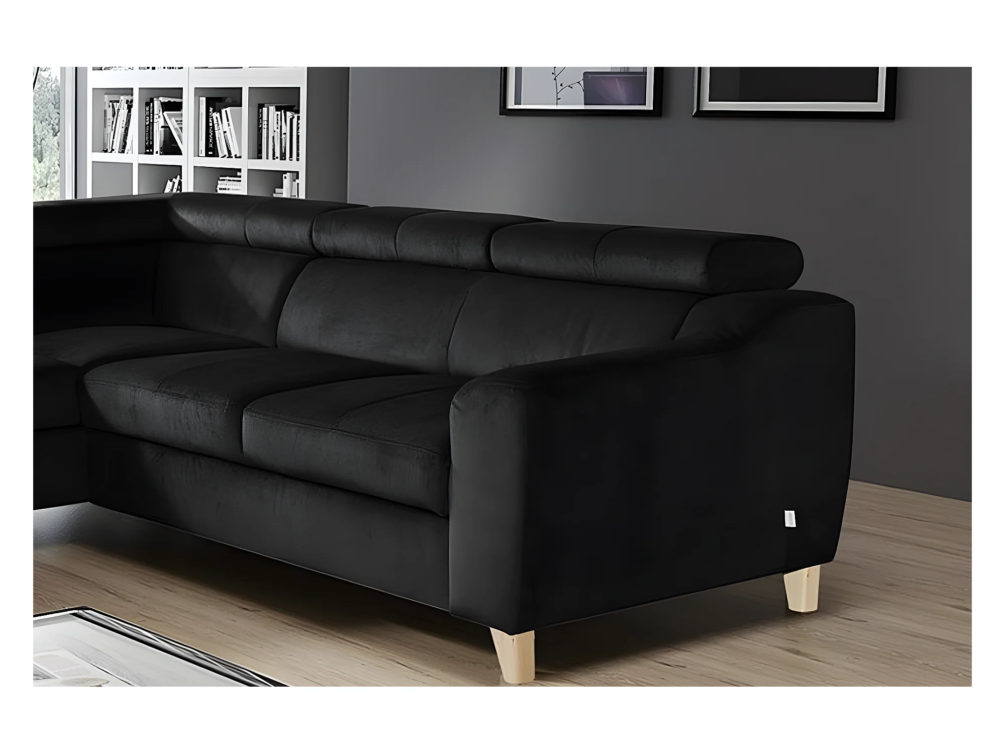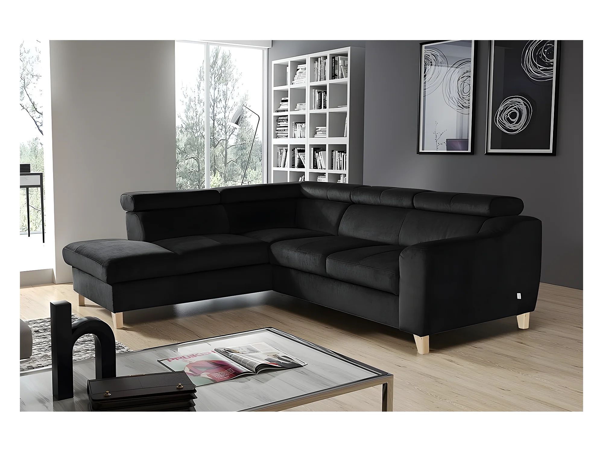 Canapé d'angle en tissu luxe 5 places, ASHLEY, noir, angle gauche (vu de face)
