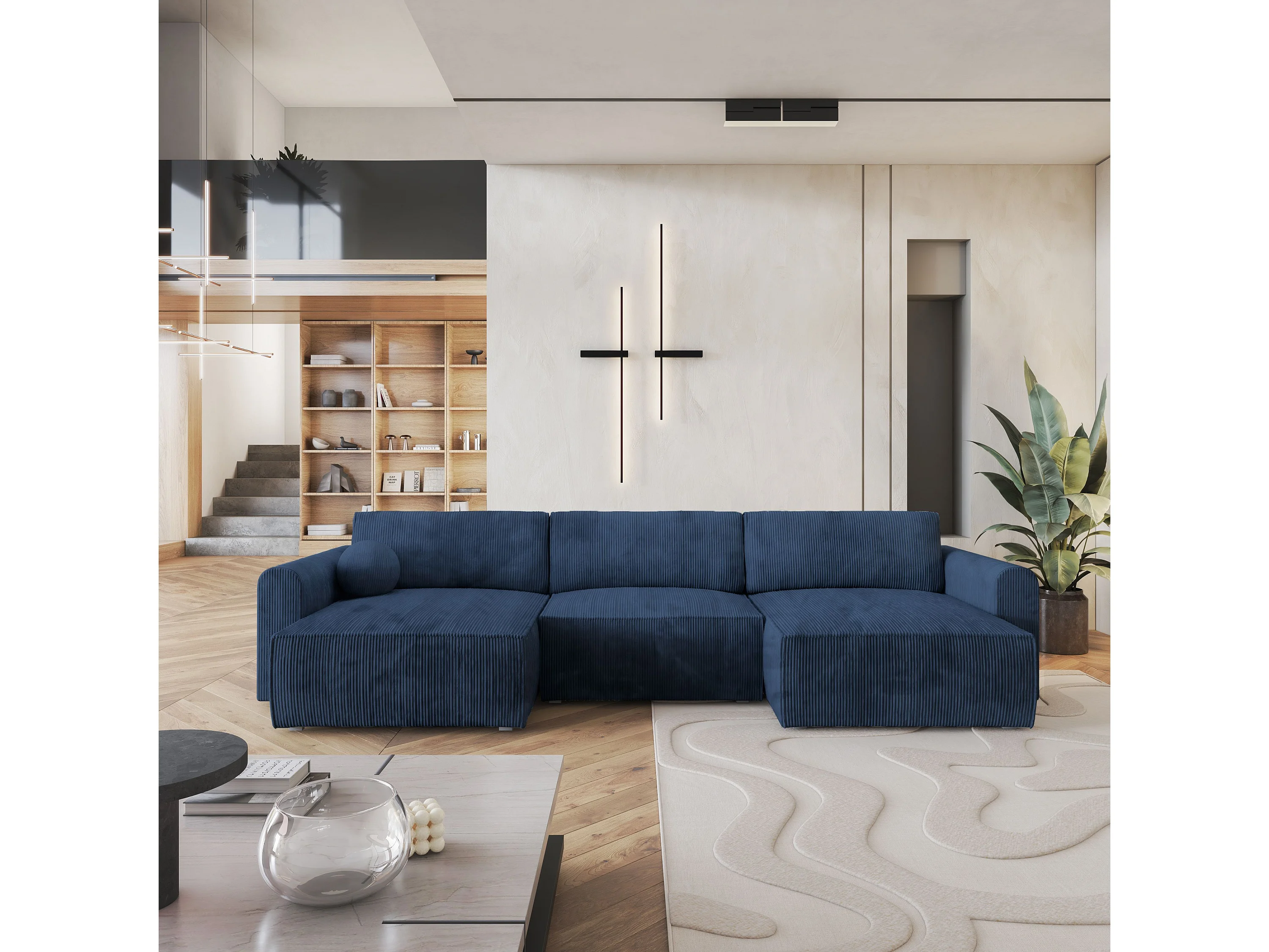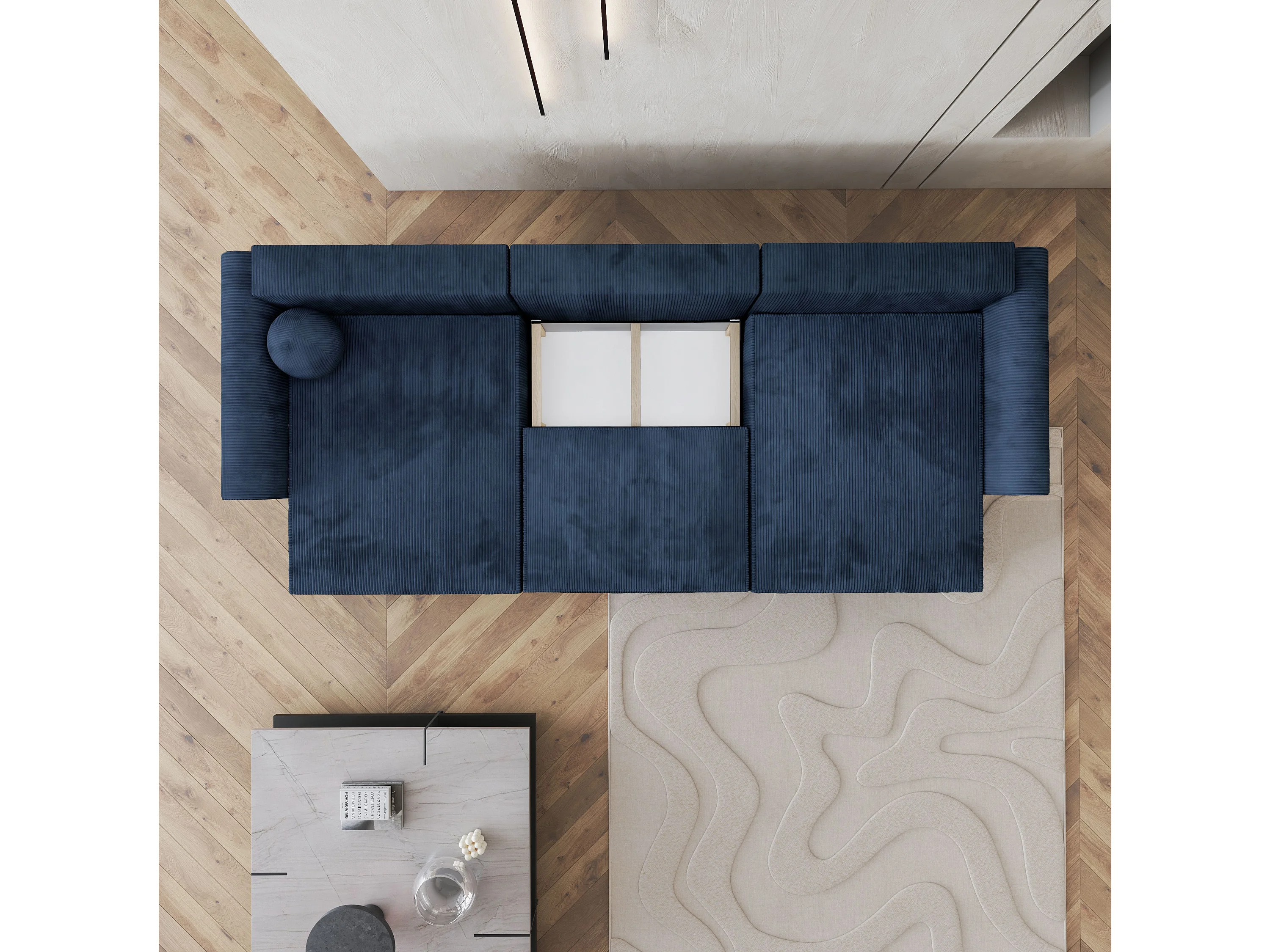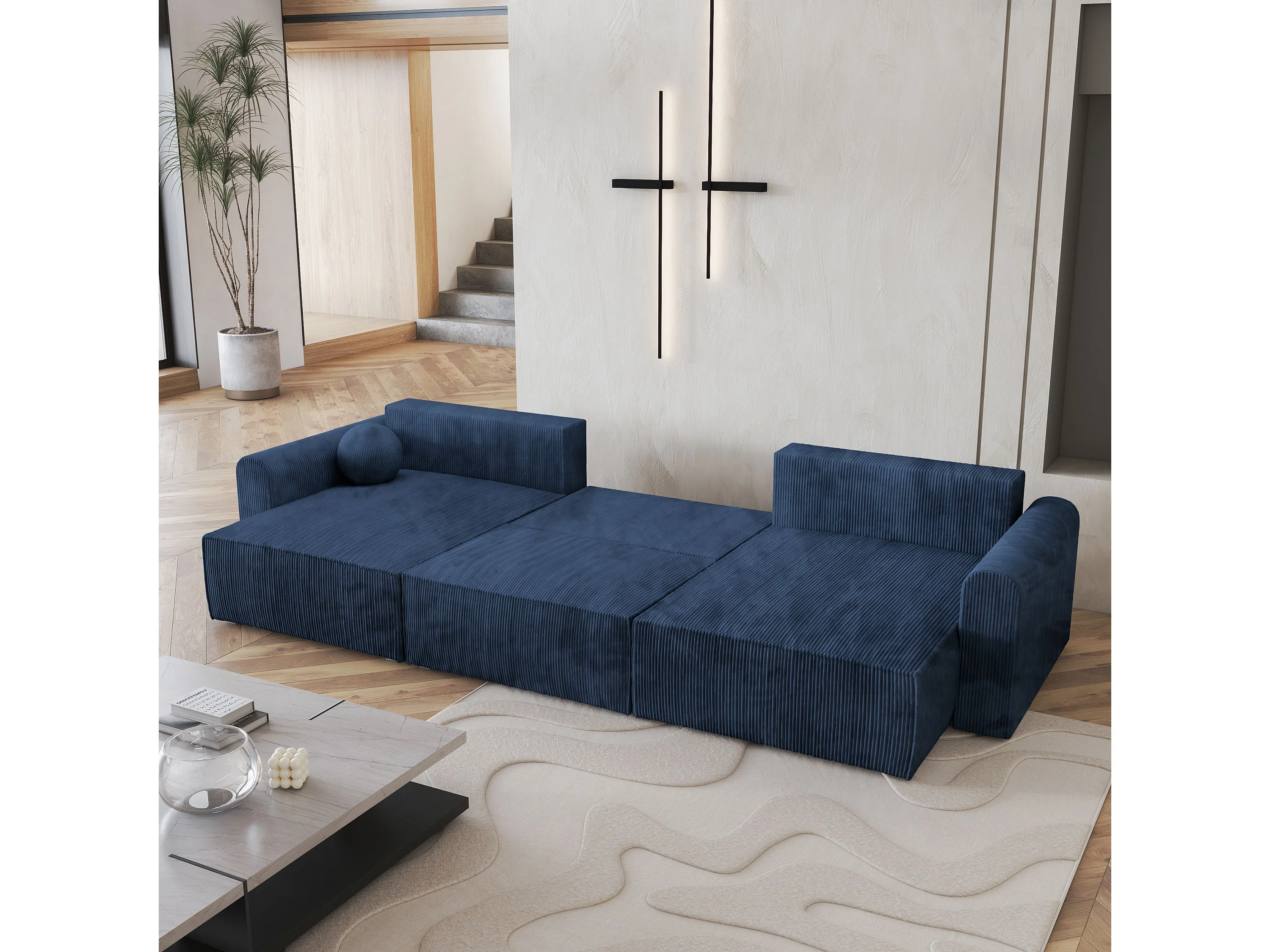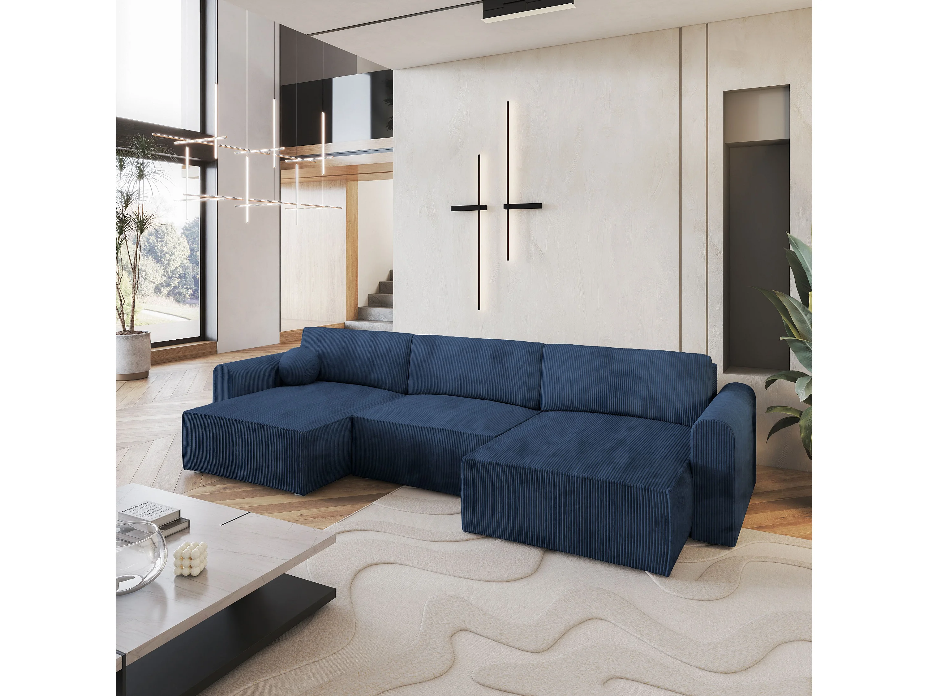 Canapé d'angle FENTO Bleu en velours côtelé avec fonction de couchage
