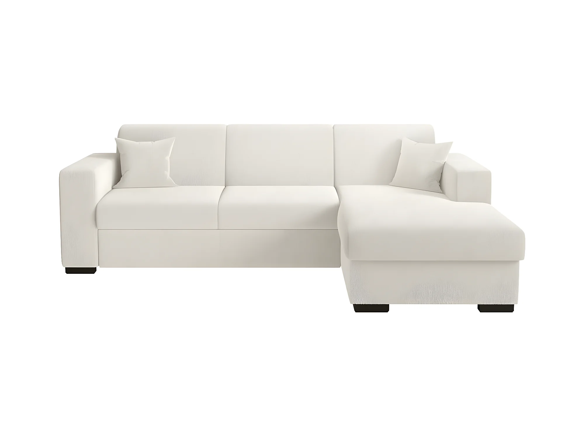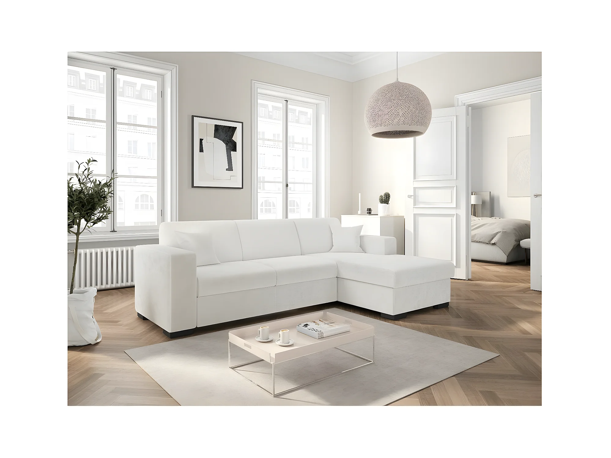 Canapé d'angle droit 4 places Fuji XL convertible avec coffre en tissu bouclette - Blanc - L262 x P157 x H83cm - Loungitude