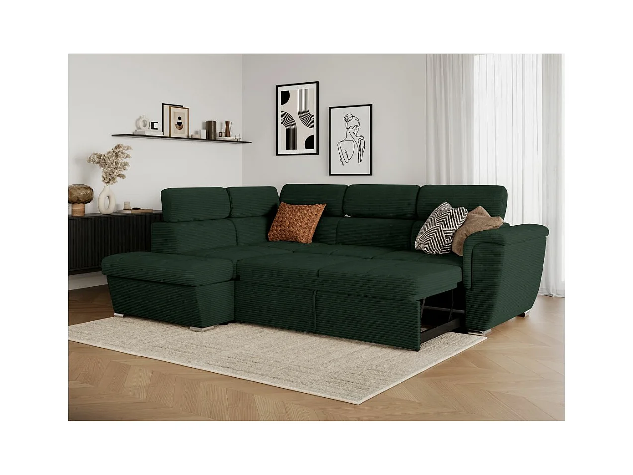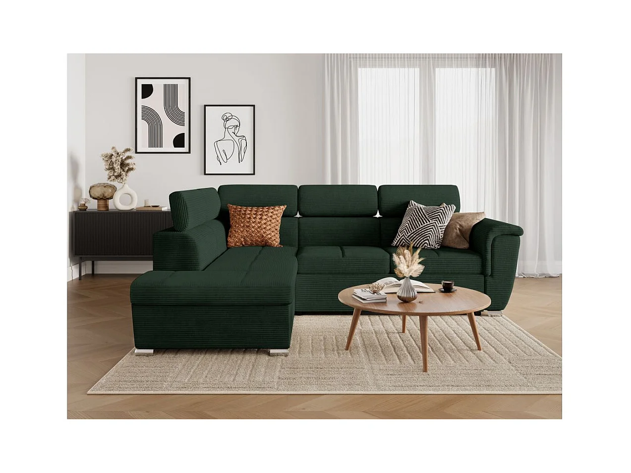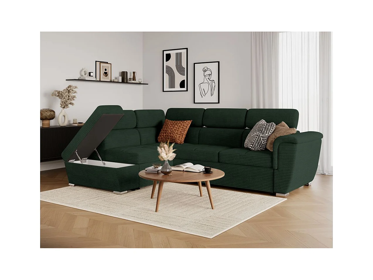 Canapé d'angle gauche 4 places Paola convertible avec coffre en velours côtelé - Vert foncé - L252 x P188 x H76cm - Loungitude